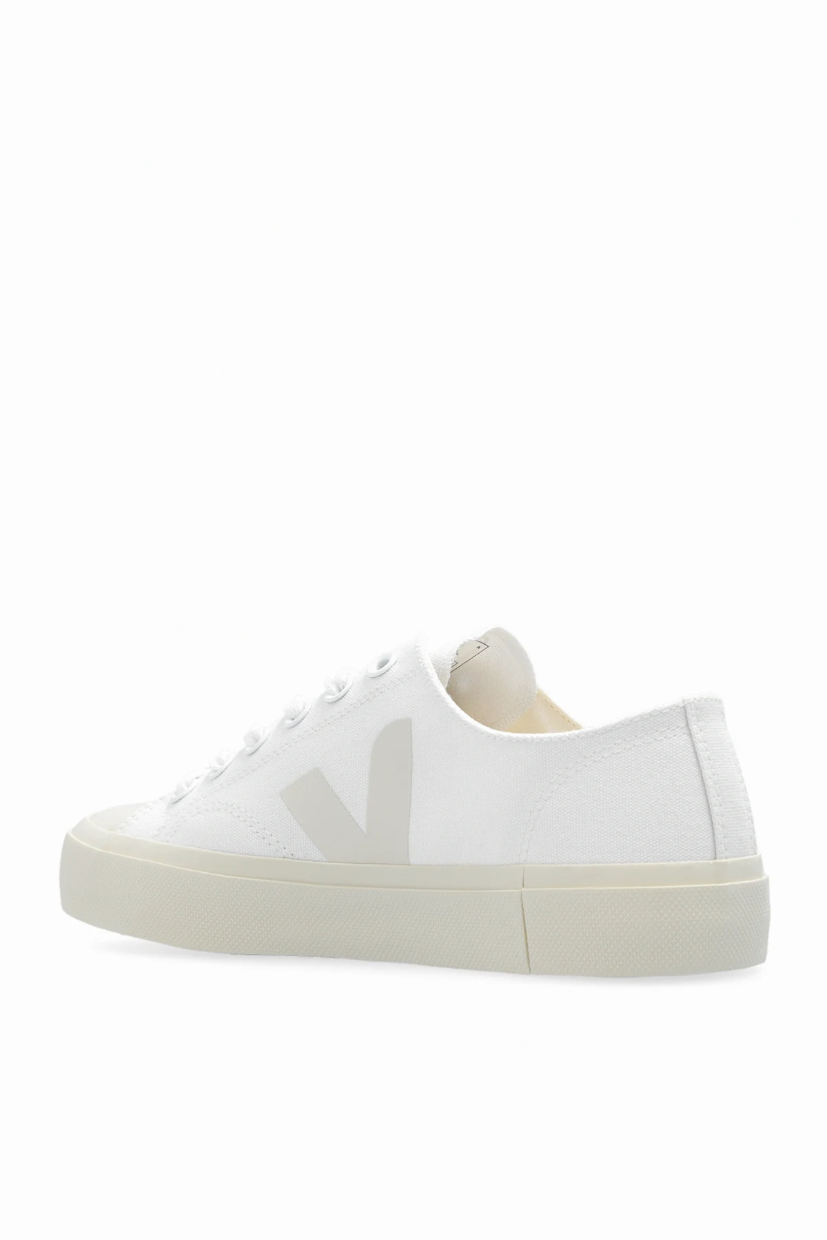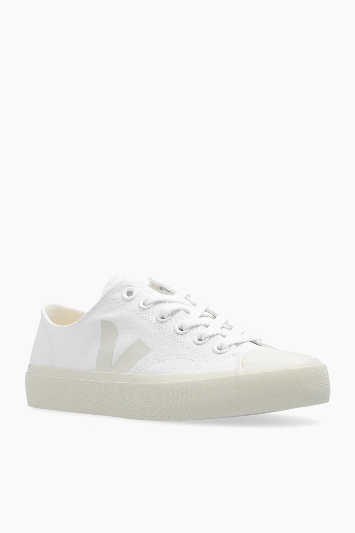 Biało-kremowe, sznurowane buty sportowe, model ‘Wata II Low’ Veja. Wykonane z bawełny organicznej. Ozdobione logo nadrukowanym metodą sitodruku na bazie wody. Wkładka wykonana z kauczuku amazońskiego, trzciny cukrowej, przetworzonej pianki EVA i bawełny organicznej. Kremowa podeszwa z gumy amazońskiej i odpadów ryżowych.