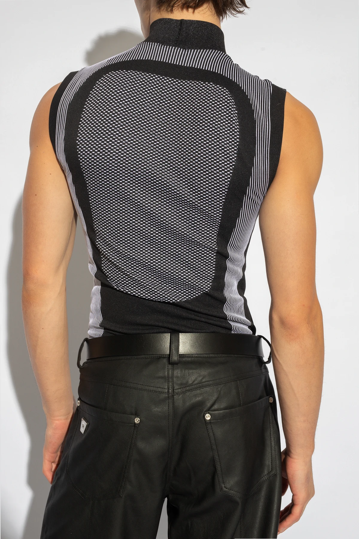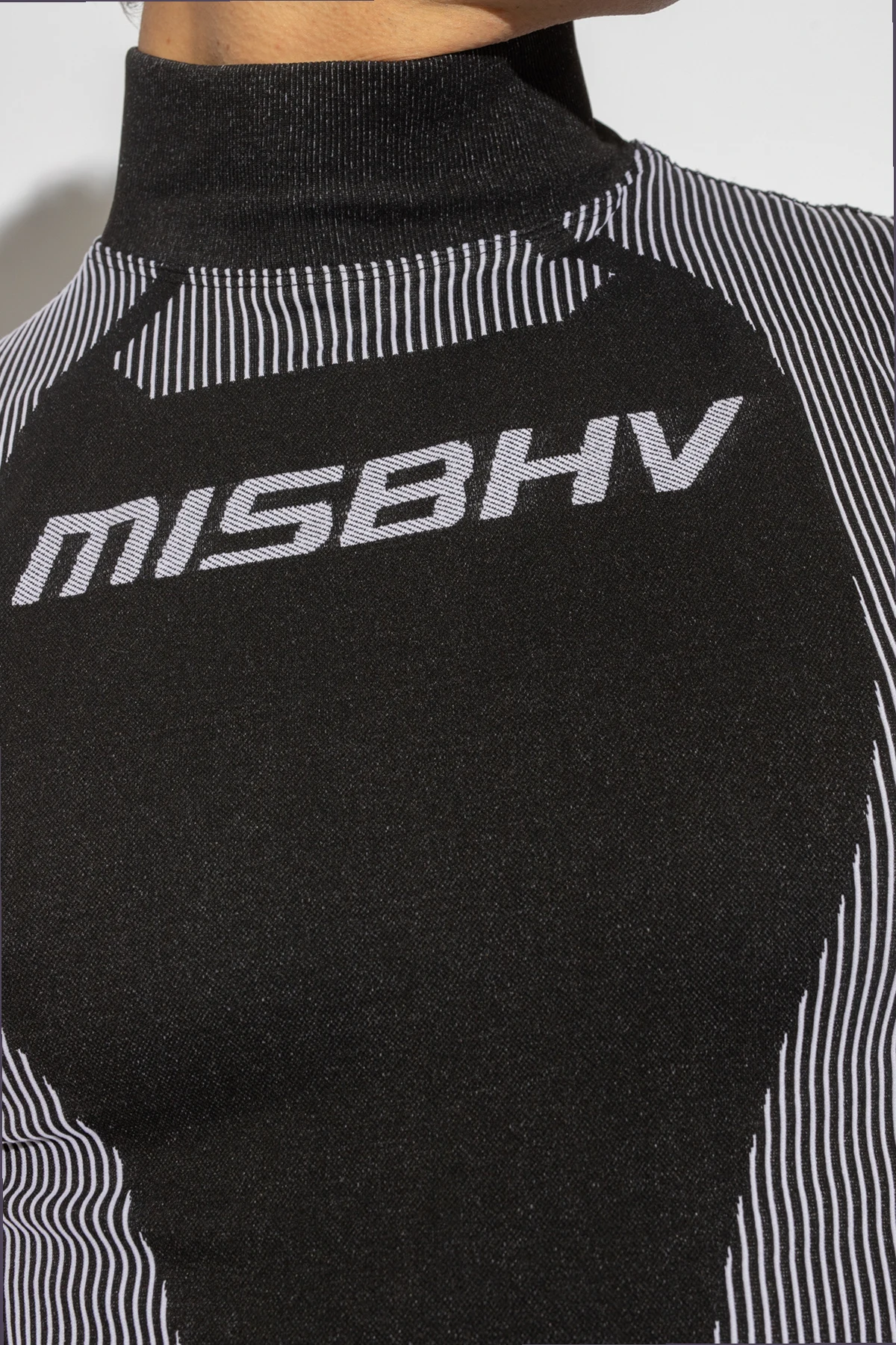 Czarno-biały top bez rękawów, model ‘Sport Active’ MISBHV. Wykonany z oddychającego materiału termoaktywnego o sylwetce przylegającej do ciała. 55% przędzy pochodzi z recyklingu. Ozdobiony wzorem z logo.