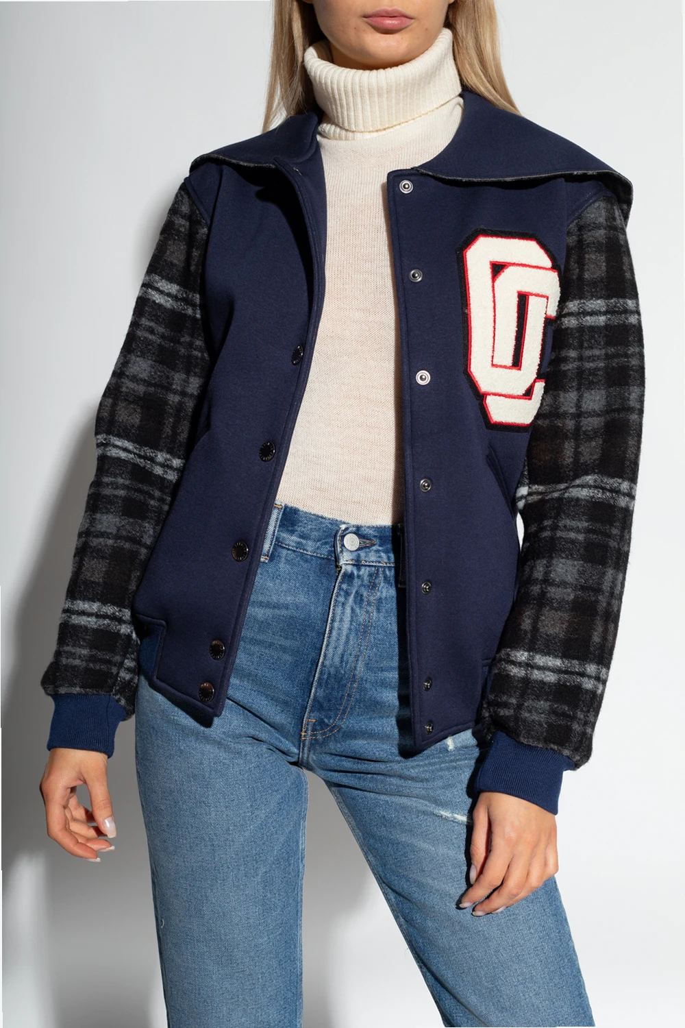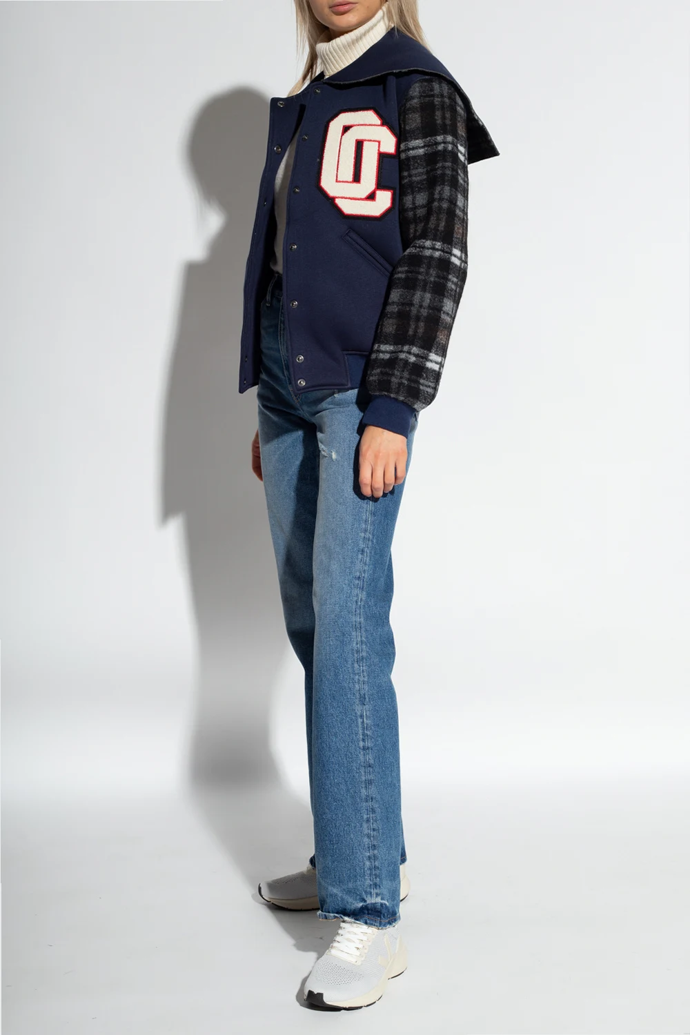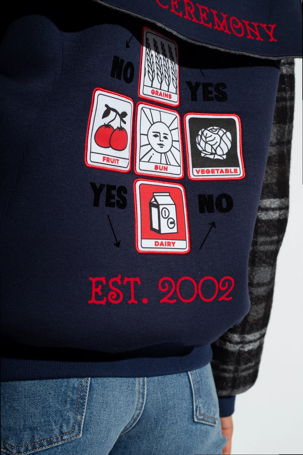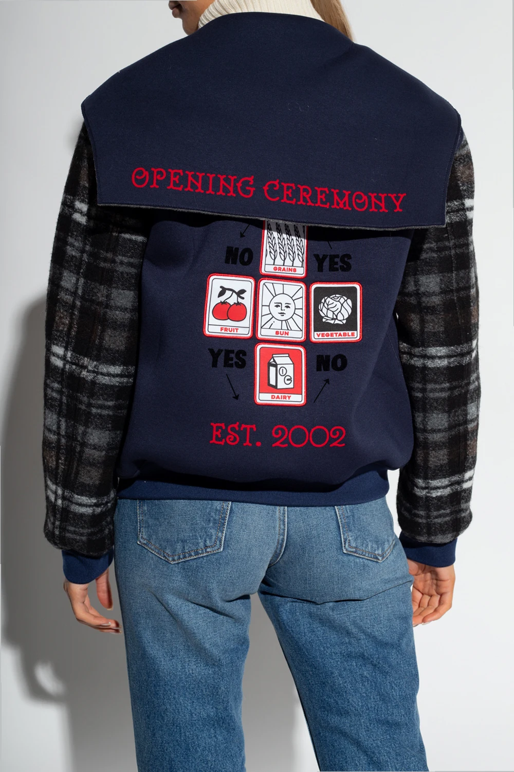 Granatowo-szaro-brązowa kurtka Opening Ceremony. Zapinana na zatrzaski. Z przodu naszywka z logo. Z tyłu kolorowe naszywki z motywem kart tarota. Dekolt wykończony peleryną z nadrukowanym logo o aksamitnym wykończeniu. Dwie wsuwane kieszenie. Długie, wełniane rękawy ozdobione wzorem w kratę oraz dół wykończone ściągaczem.