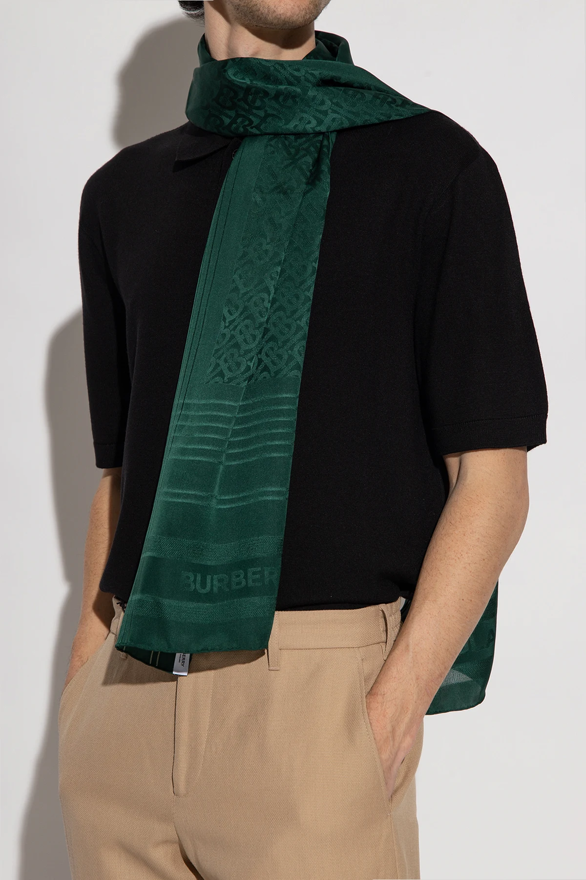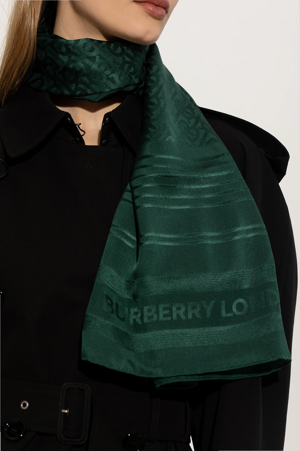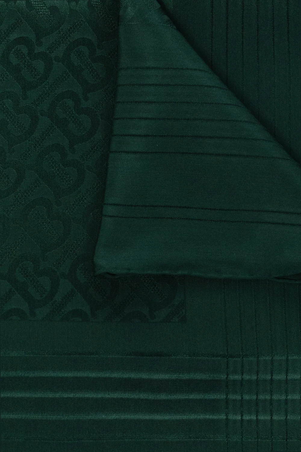 Ciemnozielony, jedwabny szal Burberry. Ozdobiony żakardowym wzorem z motywem kraty oraz monogramu. Ręcznie szyte brzegi.
