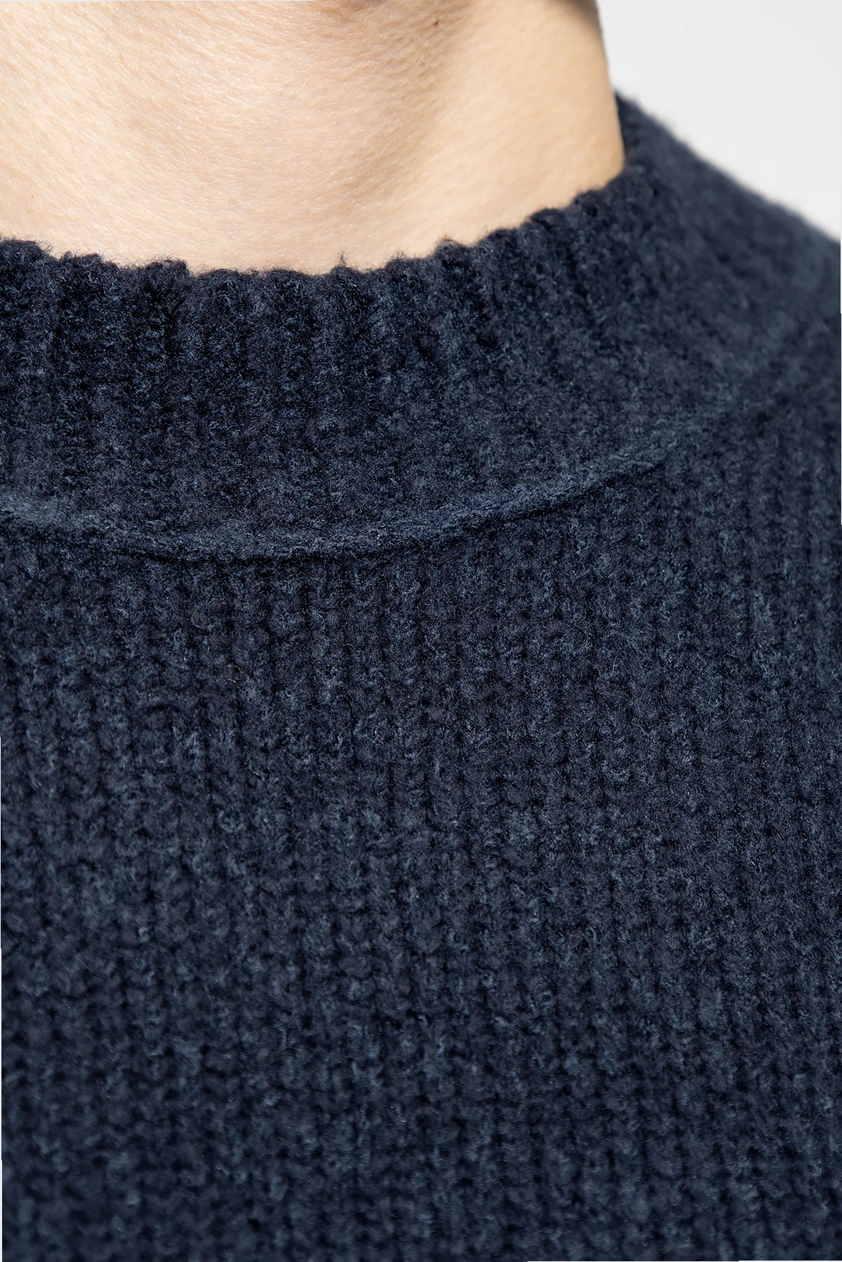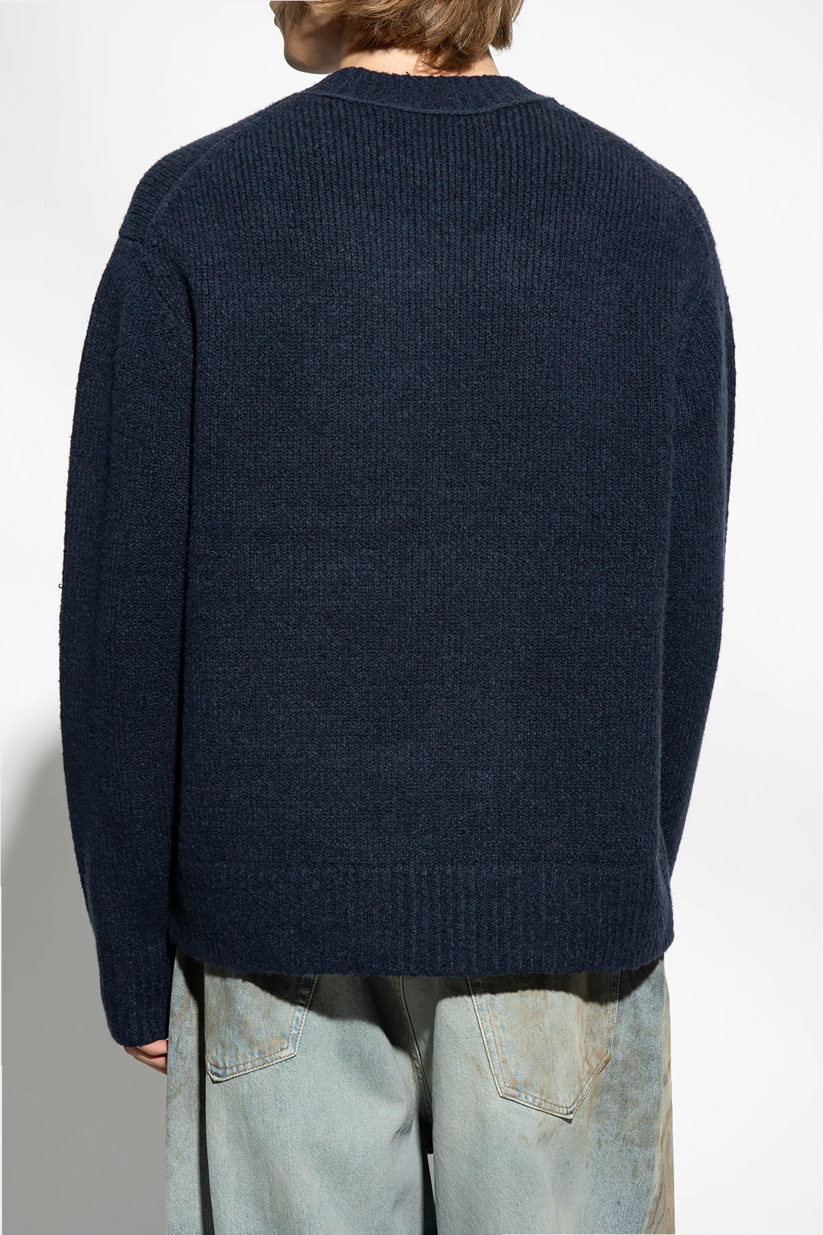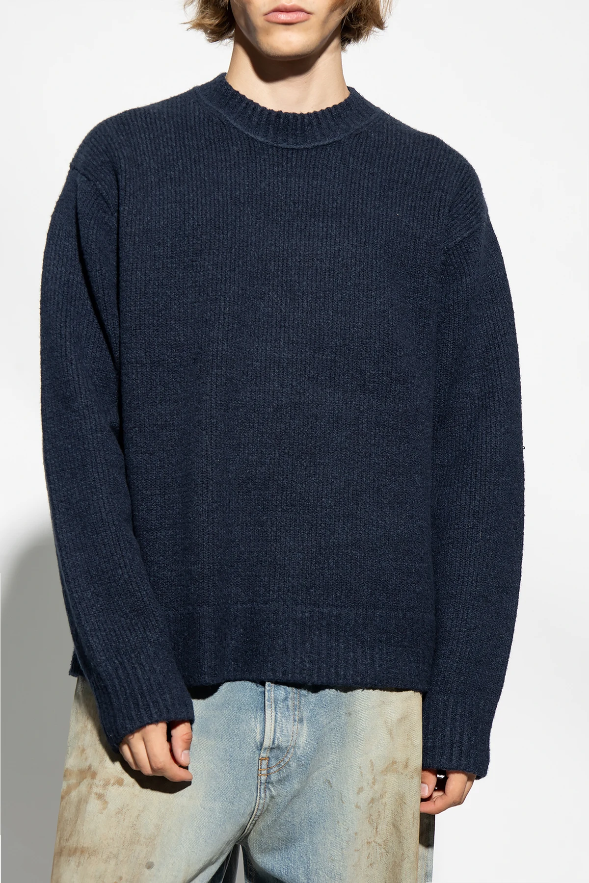 Granatowy, prążkowany sweter Acne Studios. Wykonany z mieszanki bawełny oraz wełny. Okrągły dekolt, rękawy oraz dół zakończone ściągaczem.