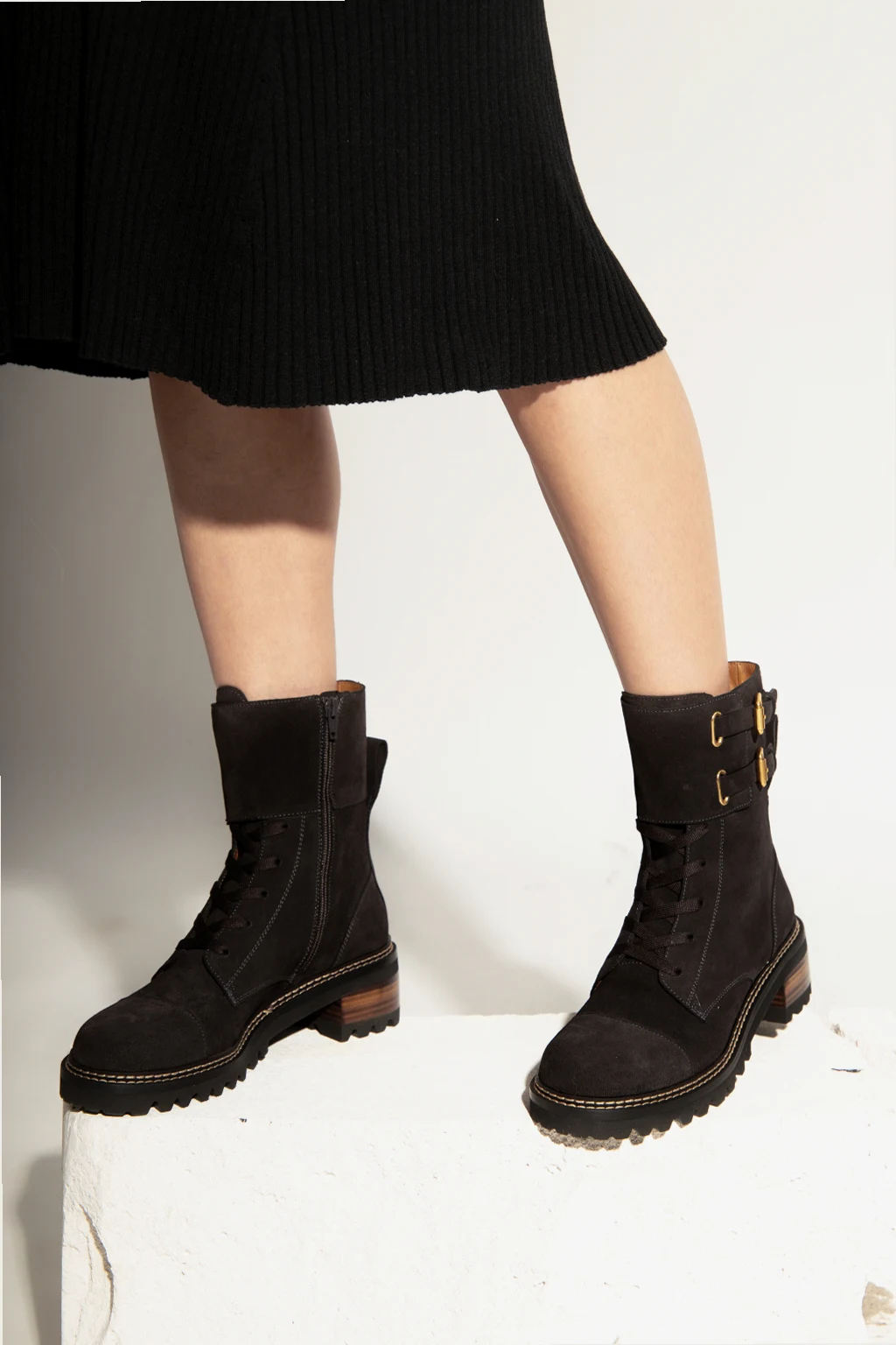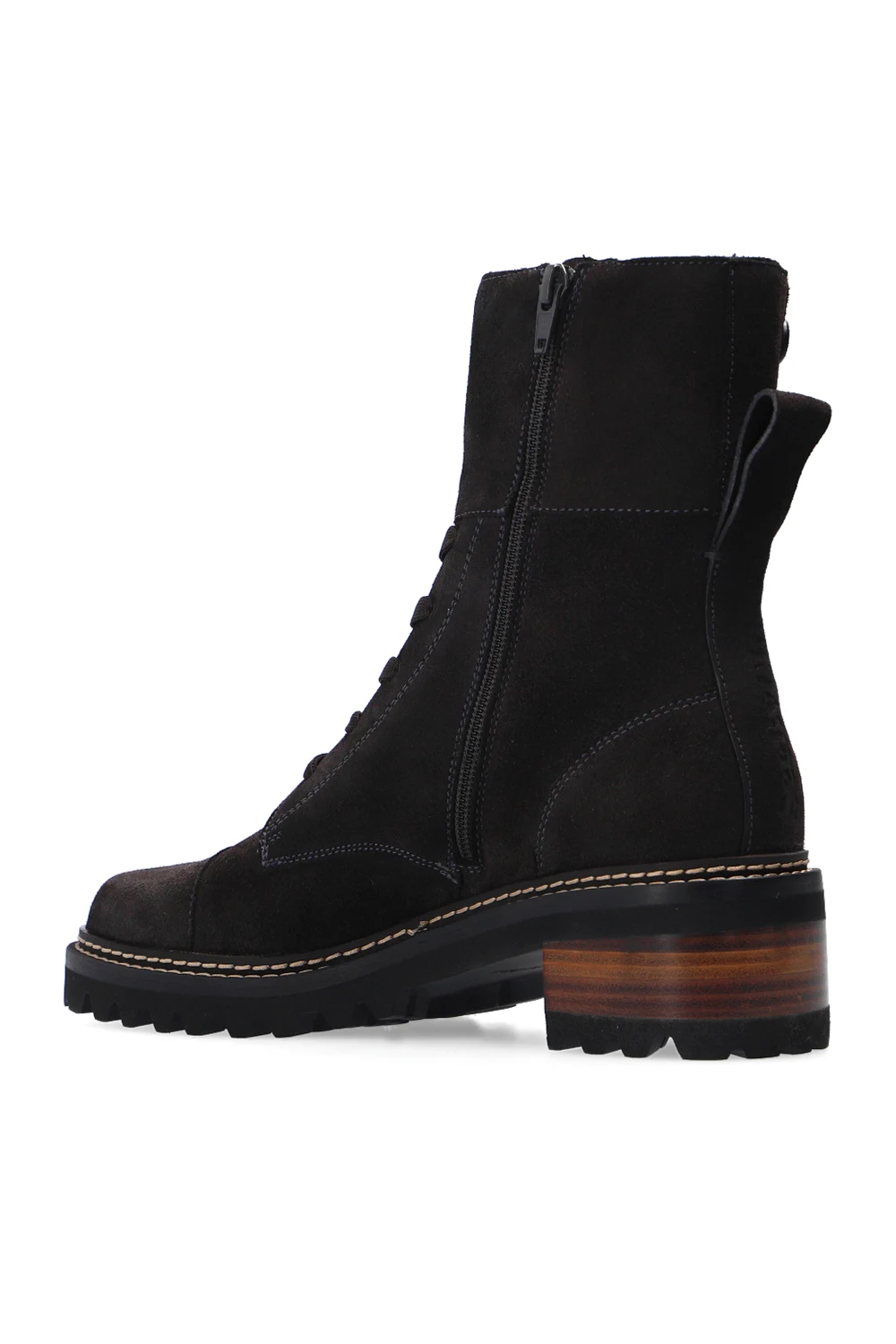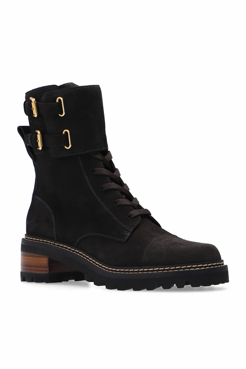 Czarno-brązowe, sznurowane botki na obcasie, model ‘Mallory’ See By Chloé. Wykonane ze skóry cielęcej. Zapinane na zamek oraz na dwa regulowane paski z klamrą. Z tyłu wytłoczone logo. Czarna, gumowa podeszwa.