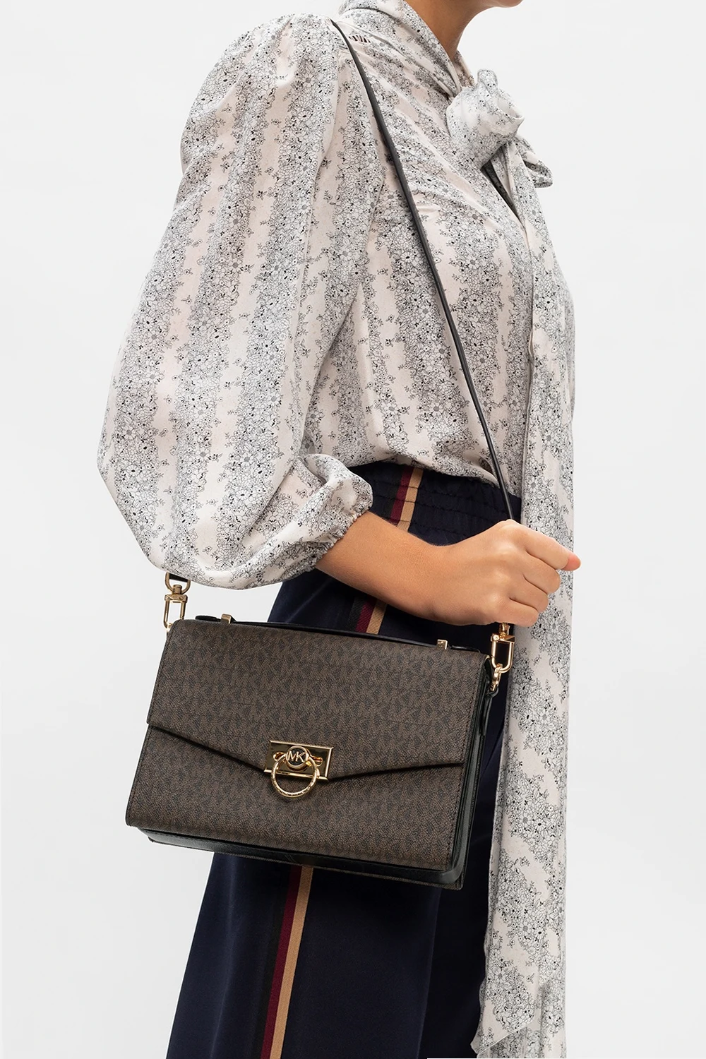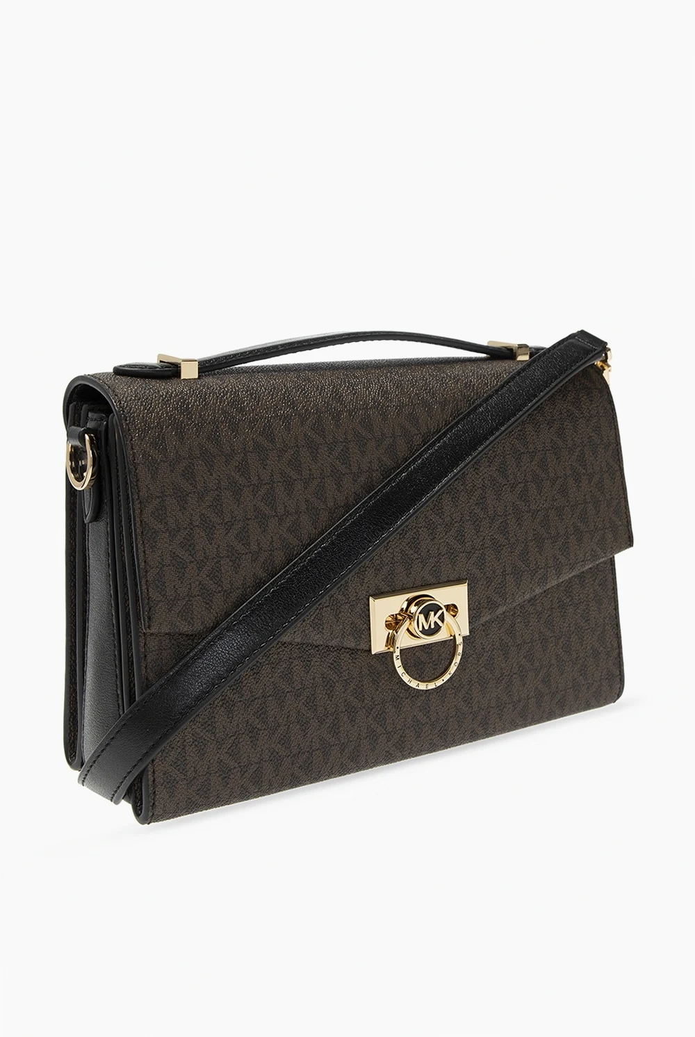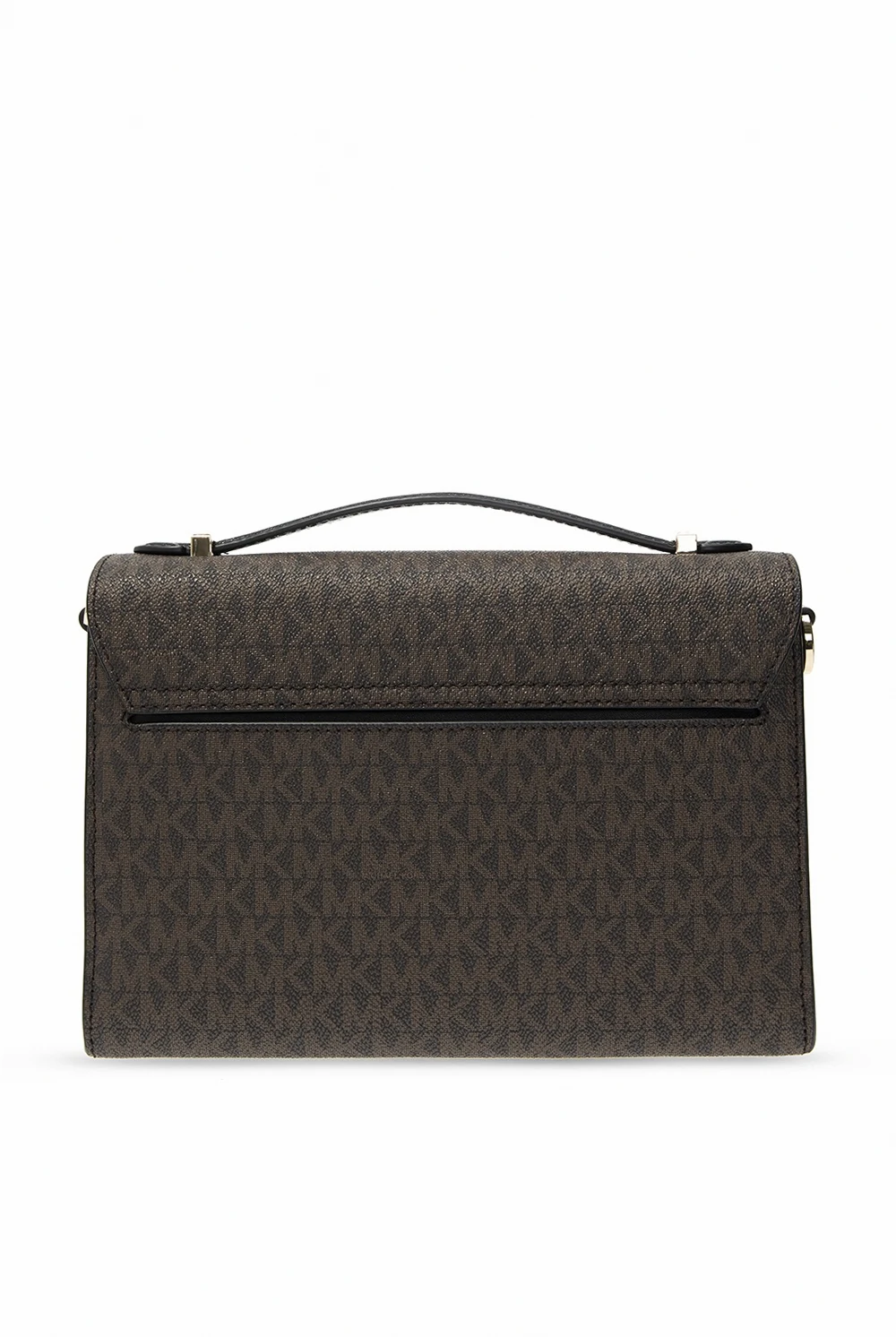 Brązowo-czarna torba na ramię, model ’Hendrix’ Michael Michael Kors. Wykonana z płótna ozdobionego logo. Wykończona skórą. Dekoracyjne zamknięcie z logo. Z tyłu wsuwana kieszeń. Półokrągła rączka. Odpinany, regulowany pasek. Wewnątrz trzy oddzielne komory, jedna zamykana na zamek, kieszeń zamykana na zamek i wsuwana kieszeń. Metalowe elementy w kolorze złotym.
