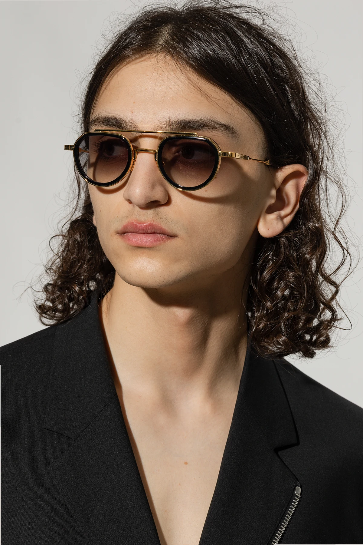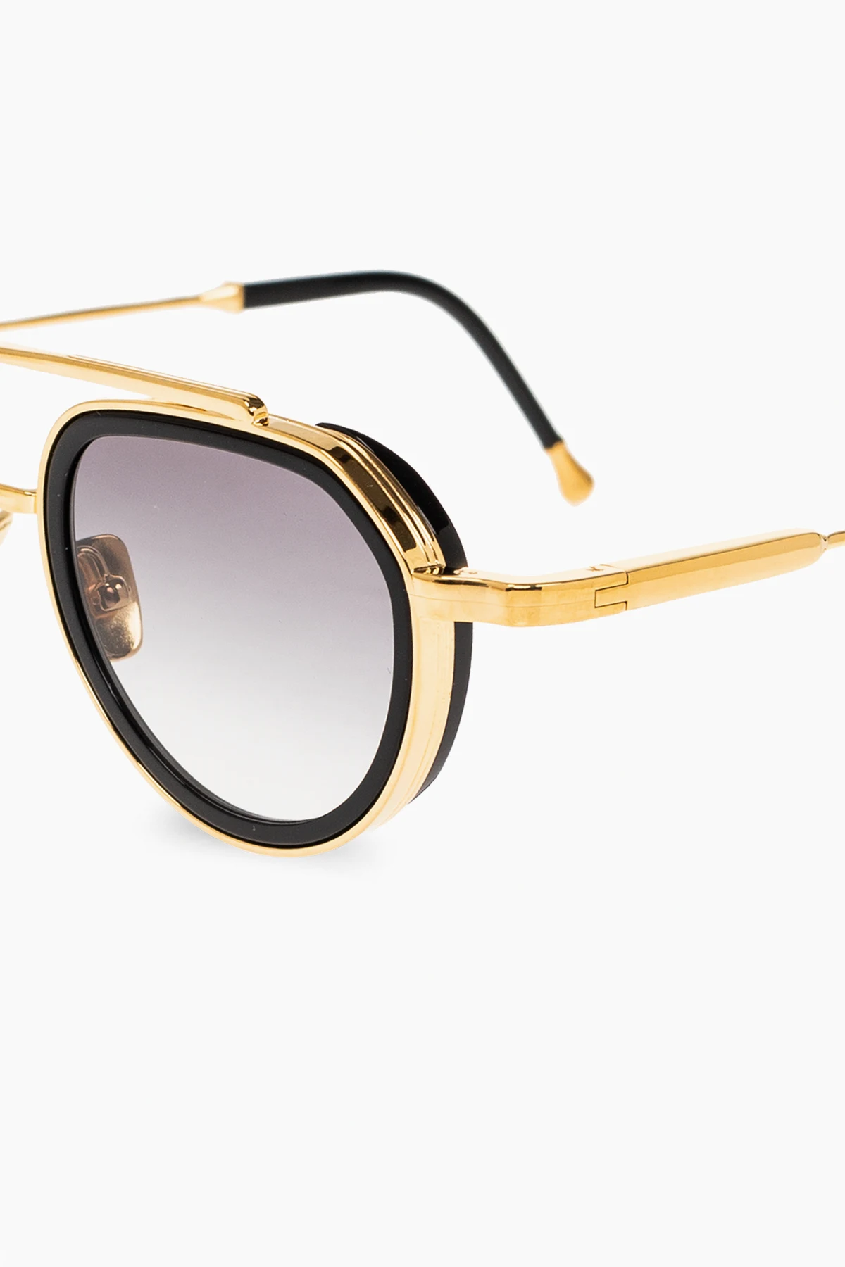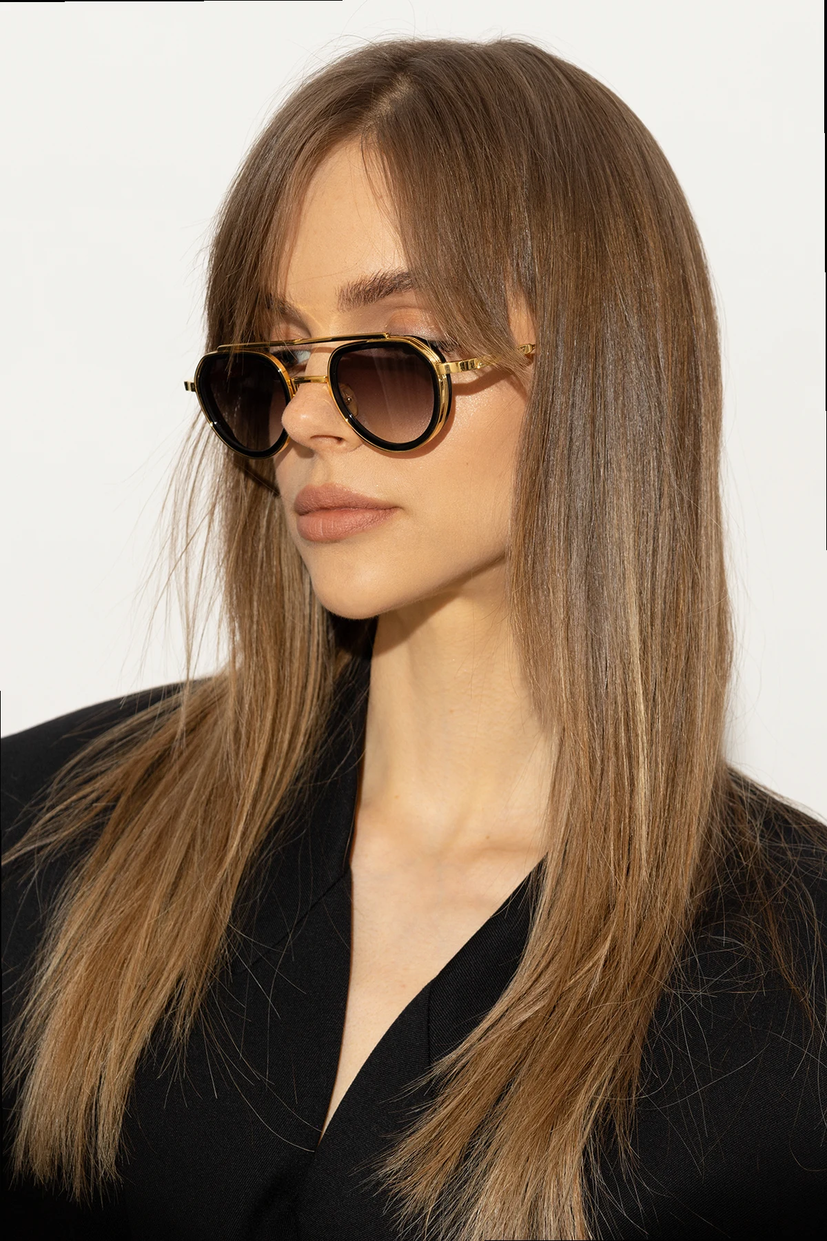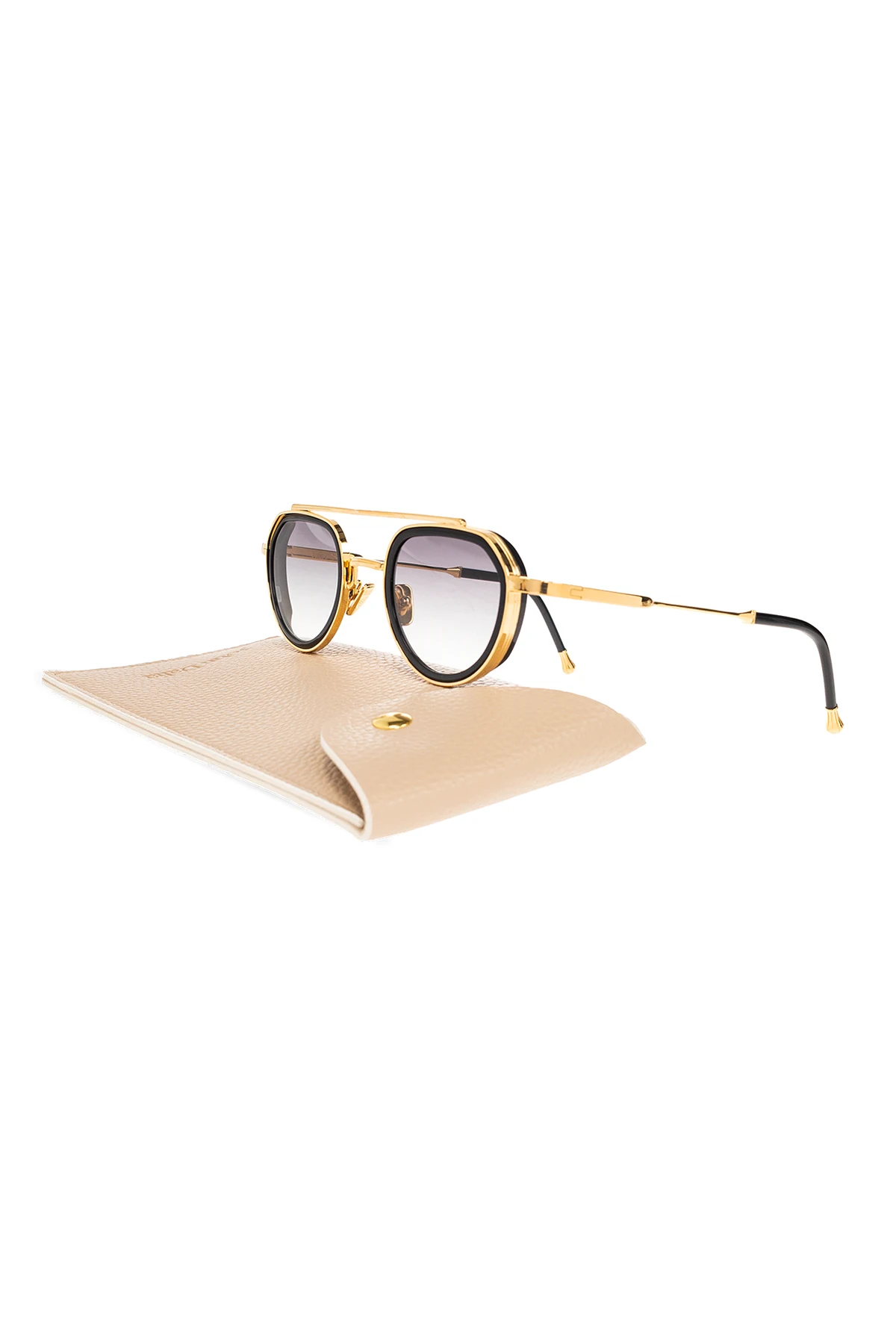 Okulary przeciwsłoneczne w kolorze czarno-złotym, model ‘Julia’ John Dalia. Oprawki typu ‘aviator’ z wyciętymi acetatowymi obręczami, wyróżniającymi się na tle 4-milimetrowego grawerowanego metalu. Podwójny mostek, regulowane noski ozdobione logo. Pozłacane 22-karatowym żółtym złotem (warstwa ok. 5 µ i stempel jubilerski wewnątrz zauszników). Szare, gradientowe soczewki CR39 z ochroną przeciwko promieniom UV. Dołączone etui. Ręcznie wykonane we Francji.