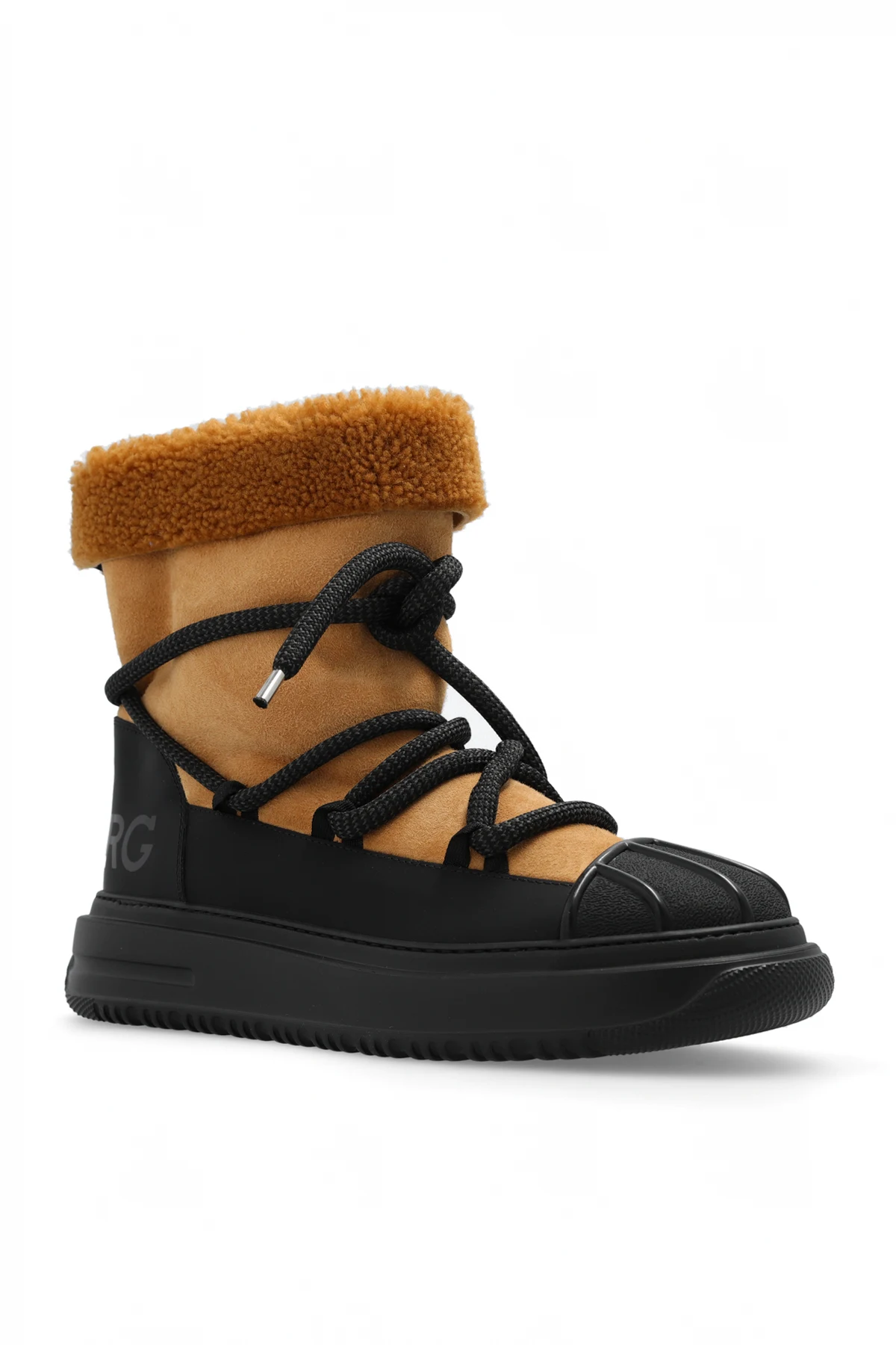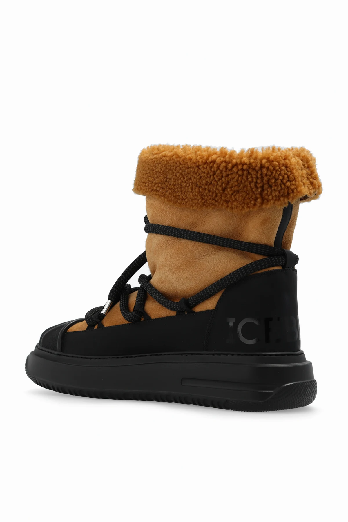Beżowo-czarne, sznurowane śniegowce Iceberg. Wykonane ze skóry. Z tyłu nadruk z logo. Czarna, gumowa podeszwa. Wykończone futrem.