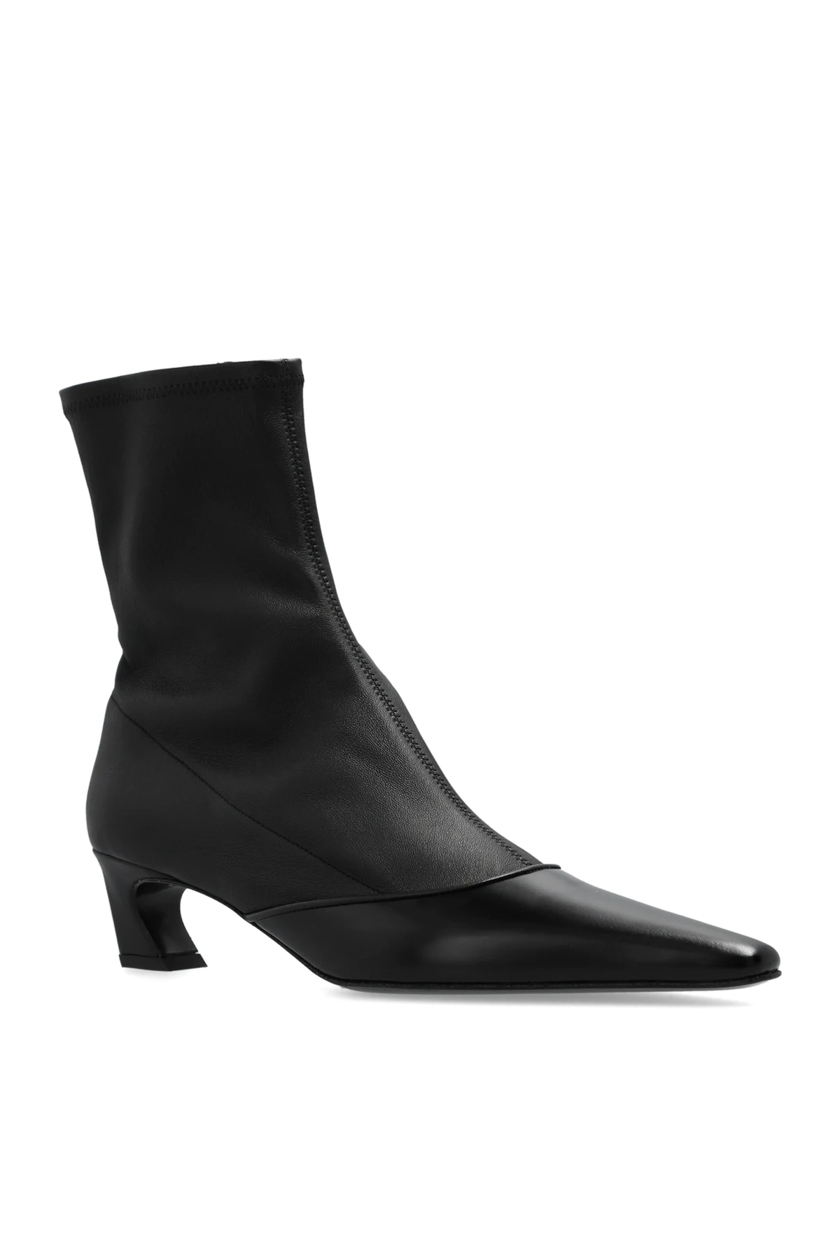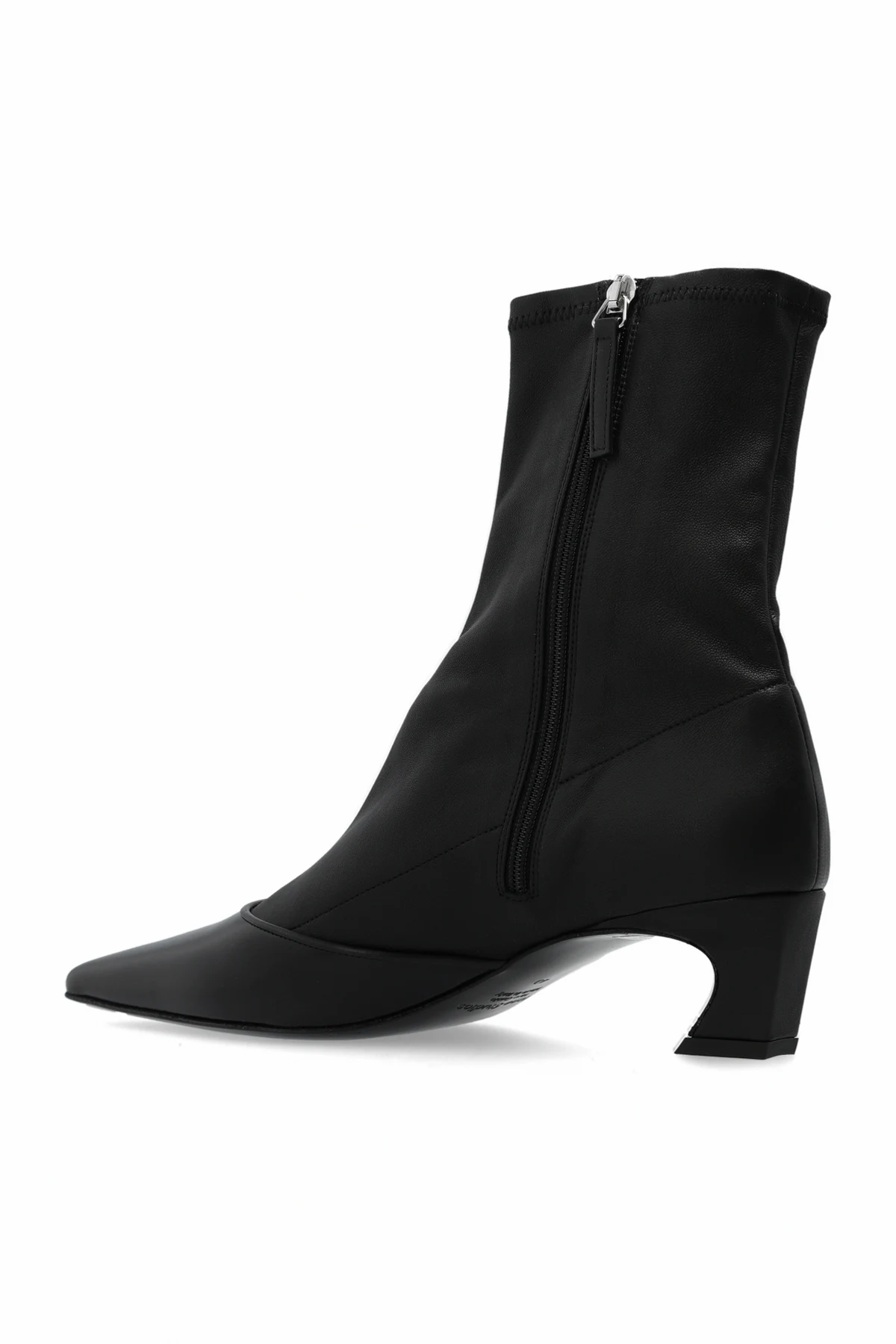 Czarne botki na obcasie Acne Studios. Wykonane ze skóry. Z boku zapinane na zamek. Wydłużony, ścięty nosek. Czarna, skórzana podeszwa.