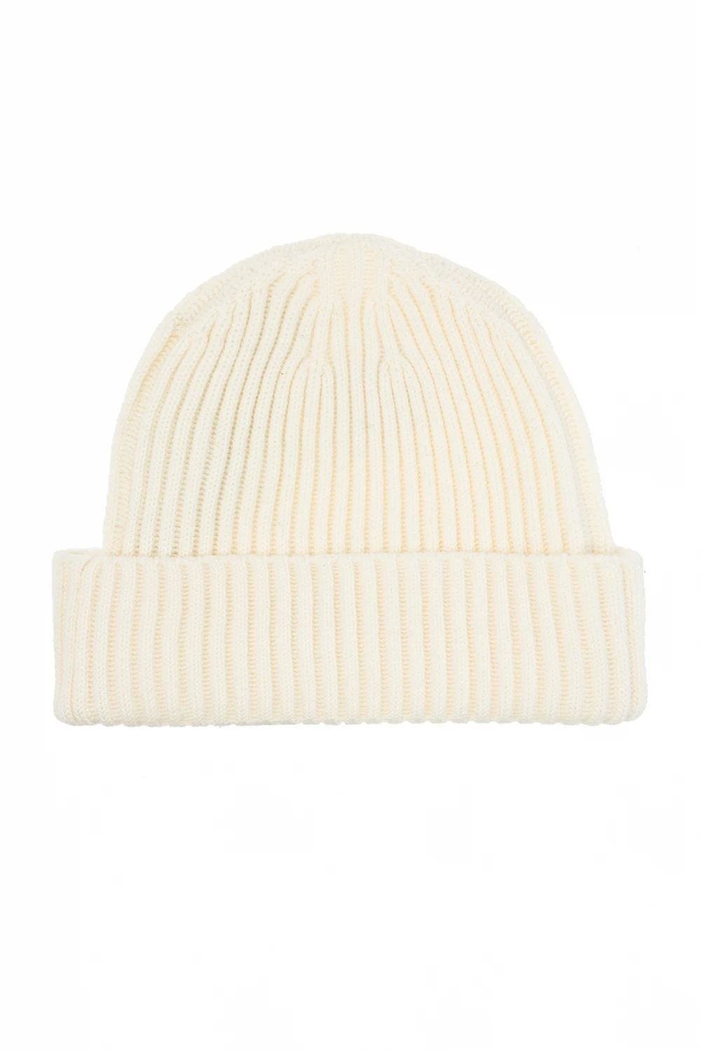 Kremowa, pleciona czapka Stone Island. Wykonana z wełny. Z przodu naszywka z logo w kolorze czarno-białym.