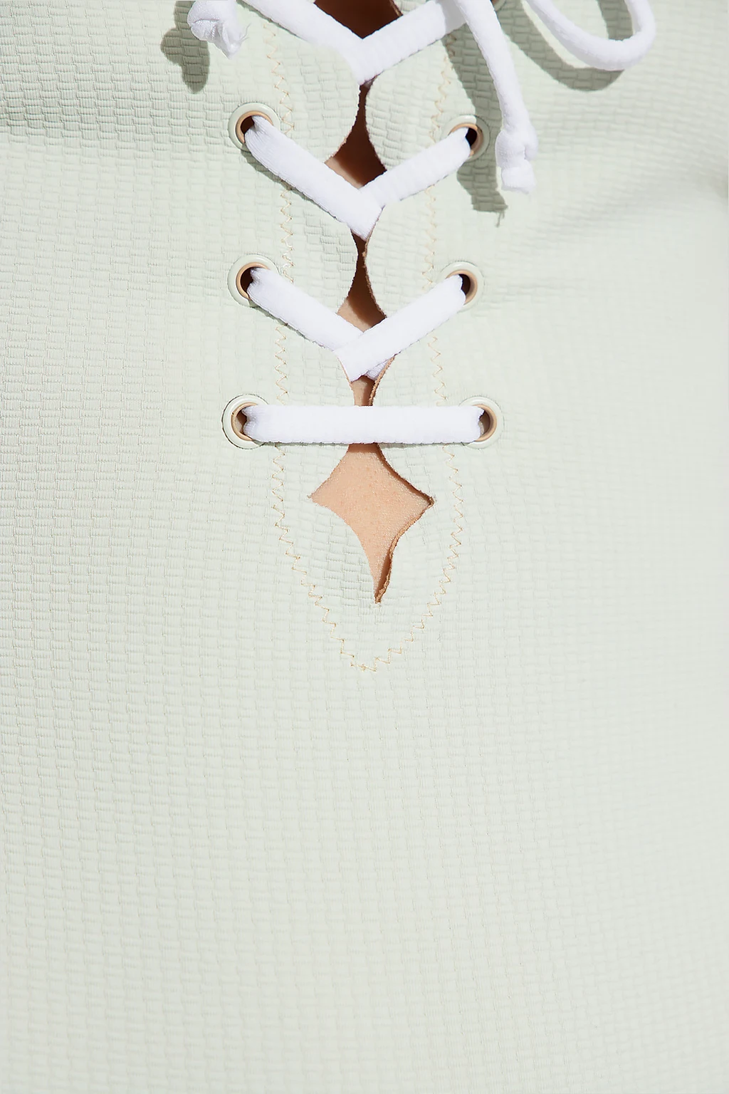 Dwustronny, jednoczęściowy kostium kąpielowy kąpielowy, model ‘Chesapeake’ Marysia. Wykonany z elastycznej teksturowanej tkaniny. Charakterystyczne, ręcznie wycinane brzegi. Z przodu dekoracyjne wiązanie. Z jednej strony beżowy. Z drugiej strony jasnozielony.