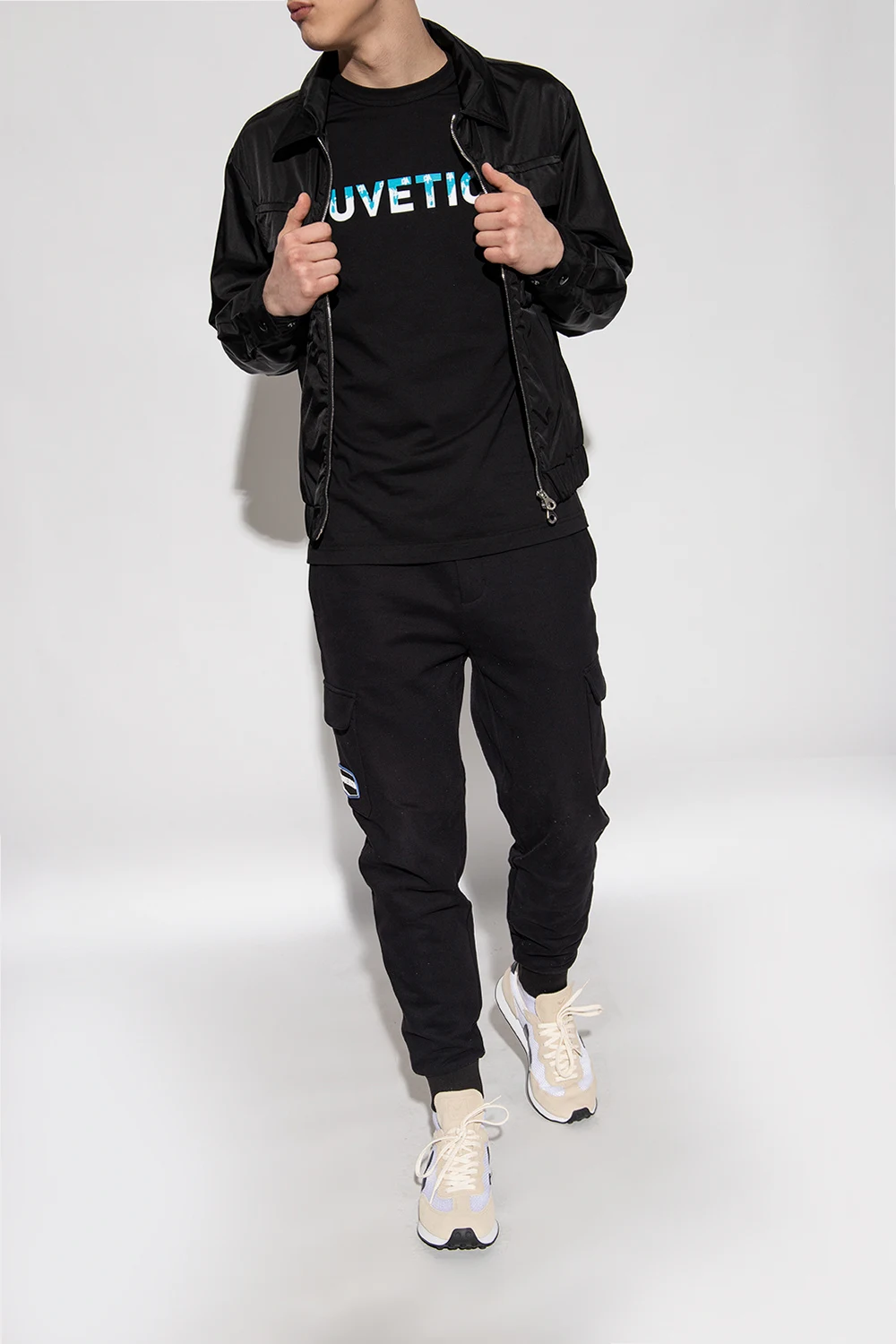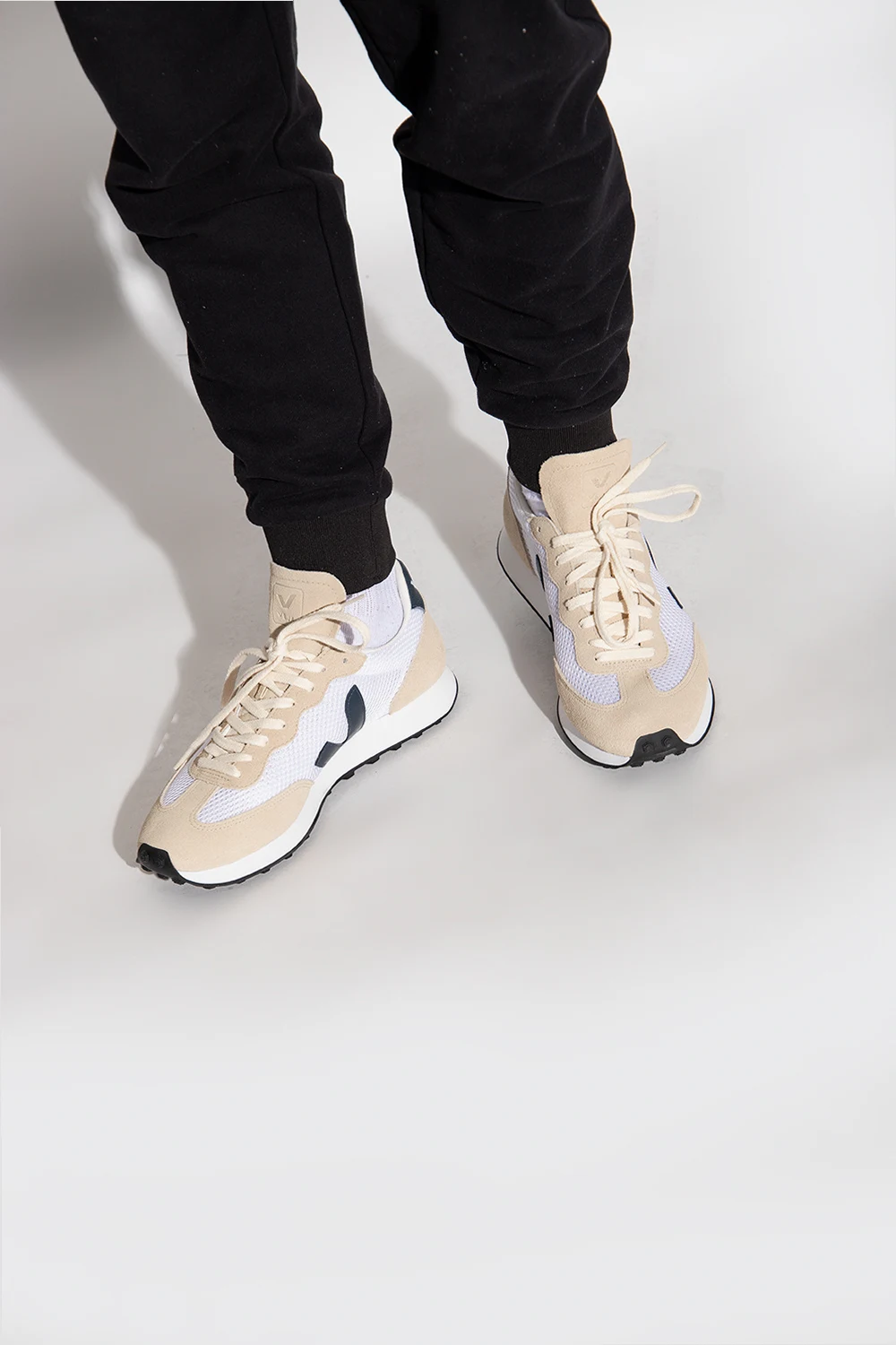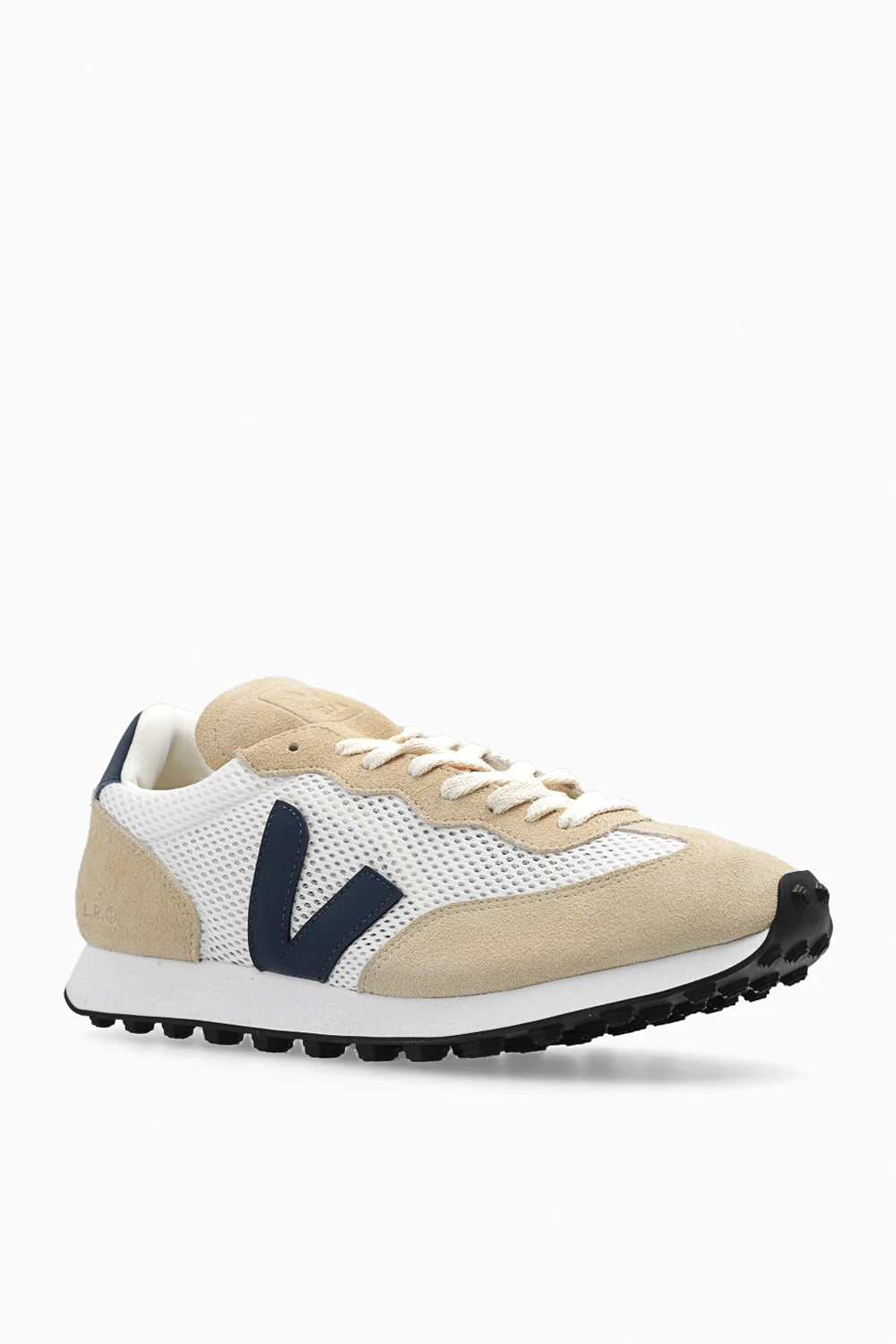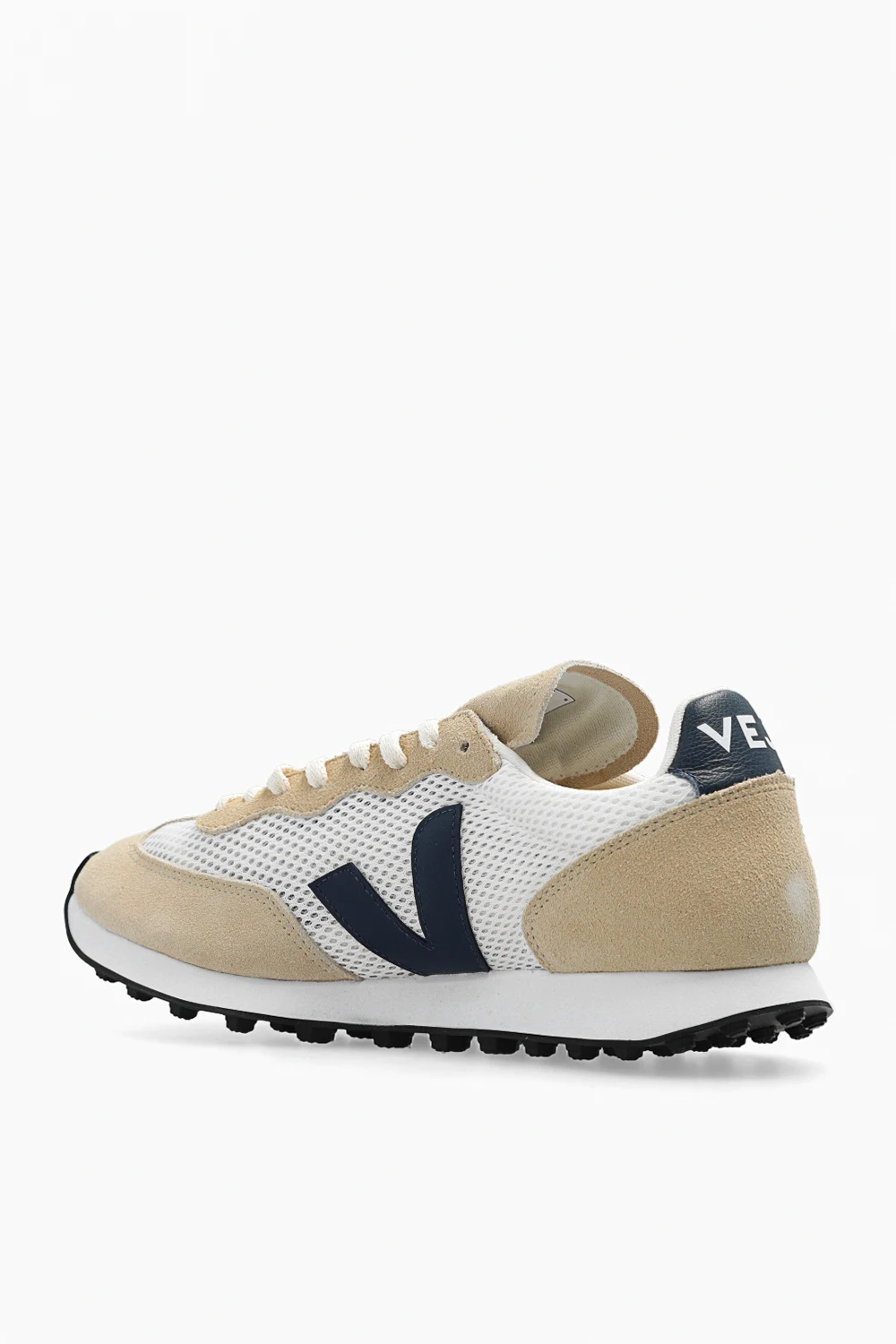 Beżowo-biało-granatowe, sznurowane buty sportowe, model ‘RIO BRANCO LIGHT AIRCELL’ Veja. Wykonane z materiału i skóry. Ozdobione aplikacjami z logo. Biało-czarna, gumowa podeszwa.