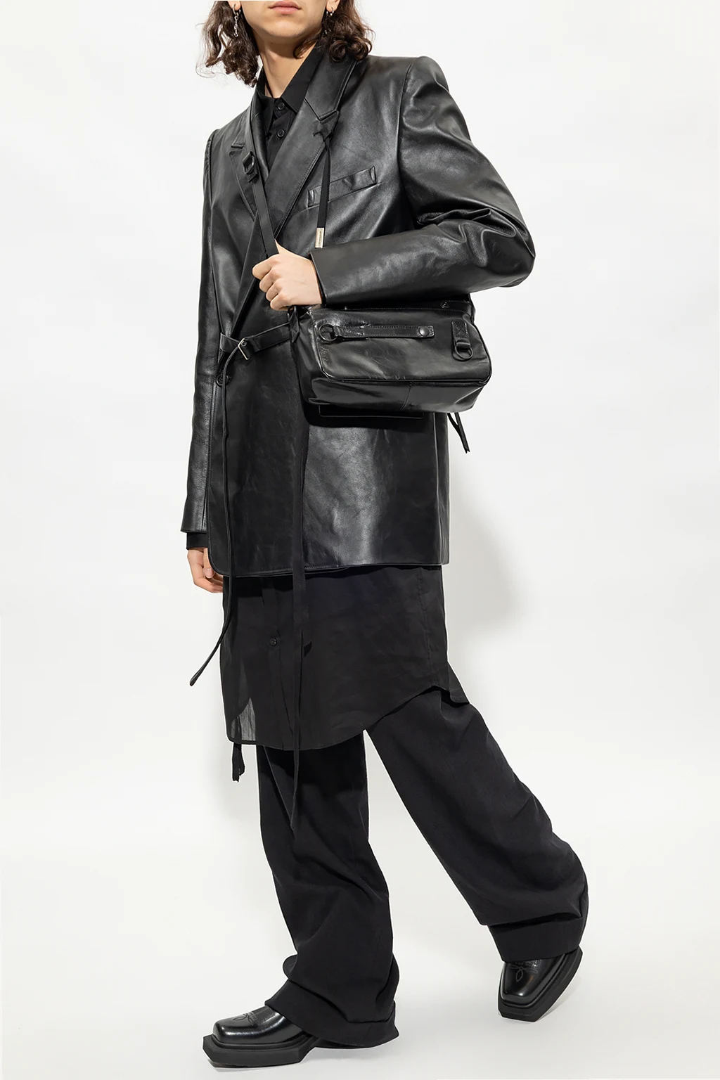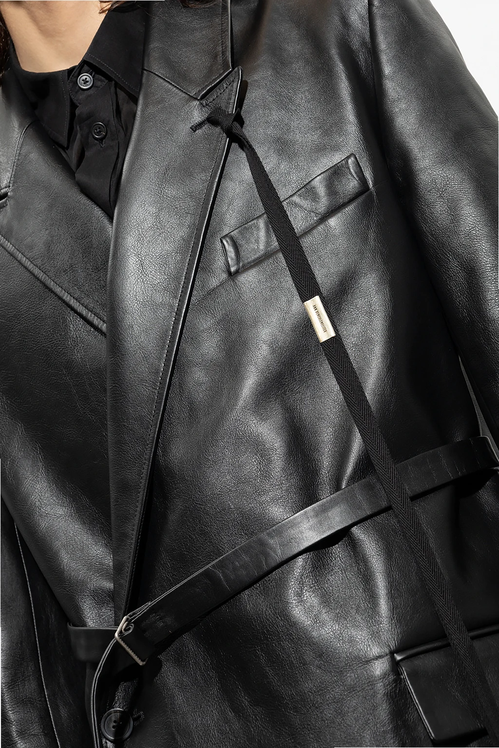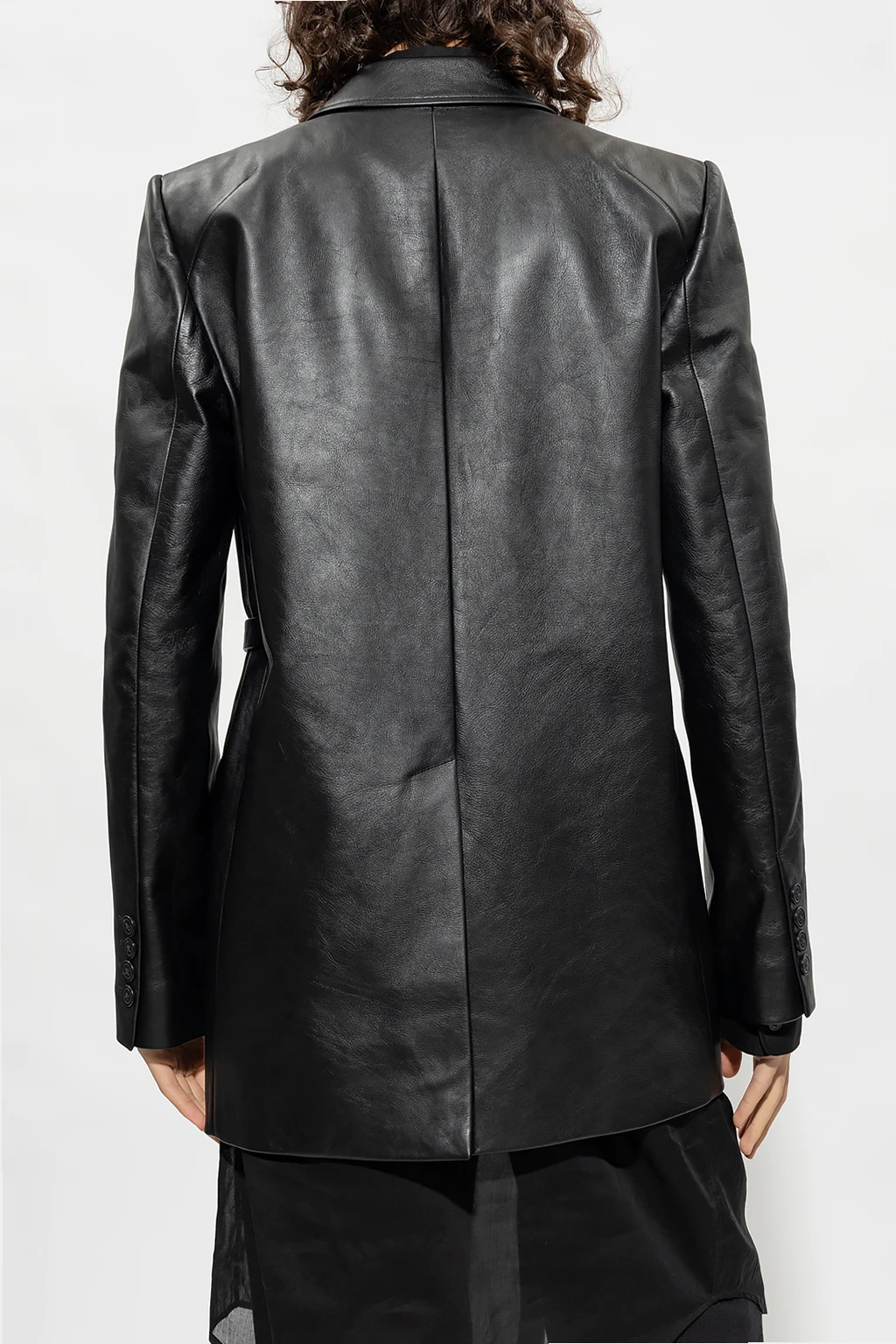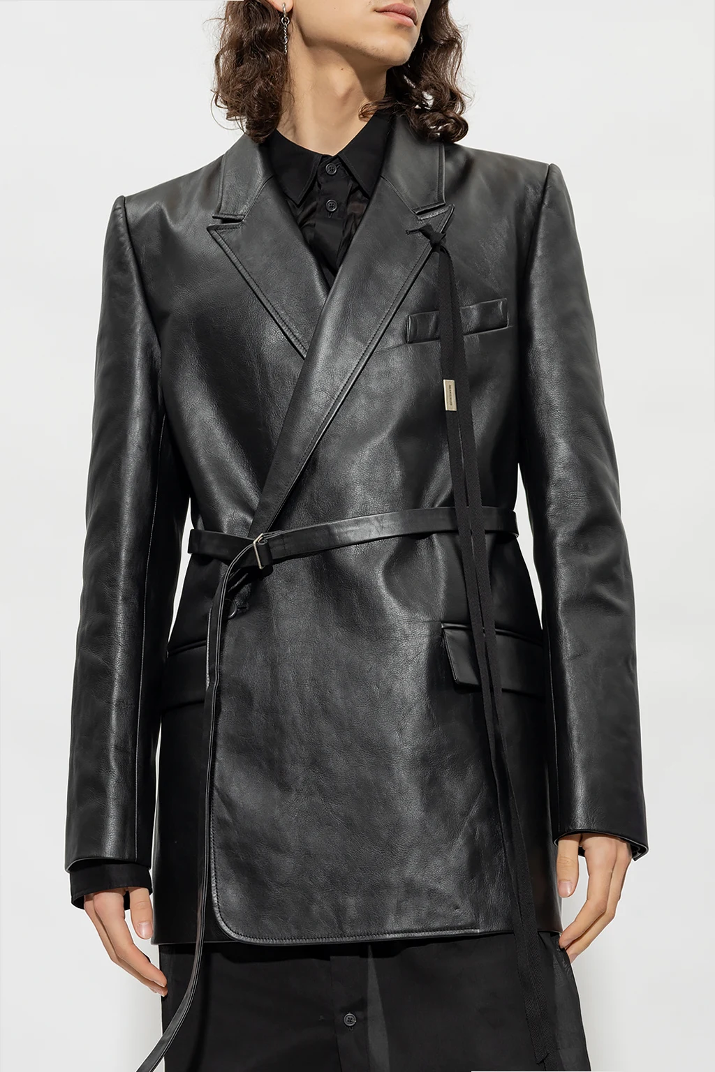 Czarna, dwurzędowa marynarka, model ‘Gerard’ Ann Demeulemeester. Wykonana ze skóry. Zapinana na guziki. Z przodu trzy kieszenie: wsuwana i dwie z patką. Z tyłu pojedyncze rozcięcie. Zamknięte klapy z dekoracyjnymi trokami. W pasie wiązana paskiem. Długie rękawy zakończone zapięciem na guziki.