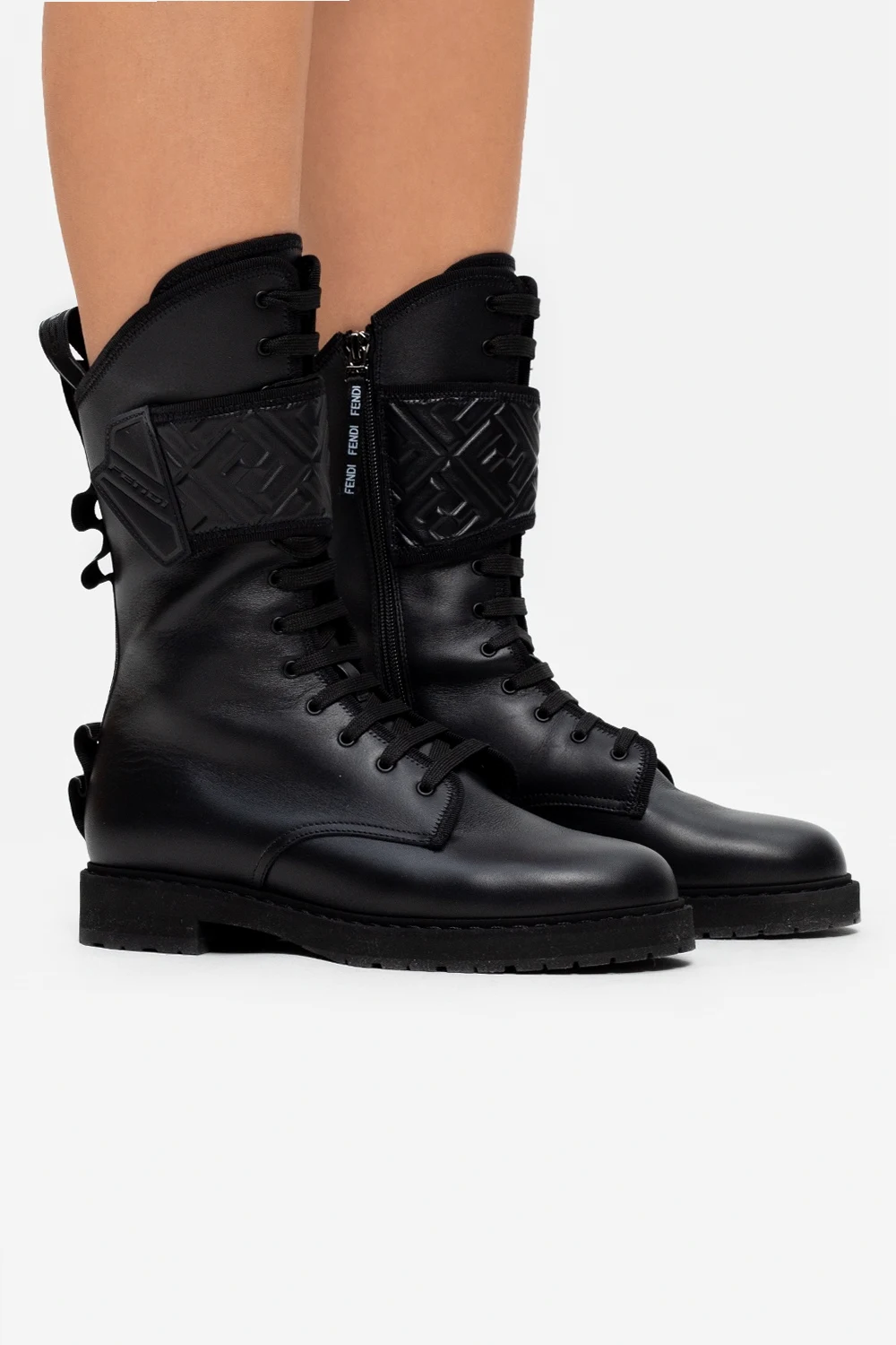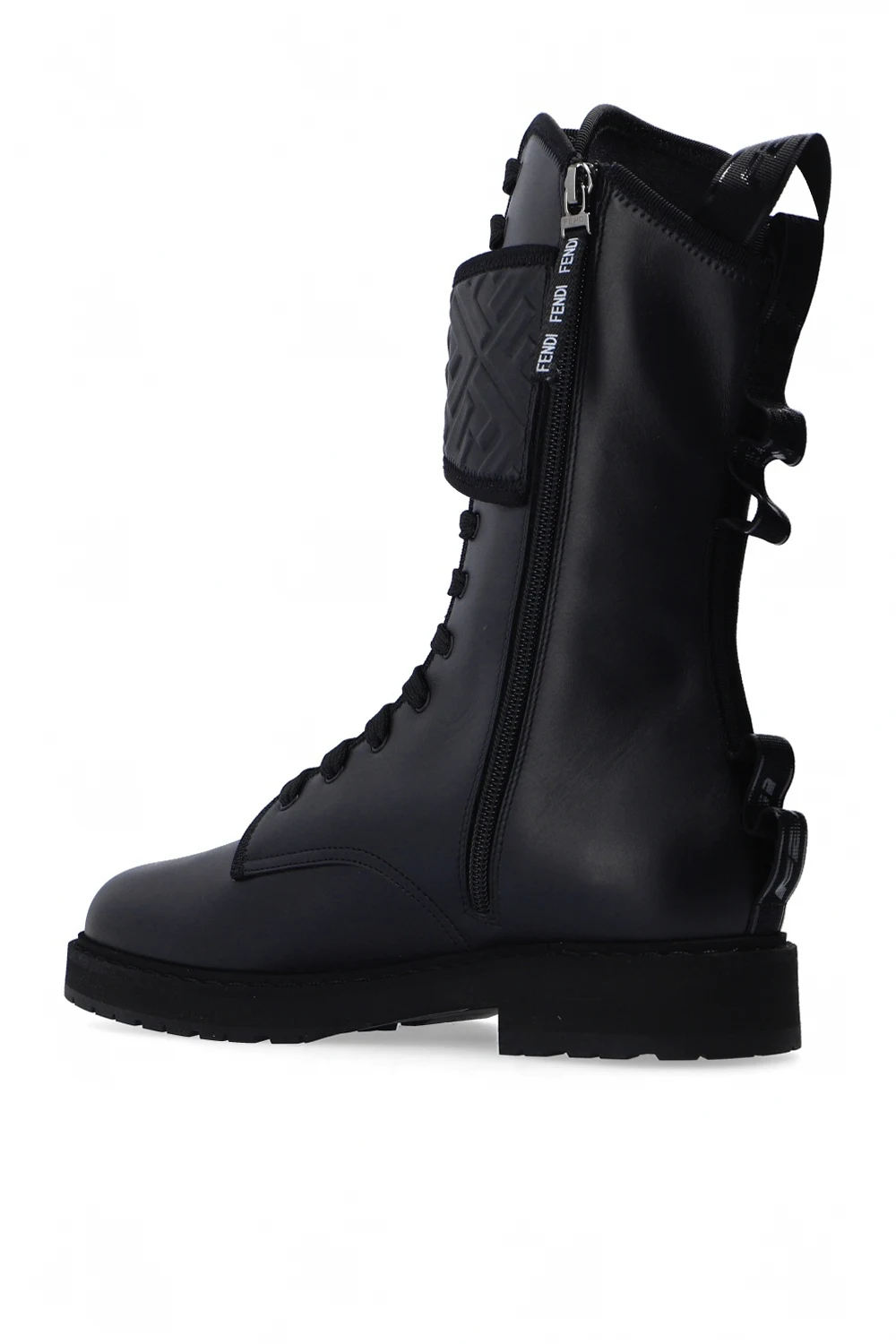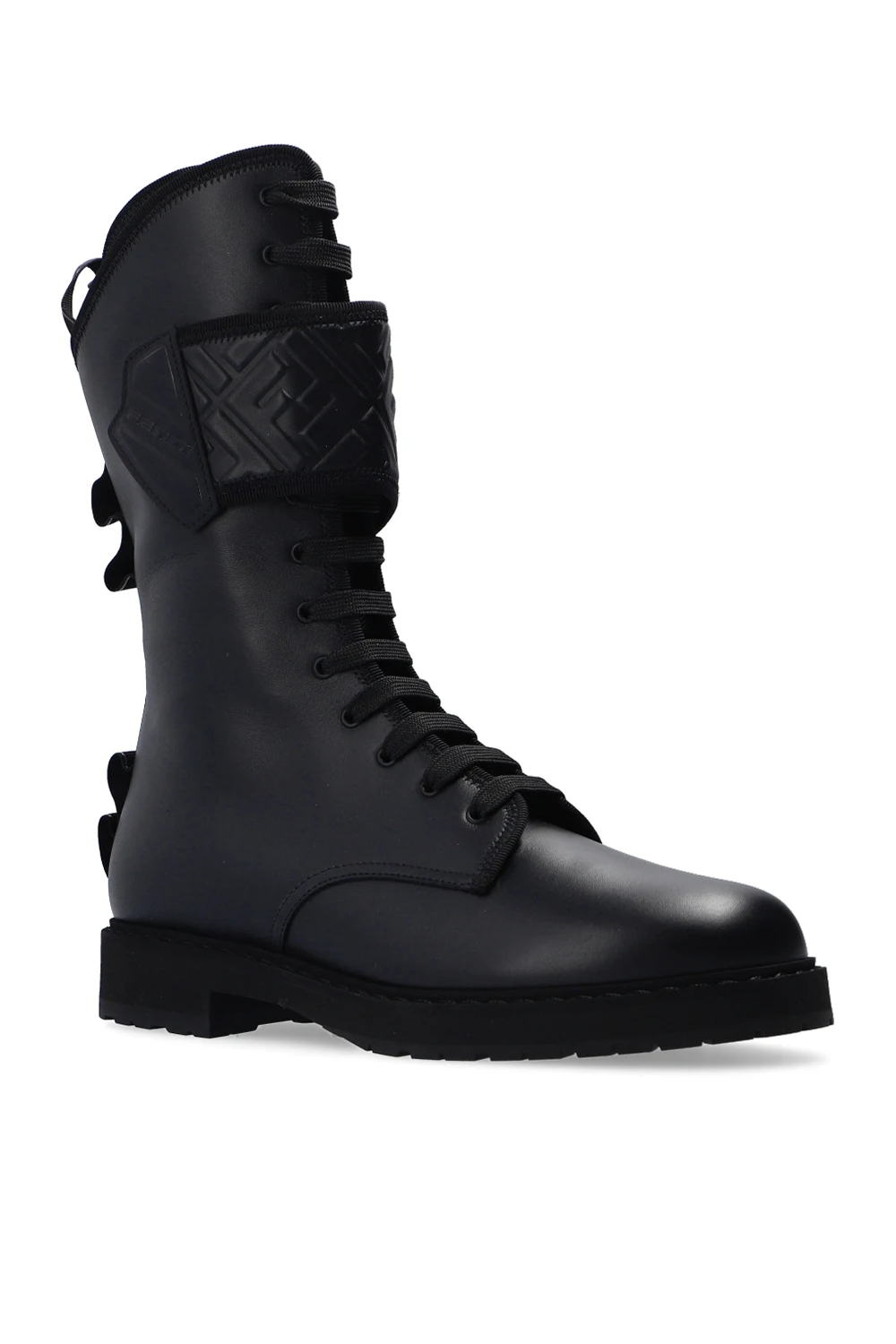 Czarne, sznurowane trapery Fendi. Wykonane ze skóry. Zapinane z boku na zamek i rzep. Ozdobione wytłoczonym logo. Materiałowe wykończenie z nadrukowanym logo. Czarna, gumowa podeszwa.