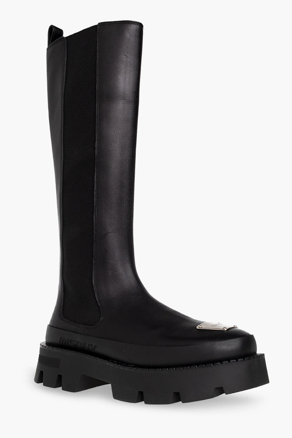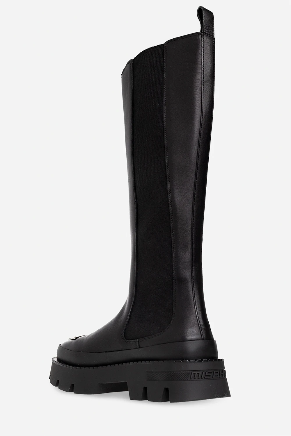 Czarne buty pod kolano MISBHV. Wykonane ze skóry. Ozdobione aplikacją z wytłoczonym logo. Po bokach pas elastyczny. Czarna, gumowa podeszwa.
