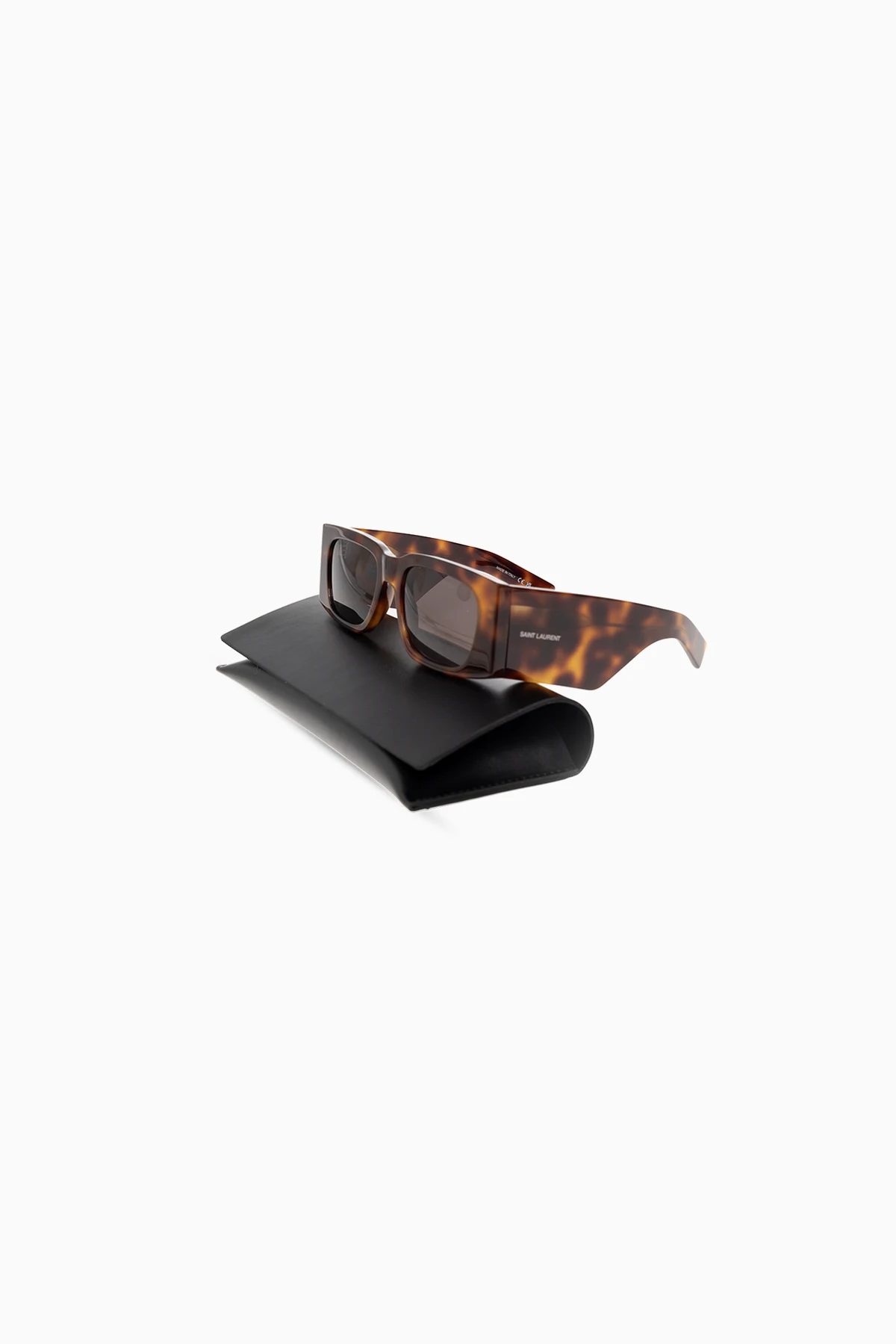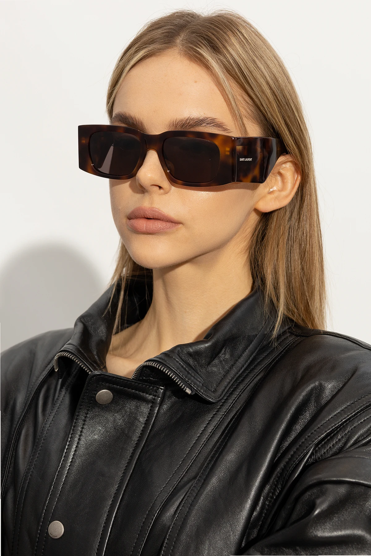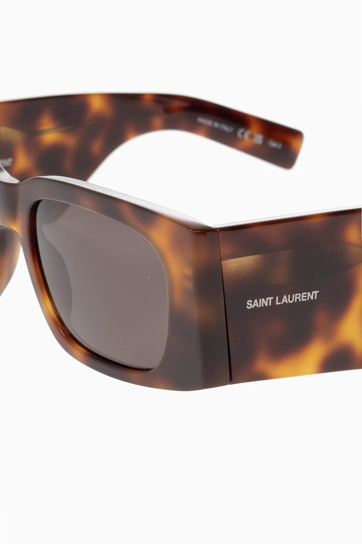 Brązowo-beżowe, szylkretowe okulary przeciwsłoneczne, model ‘SL 654’ Saint Laurent. Grube, prostokątne oprawki. Zauszniki ozdobione wygrawerowanym logo. Czarne nylonowe soczewki ze 100% ochroną przed promieniowaniem UV. Dołączone etui.