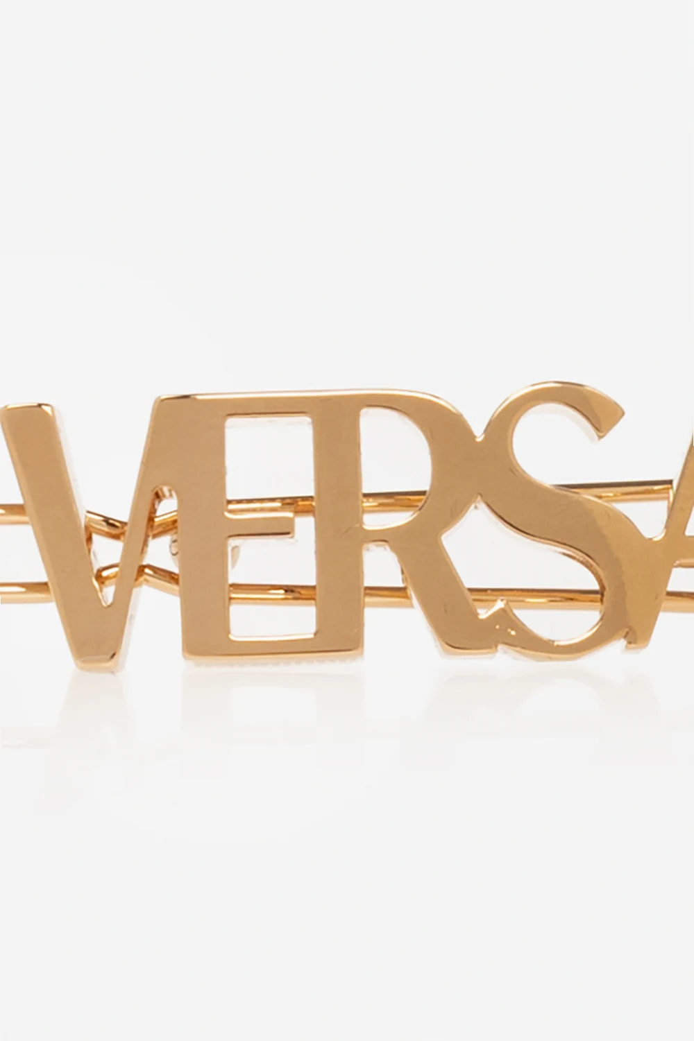Mosiężna spinka w kolorze złotym Versace. Ozdobiona logo.