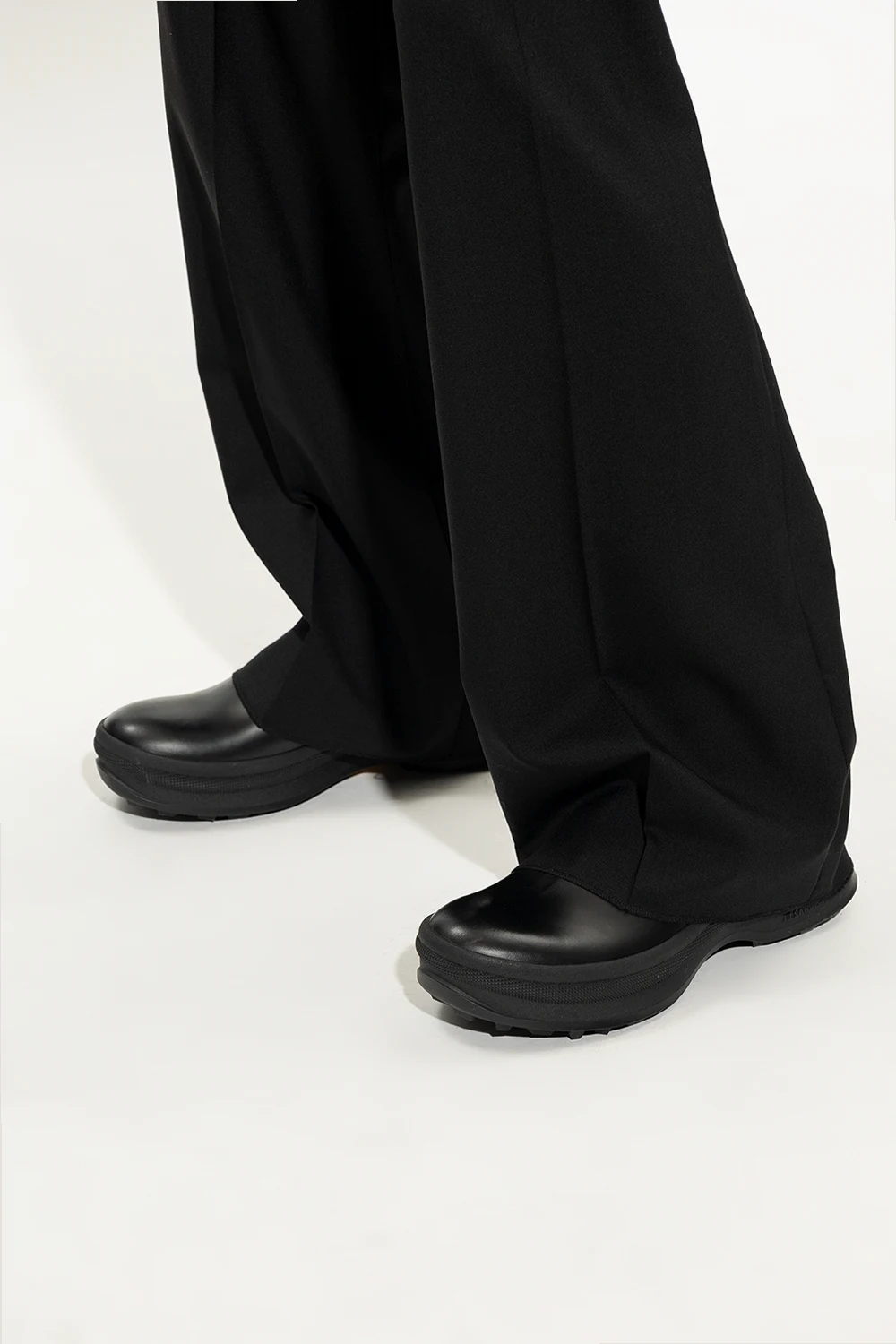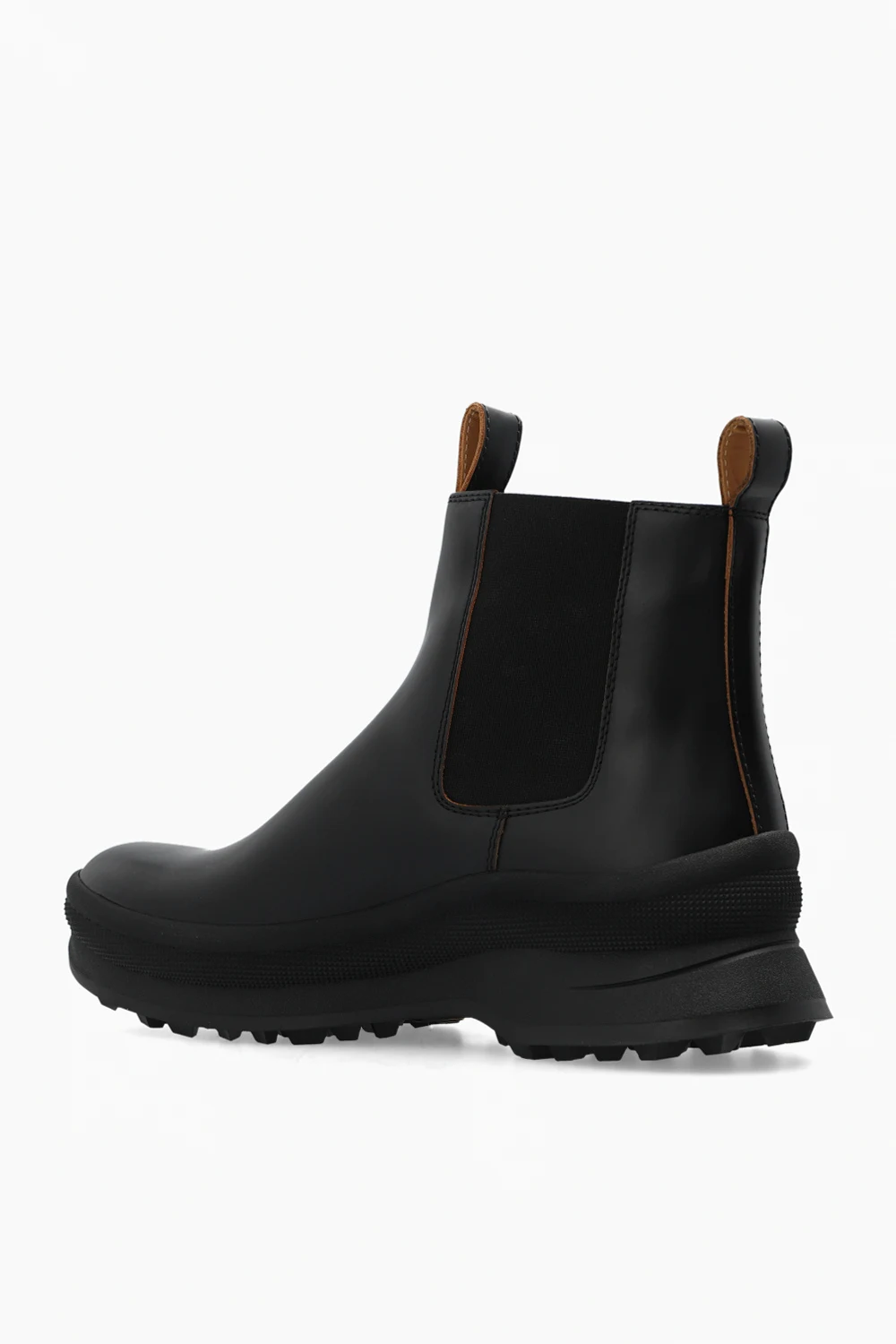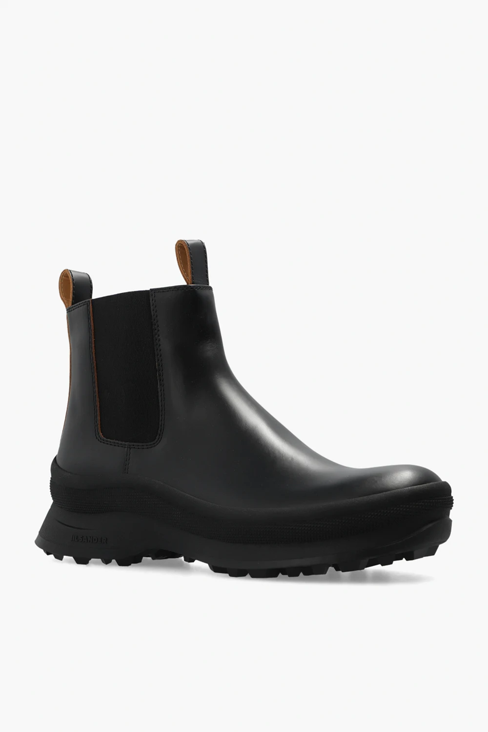 Czarne, wsuwane botki Jil Sander. Wykonane ze skóry. Po bokach wszyta guma. Z przodu oraz z tyłu krótkie uchwyty. Czarna, gumowa podeszwa Vibram® ozdobiona logo.