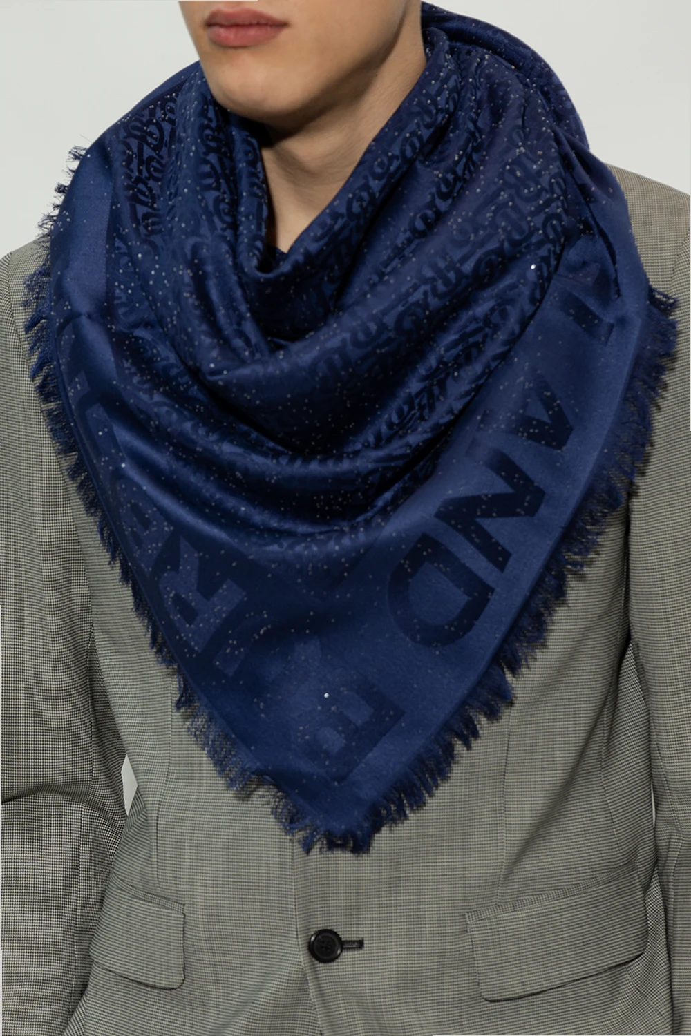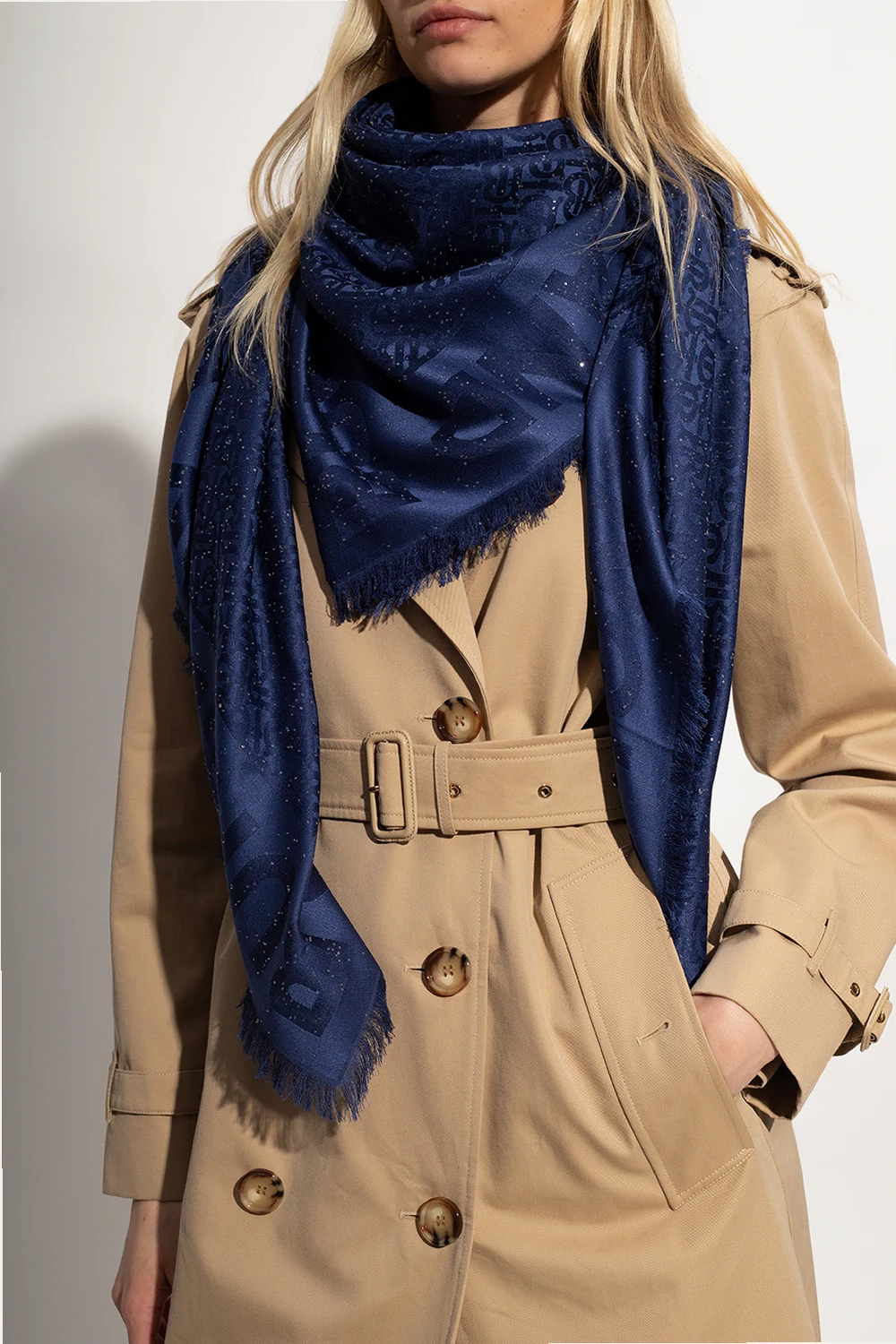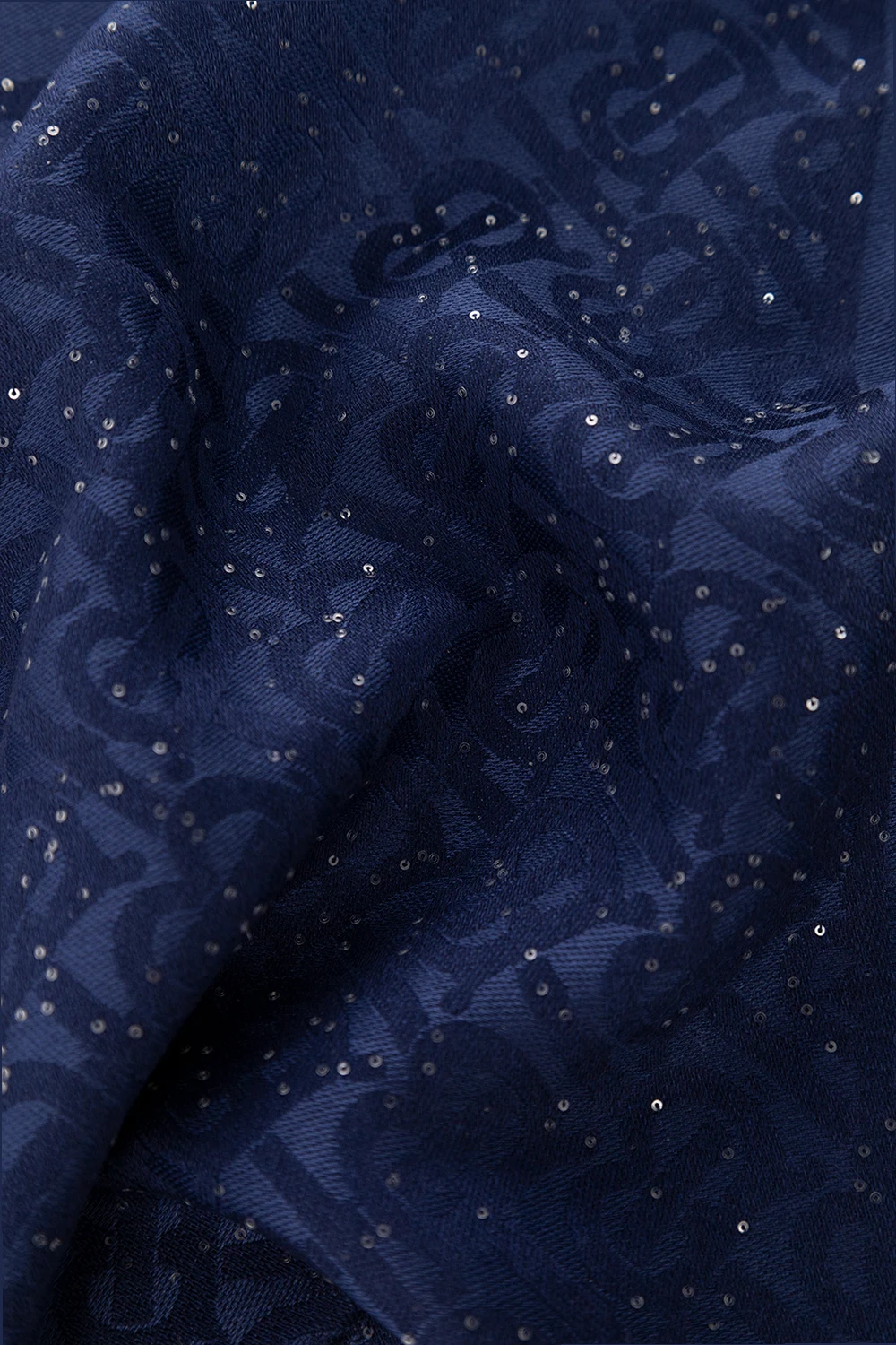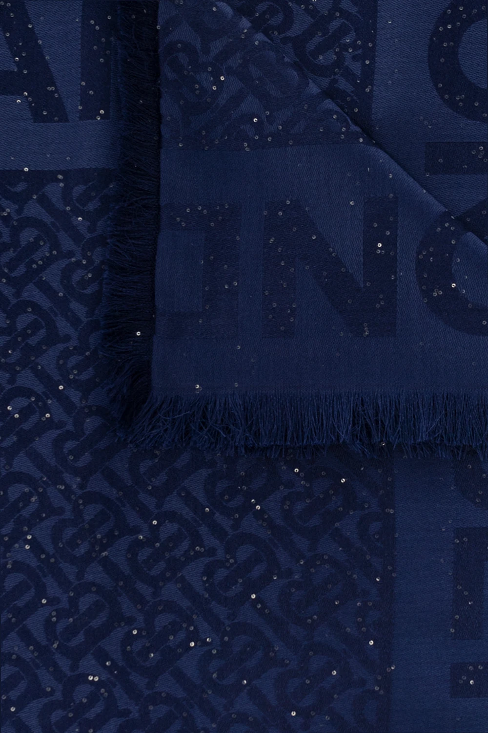 Granatowa chusta Burberry. Wykonana z wełny z domieszką jedwabiu. Ozdobiona monogramem i połyskującymi cekinami. Surowo wykończone dwa brzegi.