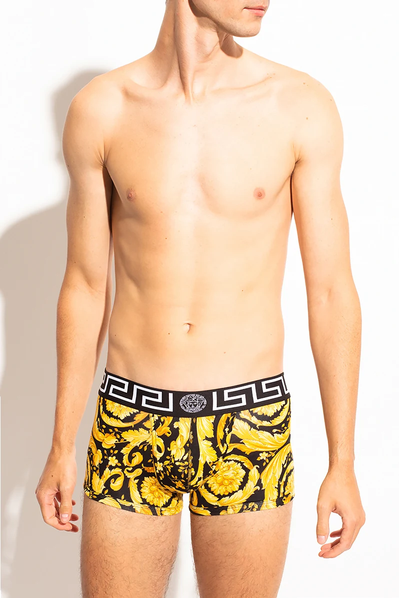 Czarno-pomarańczowe, bawełniane bokserki Versace. Ozdobione charakterystycznym dla marki motywem barokowym. W pasie guma ozdobiona wyszytym białym greckim wzorem.