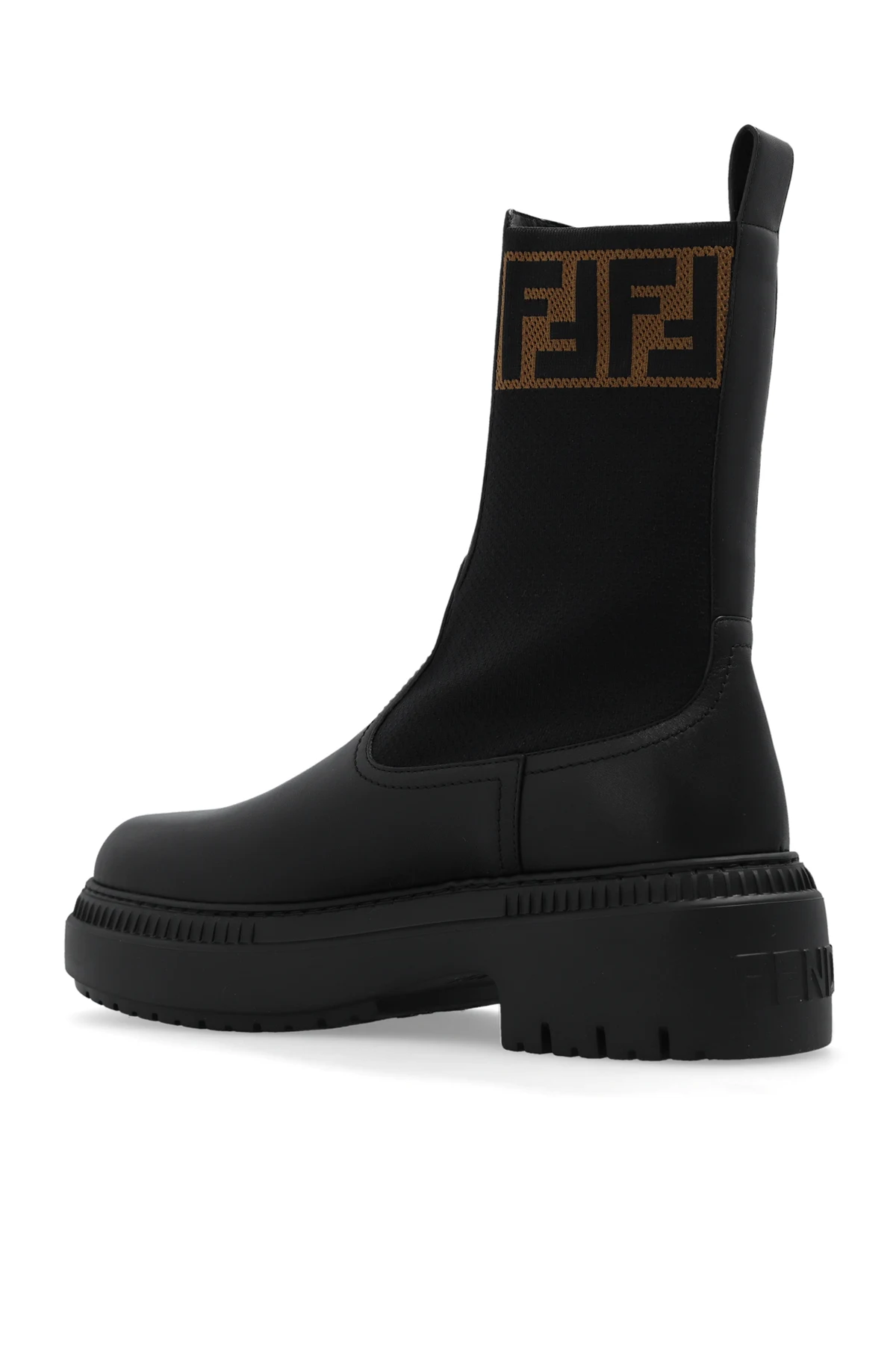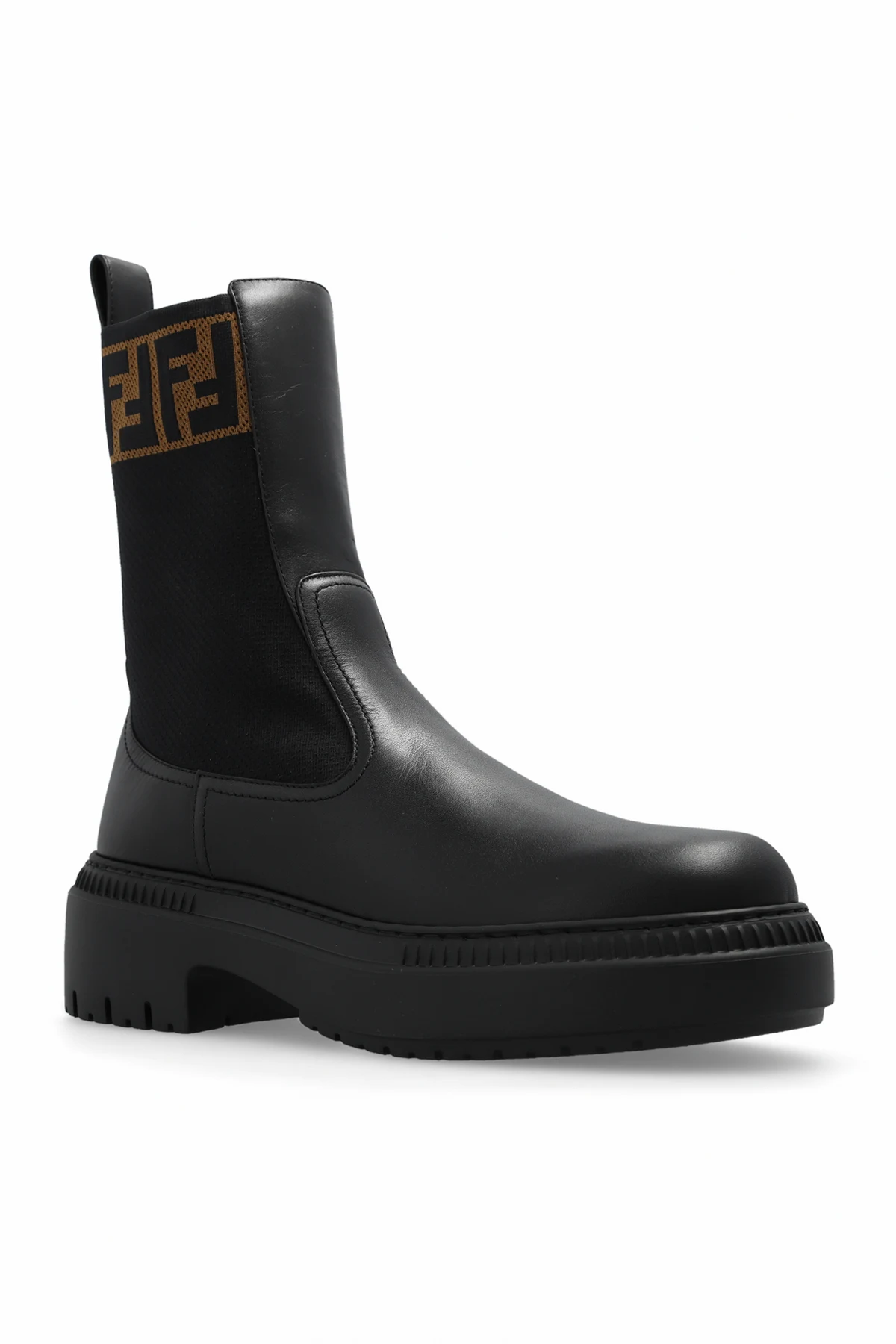 Czarne, wsuwane botki, model ‘Domino’ Fendi. Wykonane ze skóry. Po bokach wszyta guma ozdobiona brązowym wzorem z monogramem. Z tyłu krótki uchwyt. Czarna, gumowa podeszwa.