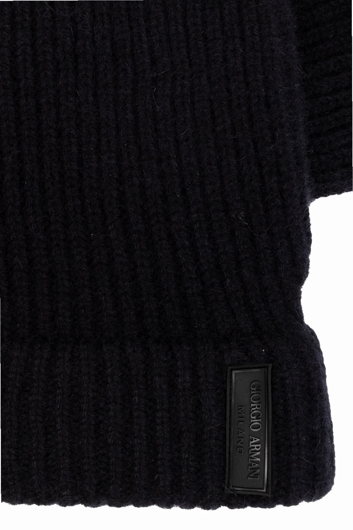 Granatowe, prążkowane rękawiczki Giorgio Armani. Wykonane z kaszmiru. Ozdobione naszywką z logo w kolorze czarnym.