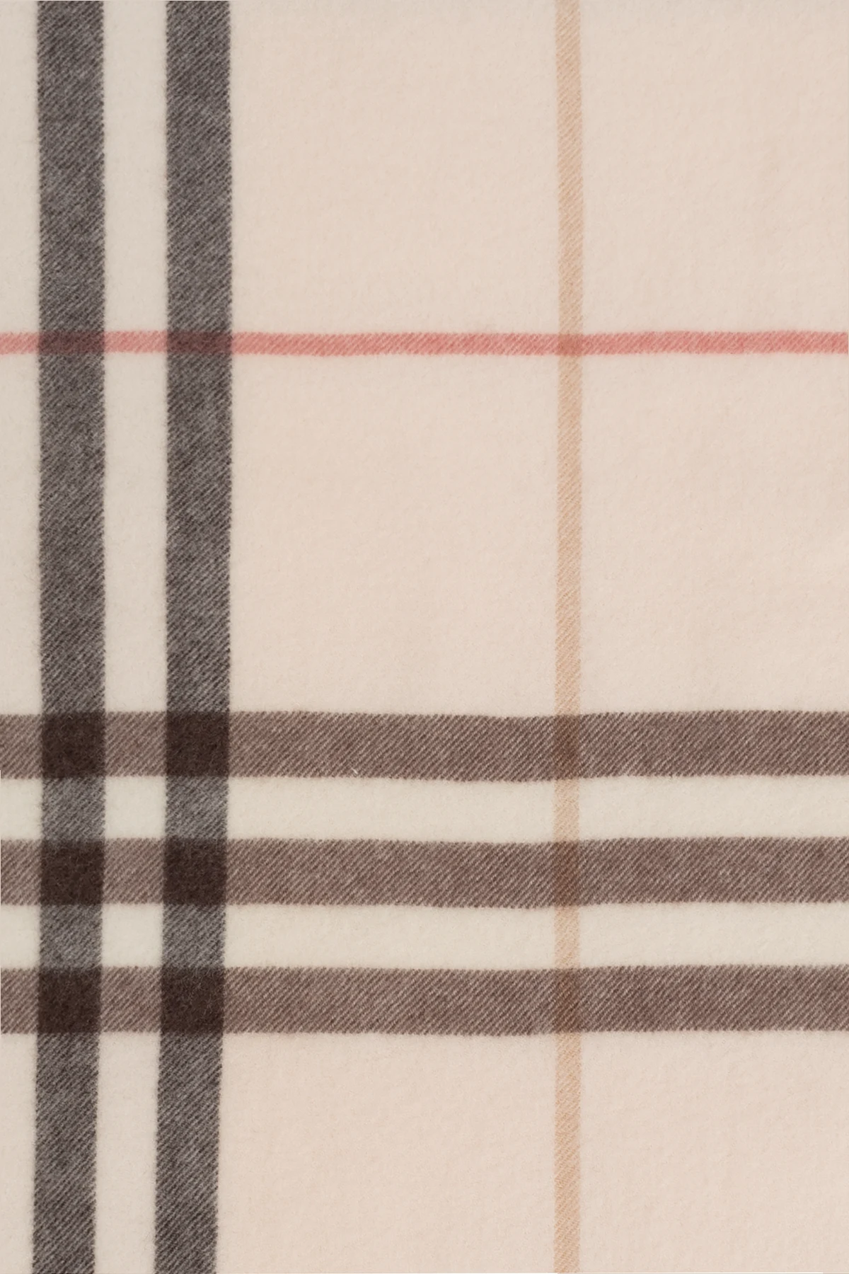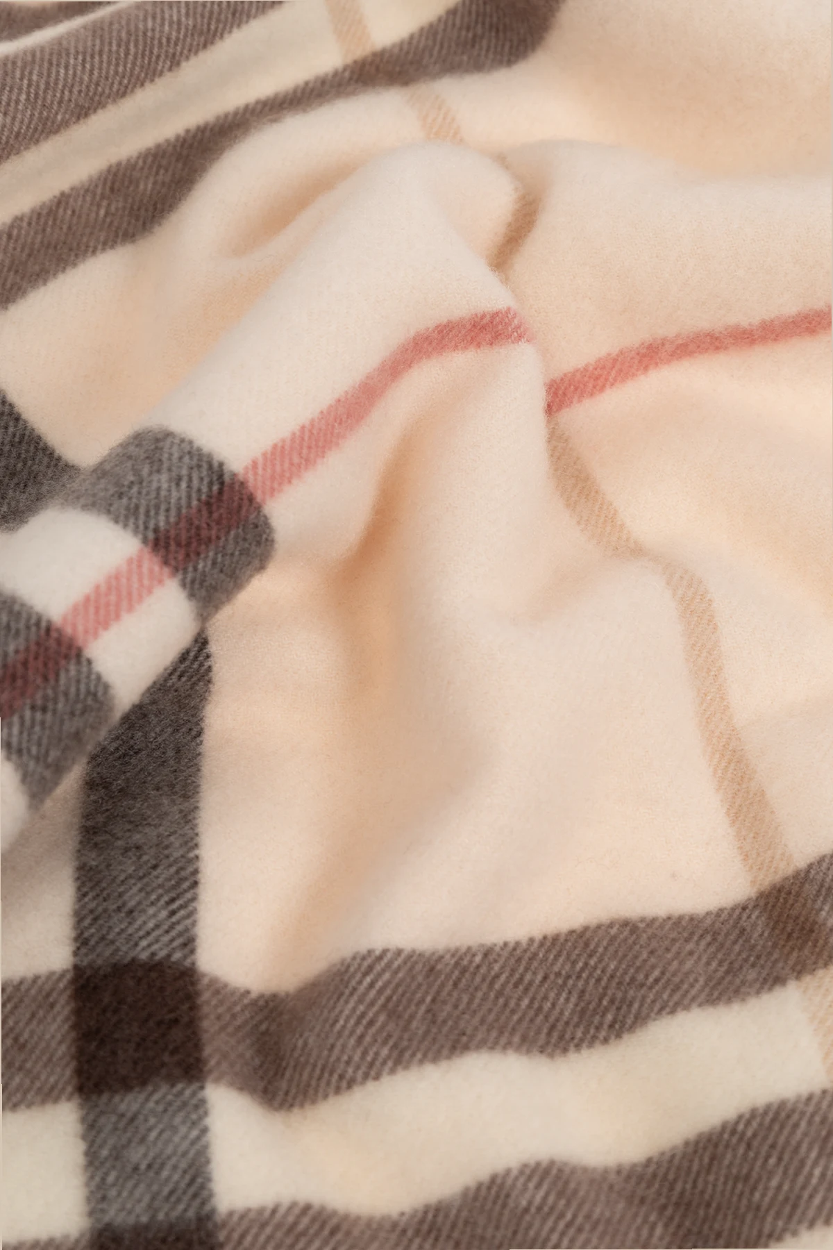 Charakterystyczny wzór w kratę, utrzymany w subtelnych odcieniach brązu, czerni i czerwieni, zdobi jasnoróżowe tło, tworząc harmonijną i ponadczasową kompozycję. Dodatkowym atutem są stylowe frędzle, które nadają szalowi lekkości i dynamizmu.