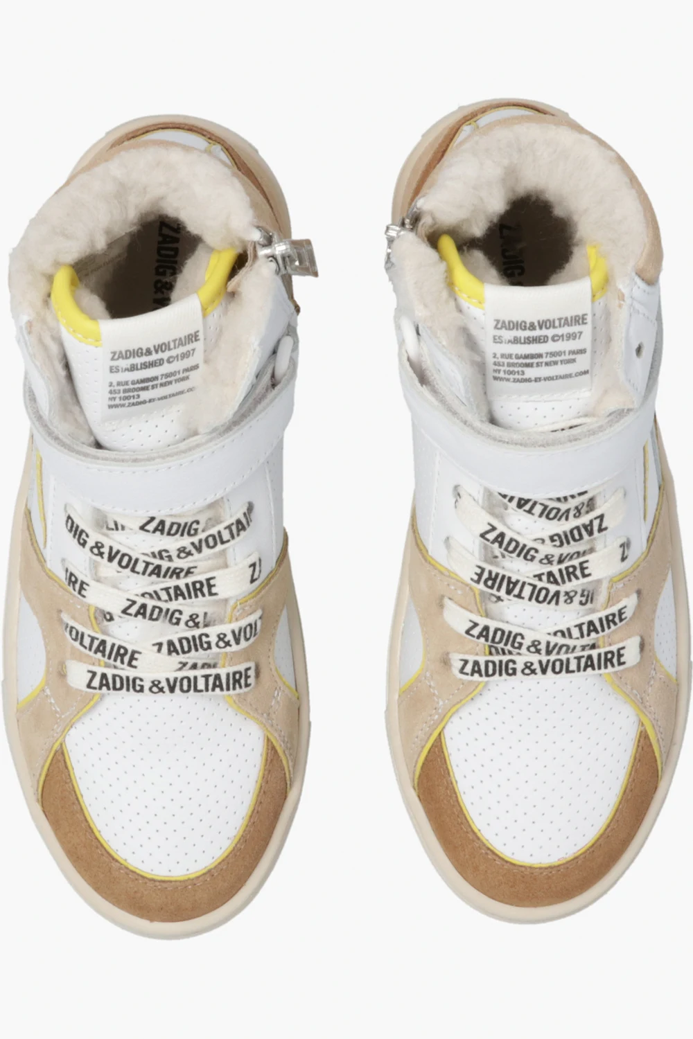 Biało-beżowo-żółte sznurowane buty za kostkę Zadig & Voltaire Kids. Wykonane ze skóry i materiału. Zapinane na suwak i rzep. Ozdobione przeszyciami i perforacją. Wykończone materiałem imitującym futro. Beżowa, gumowa podeszwa.