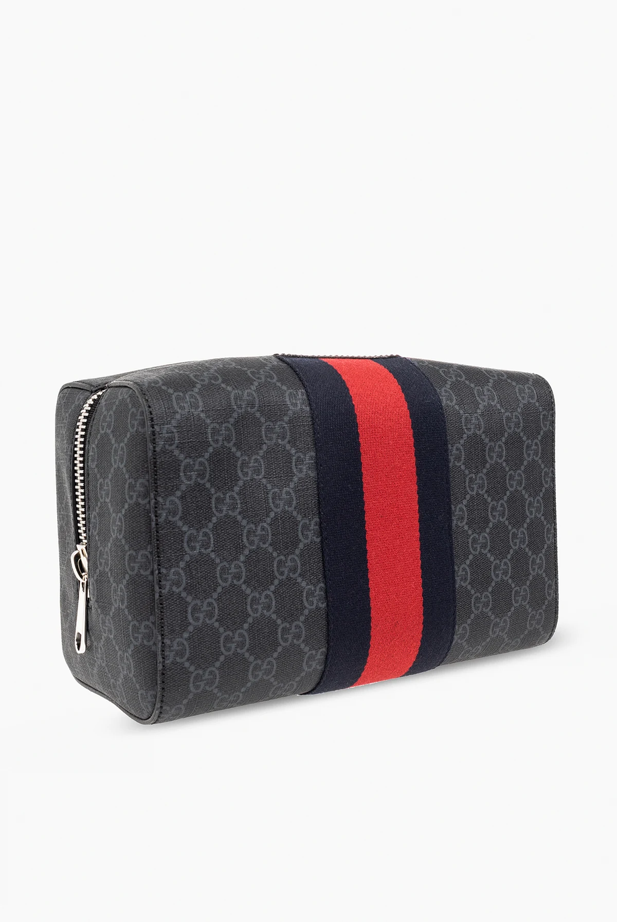 Czarno-szara kosmetyczka Gucci. Wykonana z płótna 'GG Supreme'. Zamykana na zamek. Ozdobiona charakterystycznym dla marki granatowo-czerwono-granatowym paskiem 'Web'. Warstwa wewnętrzna w kolorze czarnym. Wewnątrz komora i kieszeń zamykana na zamek. Metalowe wykończenie w kolorze srebrnym.