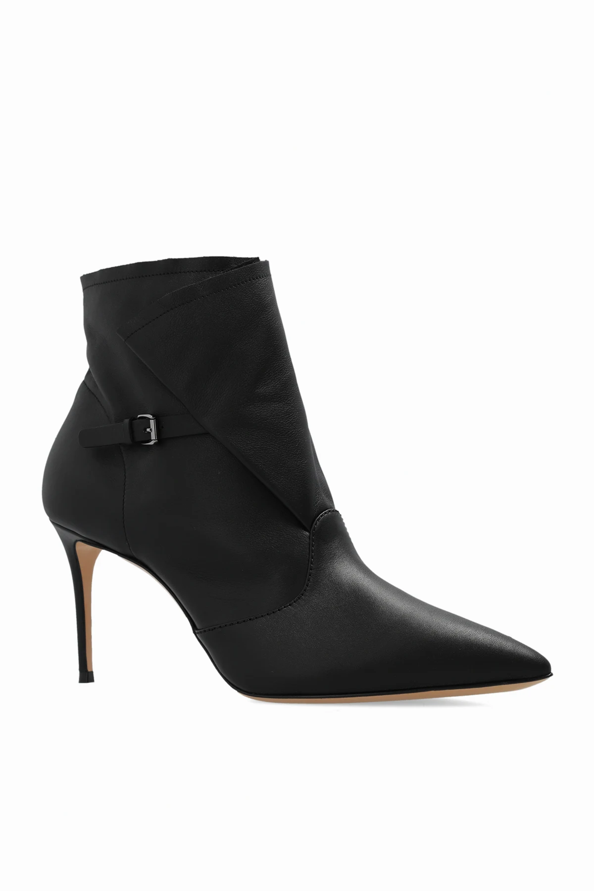 Czarne, skórzane botki na obcasie, model ‘Julia Kate’ Casadei. Dekoracyjnie marszczona cholewka zapinana na regulowany pasek z klamrą. Nosek w szpic. Beżowa, skórzana podeszwa.