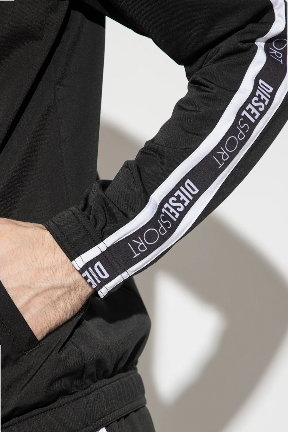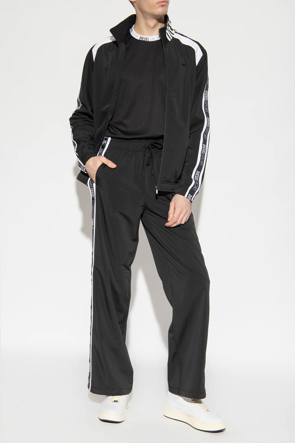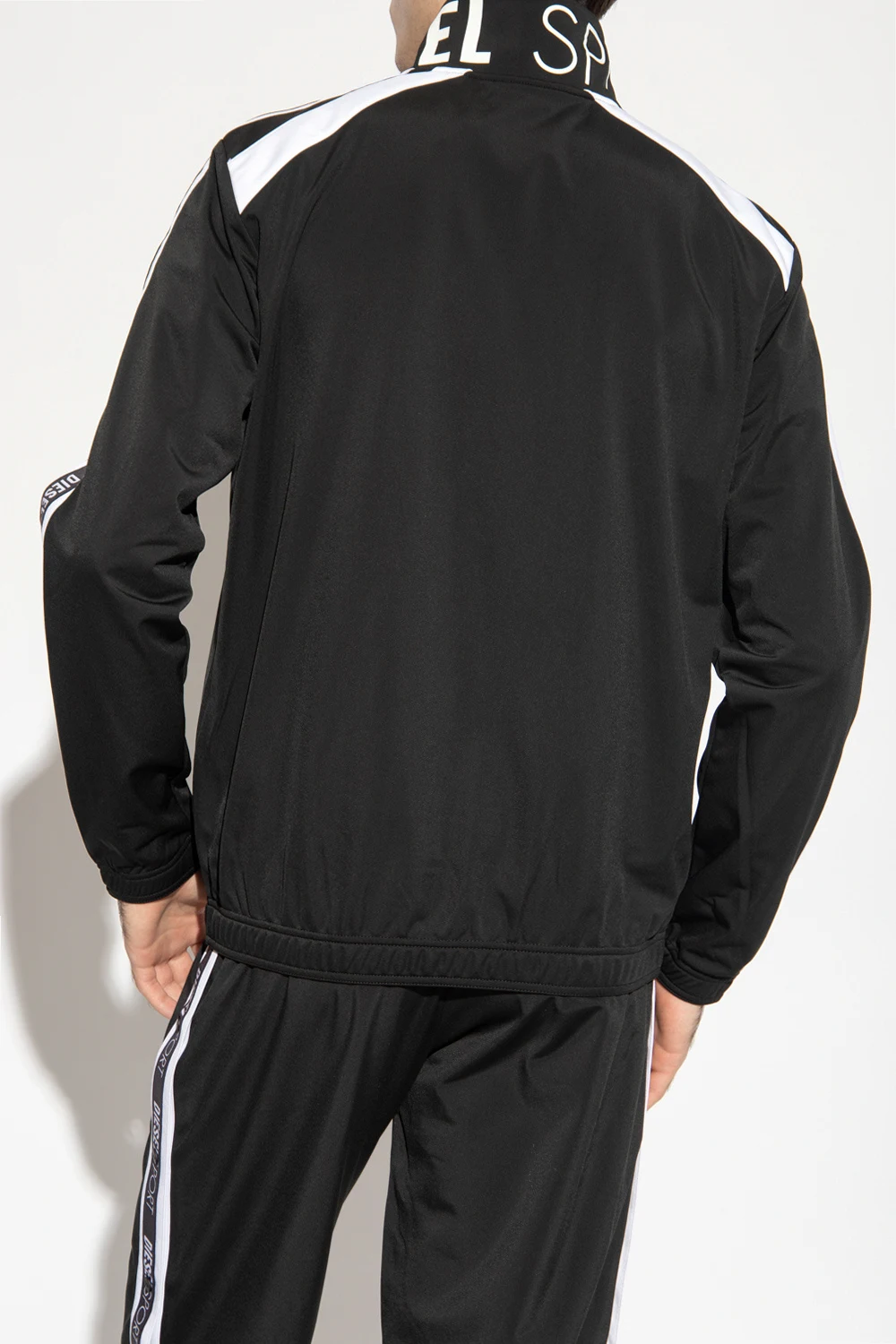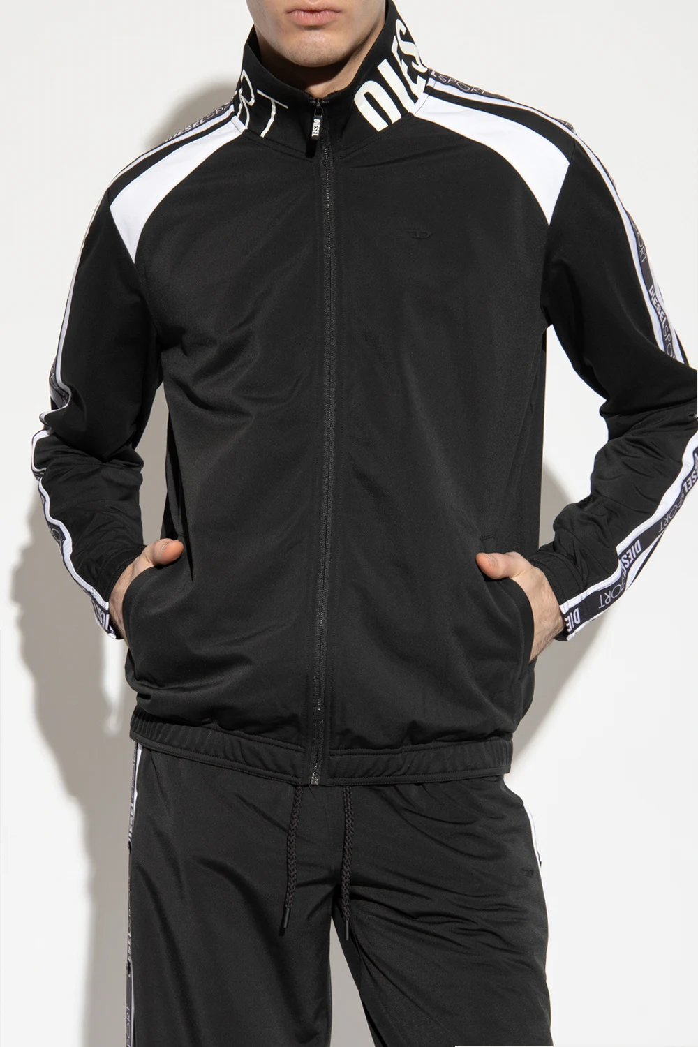 Czarno-biała bluza, model 'AMST-ETHEL-HT13' Diesel, kolekcja ‘DIESEL SPORT’. Zapinana na zamek. Na rękawach ozdobiona pasami z logo. Z przodu dwie wsuwane kieszenie. Długie rękawy i dół wykończone ściągaczem.