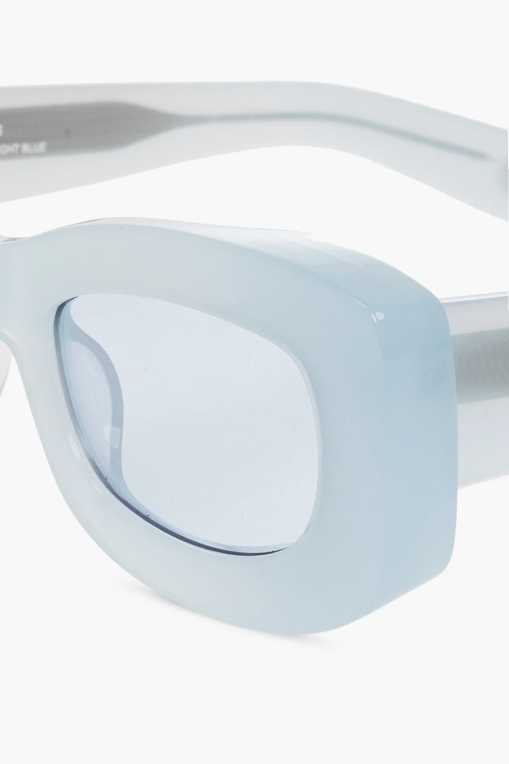 Jasnoniebieskie okulary przeciwsłoneczne, model ‘Whistle’ Etudes. Wykonane z acetatu. Prostokątne, zaokrąglone oprawki. Szerokie zauszniki z końcówkami ozdobionymi metalową aplikacją z logo. Niebieskie szkła ze 100% ochroną przeciw promieniom UV. Dołączone etui.