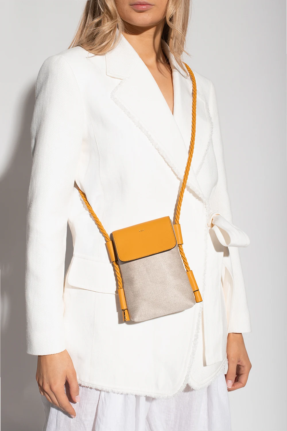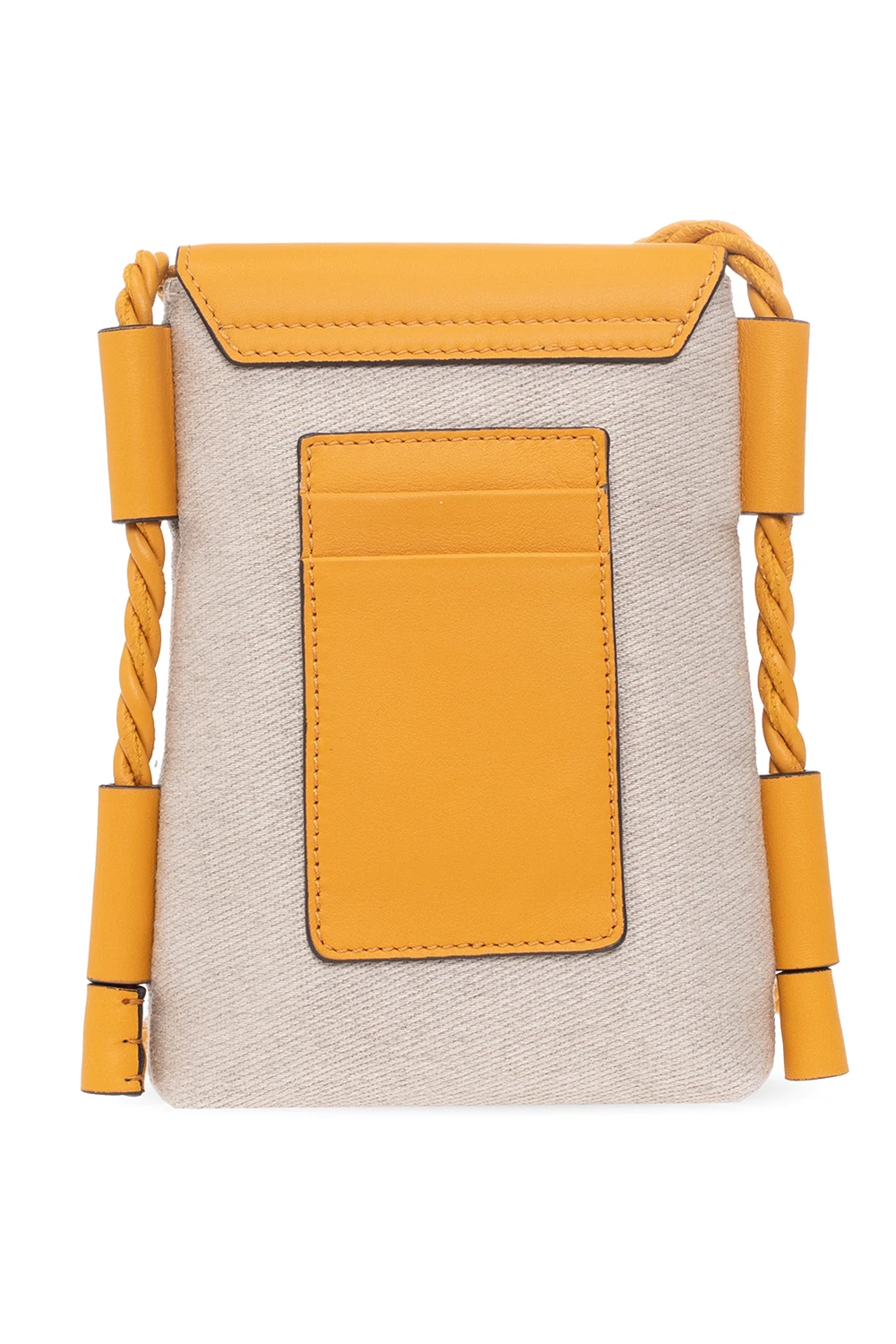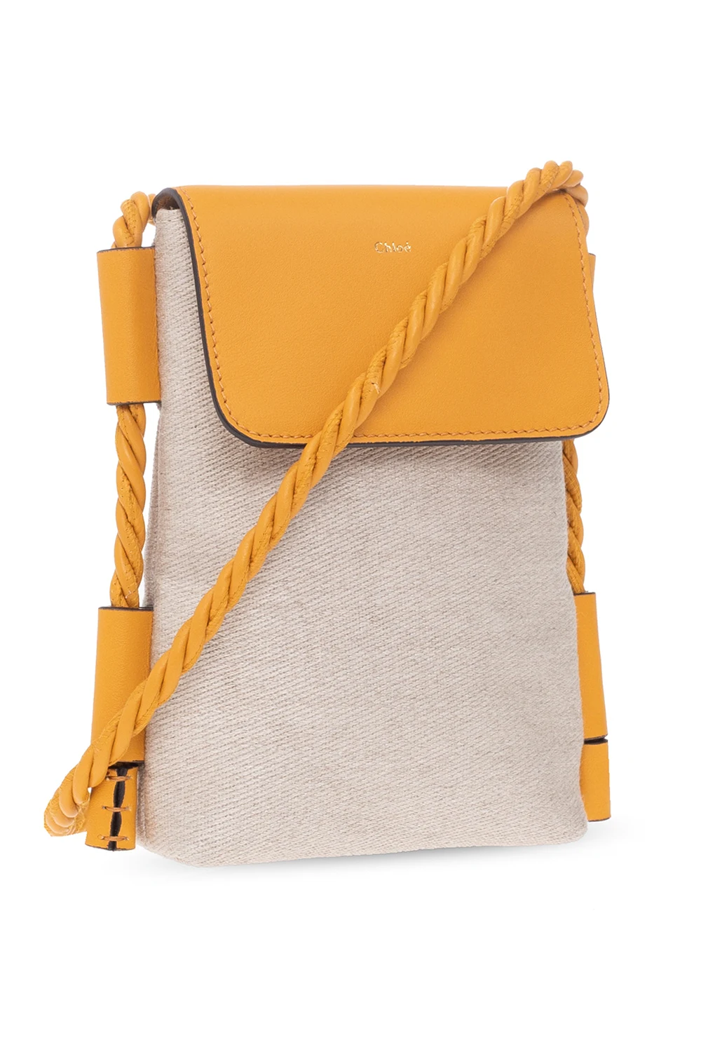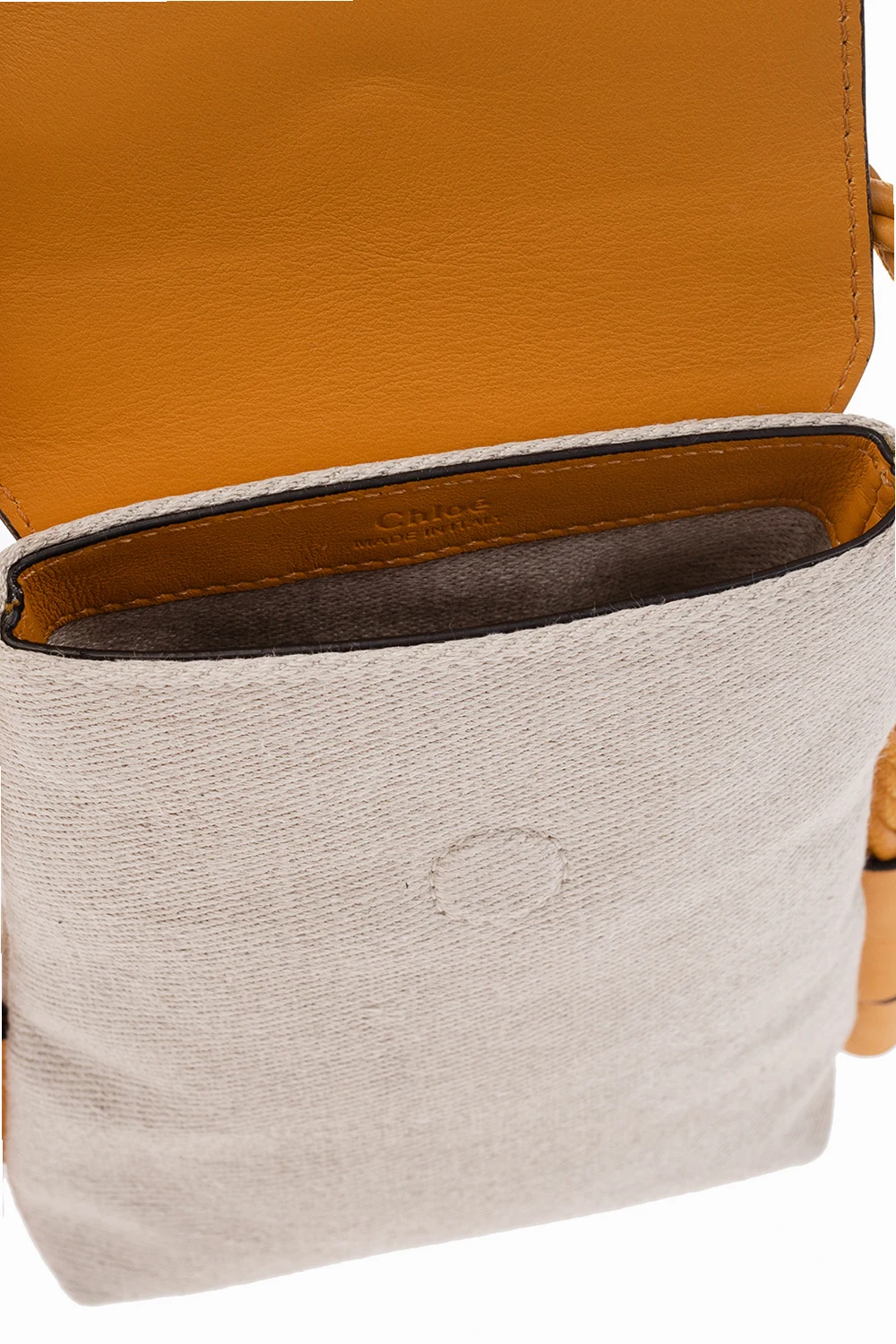 Pomarańczowo-beżowe etui na telefon Chloé. Wykonane z lnu i skóry cielęcej. Zamykane na magnetyczne zapięcie. Z przodu wytłoczone logo. Z tyłu dwa miejsca na karty. Regulowany, pleciony pasek. Wewnątrz komora. Metalowe elementy w kolorze złotym.