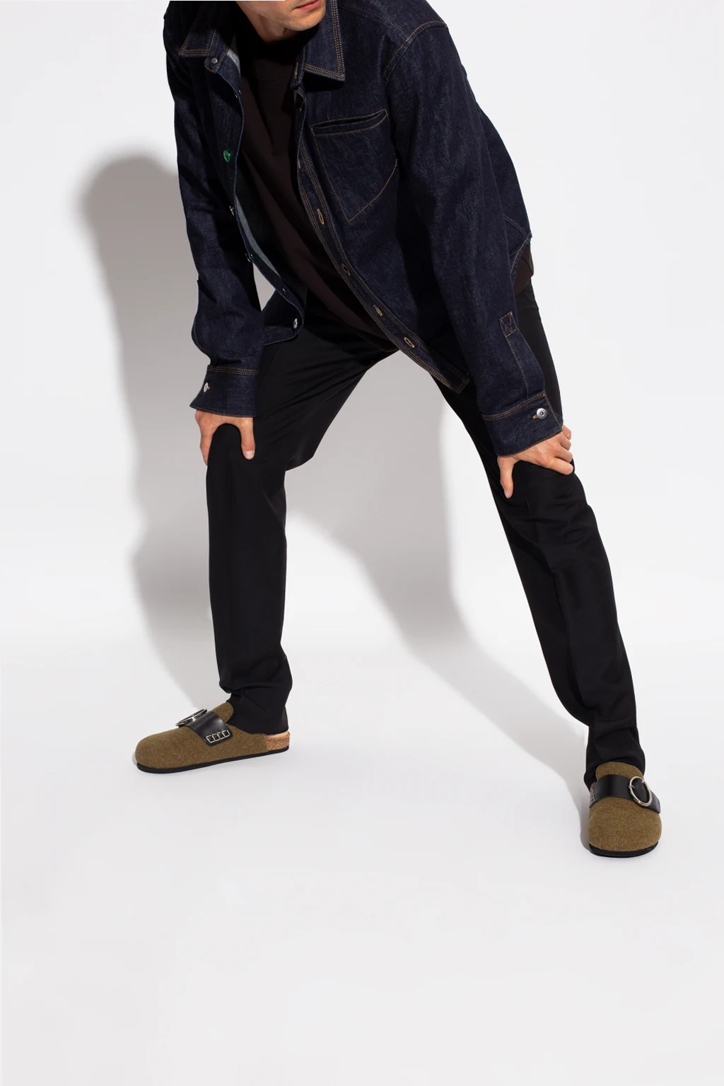 Zielono-brązowo-czarne klapki J.W. Anderson. Wykonane z filcu. Z przodu czarny skórzany pasek z klamrą w kolorze srebrnym z wytłoczonym logo. Czarna, gumowa podeszwa.
