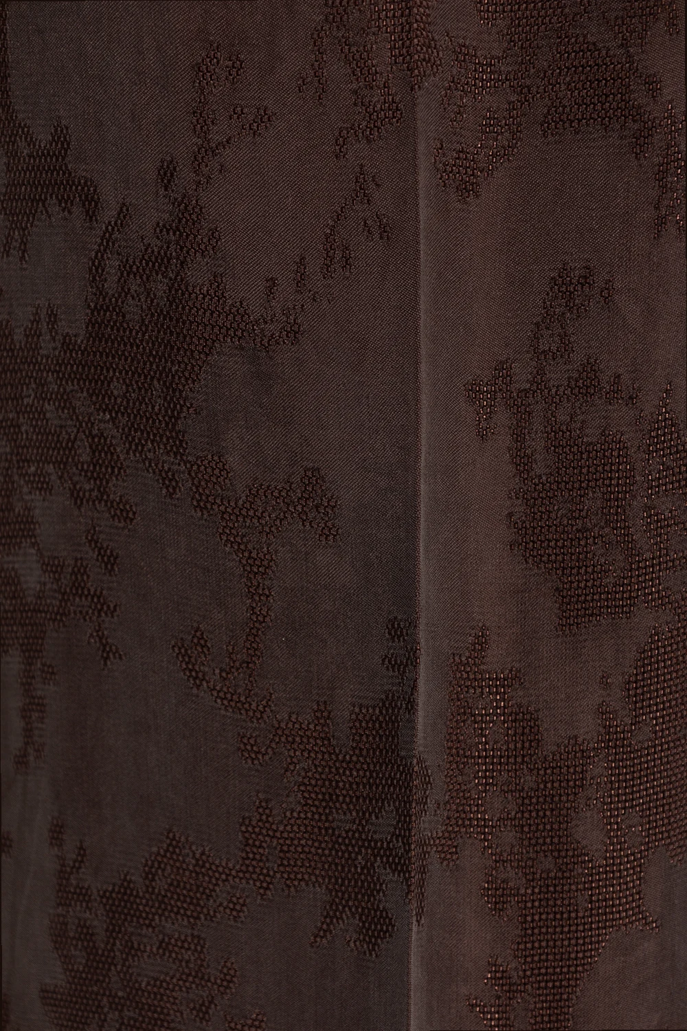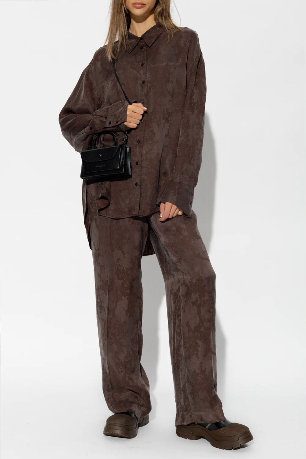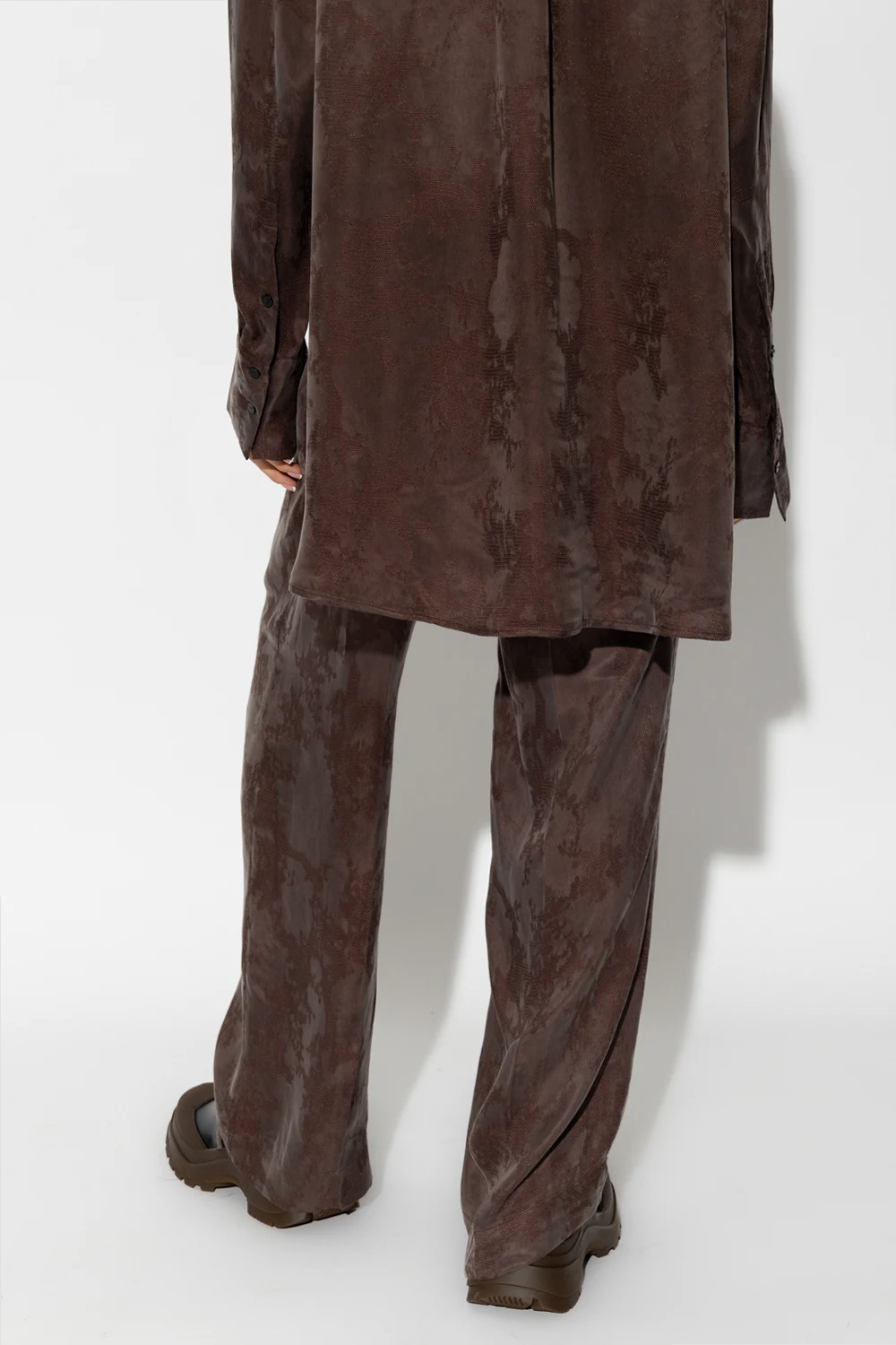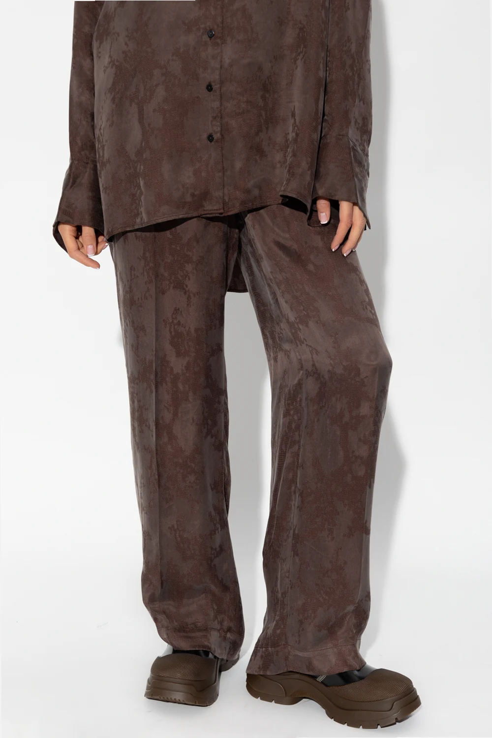 Brązowe spodnie o luźnym kroju, model ‘Pinky’ Birgitte Herskind. Wykonane częściowo z materiału z certyfikatem FSC. W pasie wszyta guma. Ozdobione żakardowym wzorem. Cztery kieszenie: po dwie wsuwane z przodu oraz z tyłu. Długie nogawki o prostym kroju.
