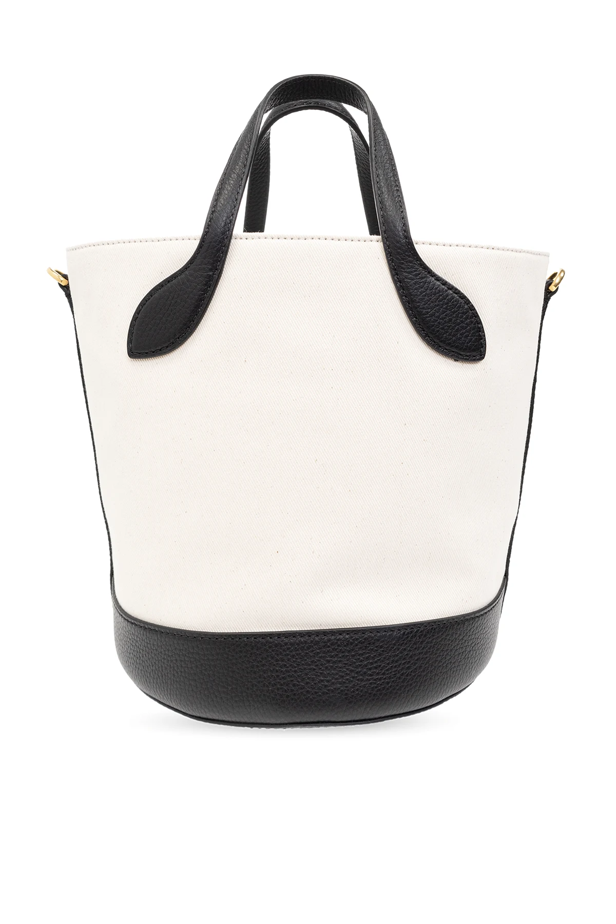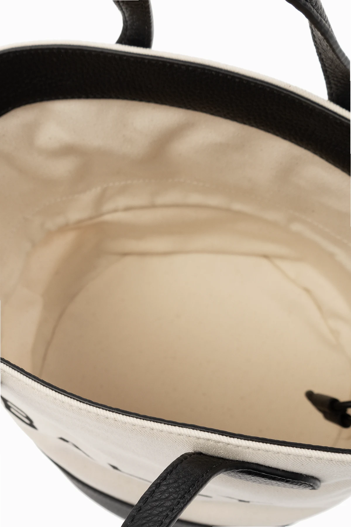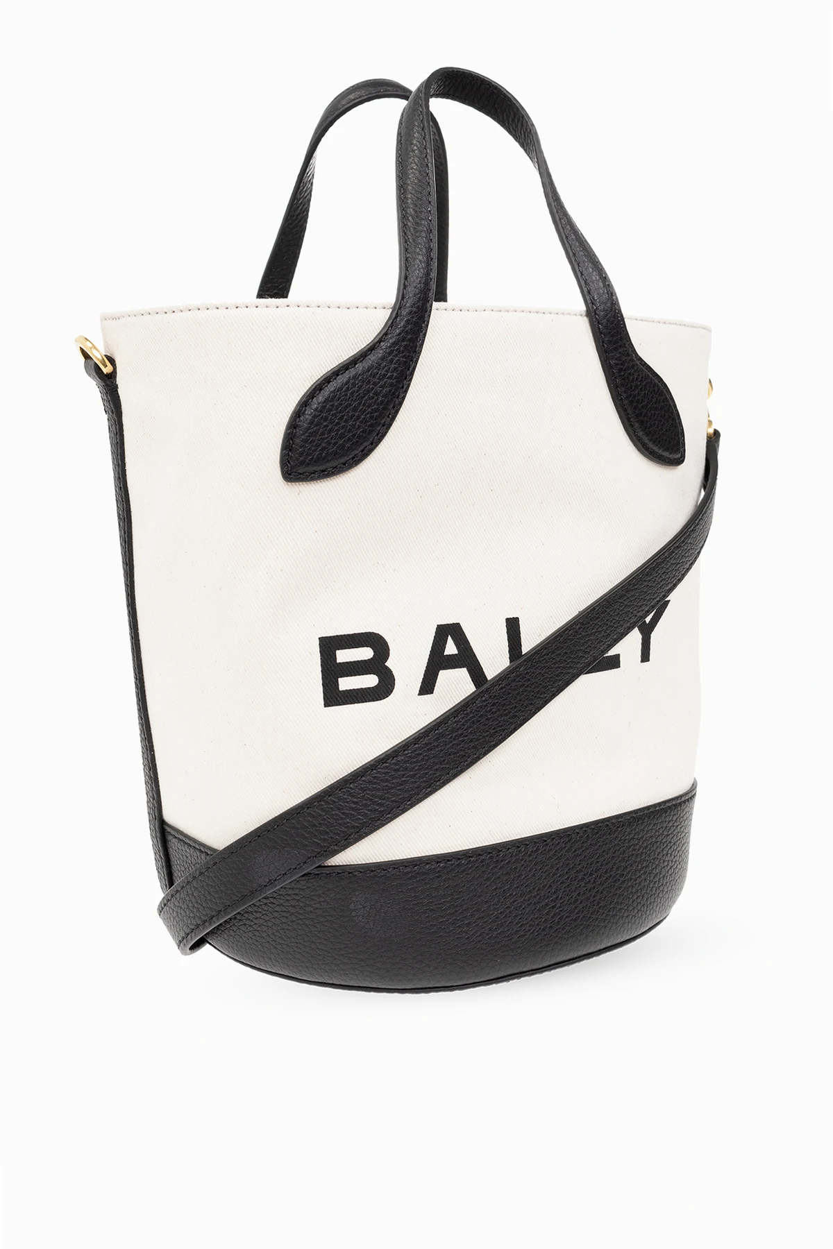 Kremowo-czarna torba typu ‘bucket’, model ‘Bar 8 Hours’ Bally. Wykonana z materiału i skóry. Z przodu ozdobiona nadrukowanym logo. Dwie półokrągłe rączki. Odpinany, regulowany pasek na ramię. Wewnątrz komora. Metalowe elementy w kolorze złotym.
