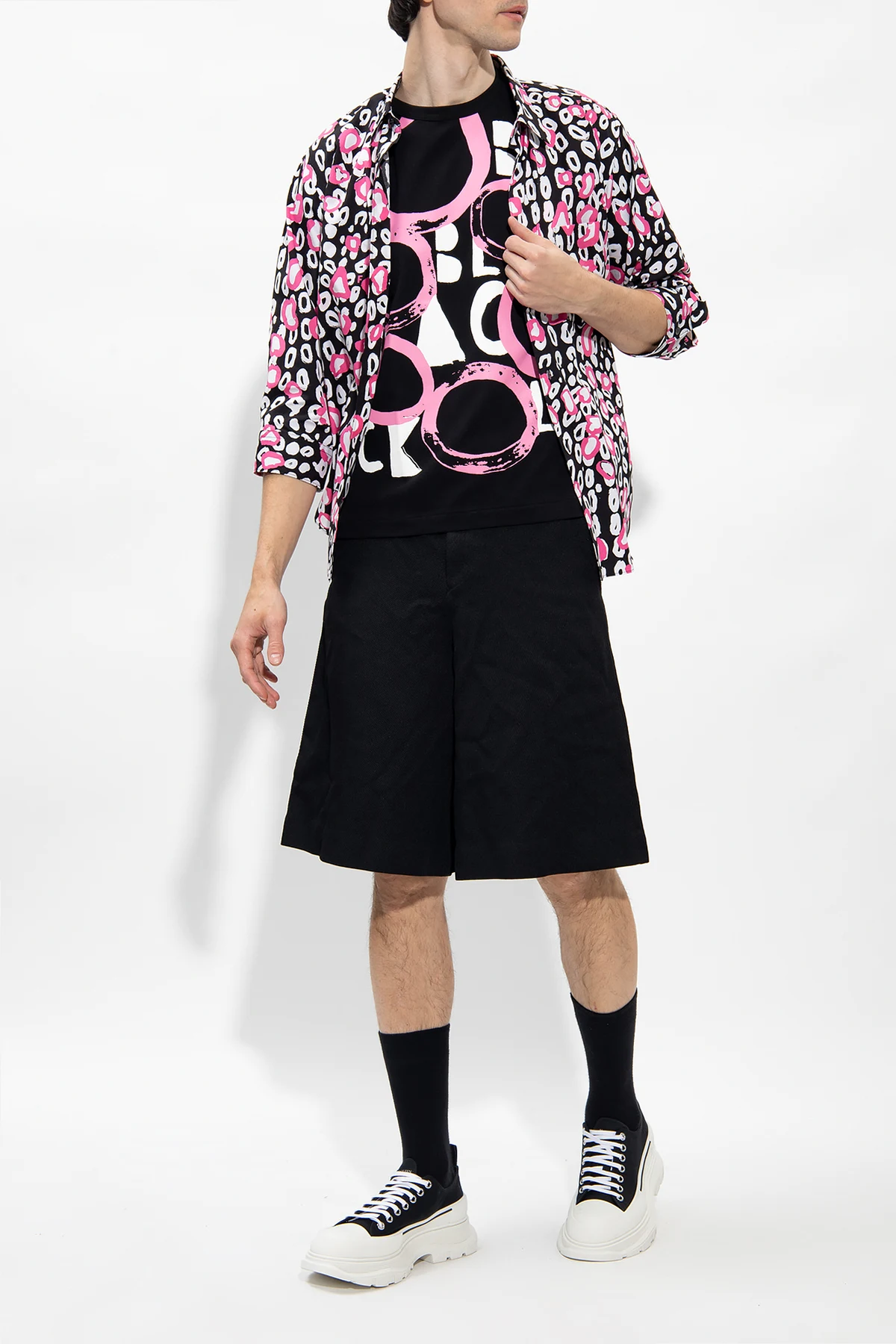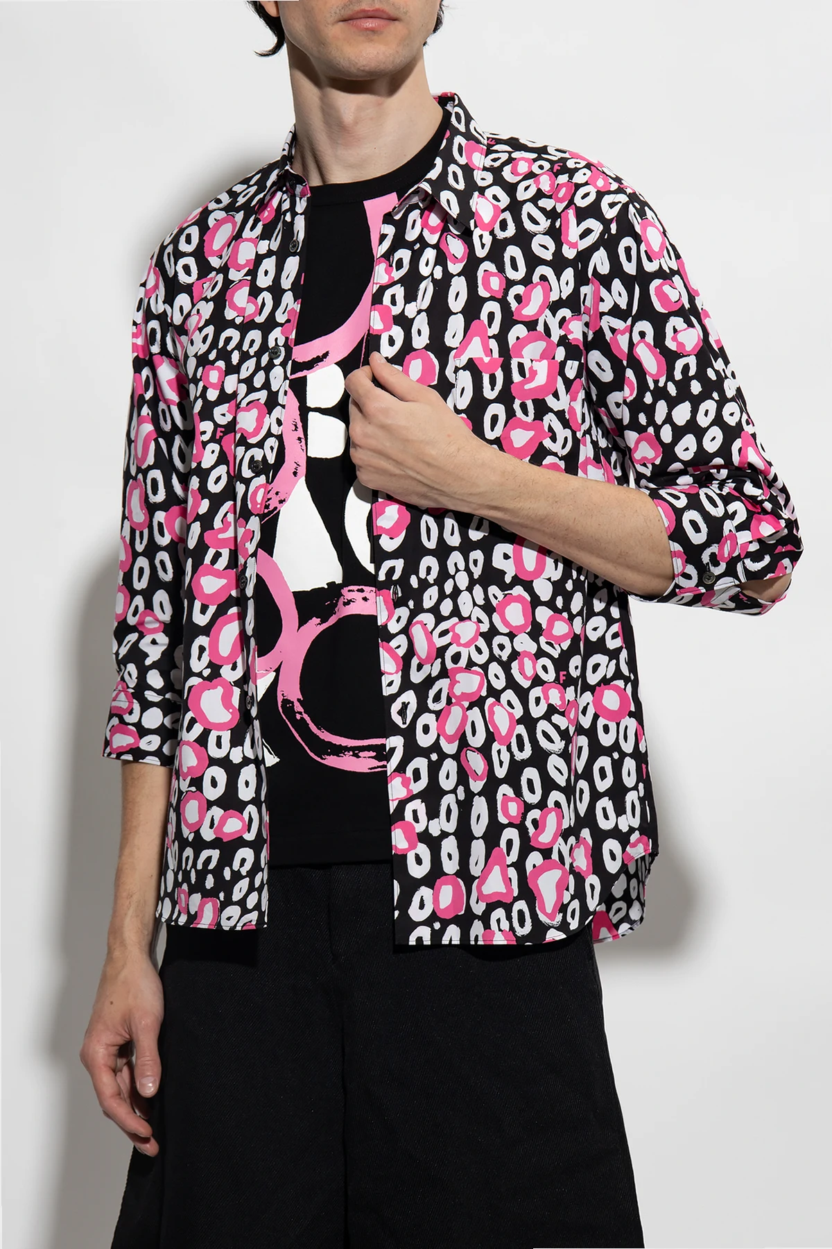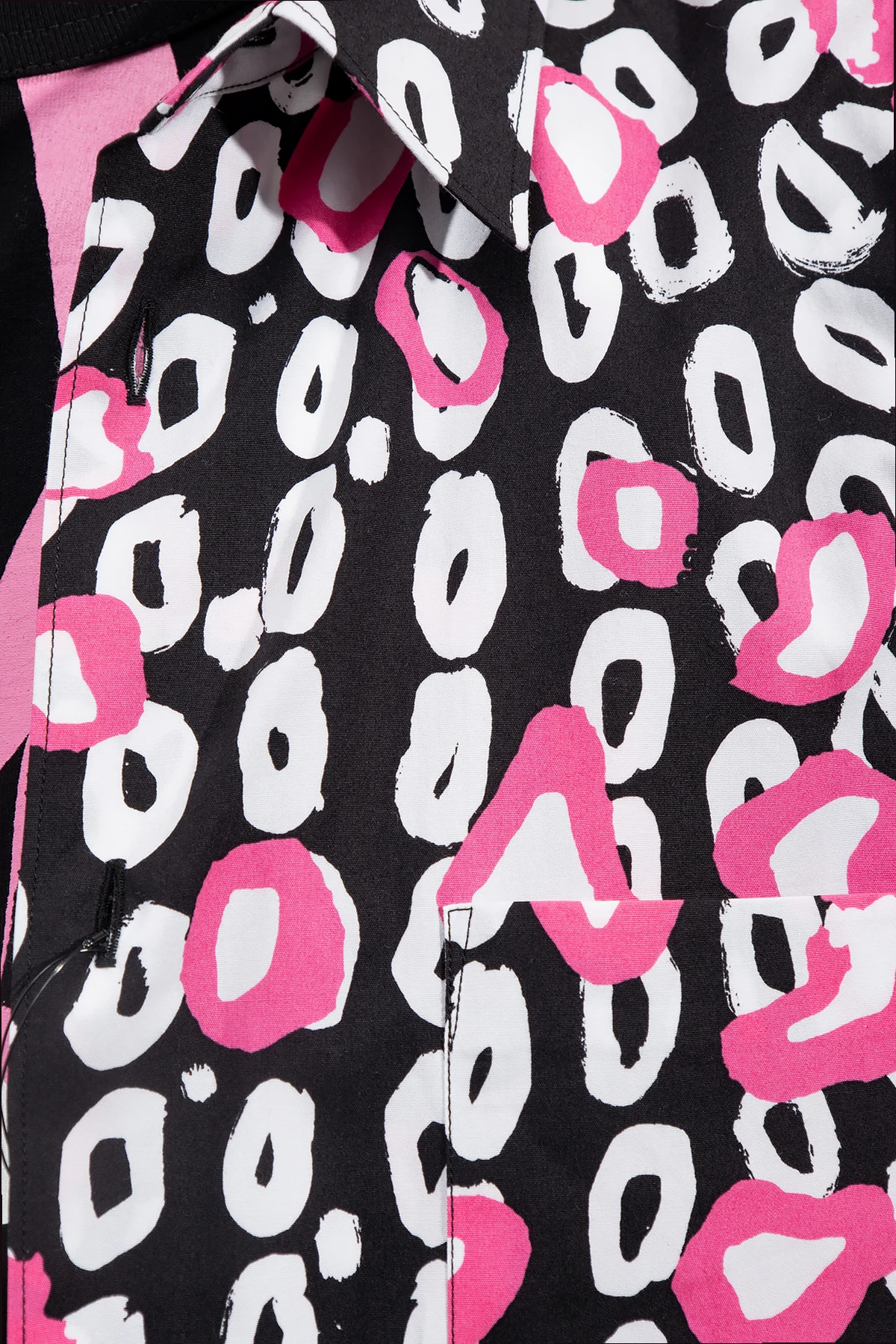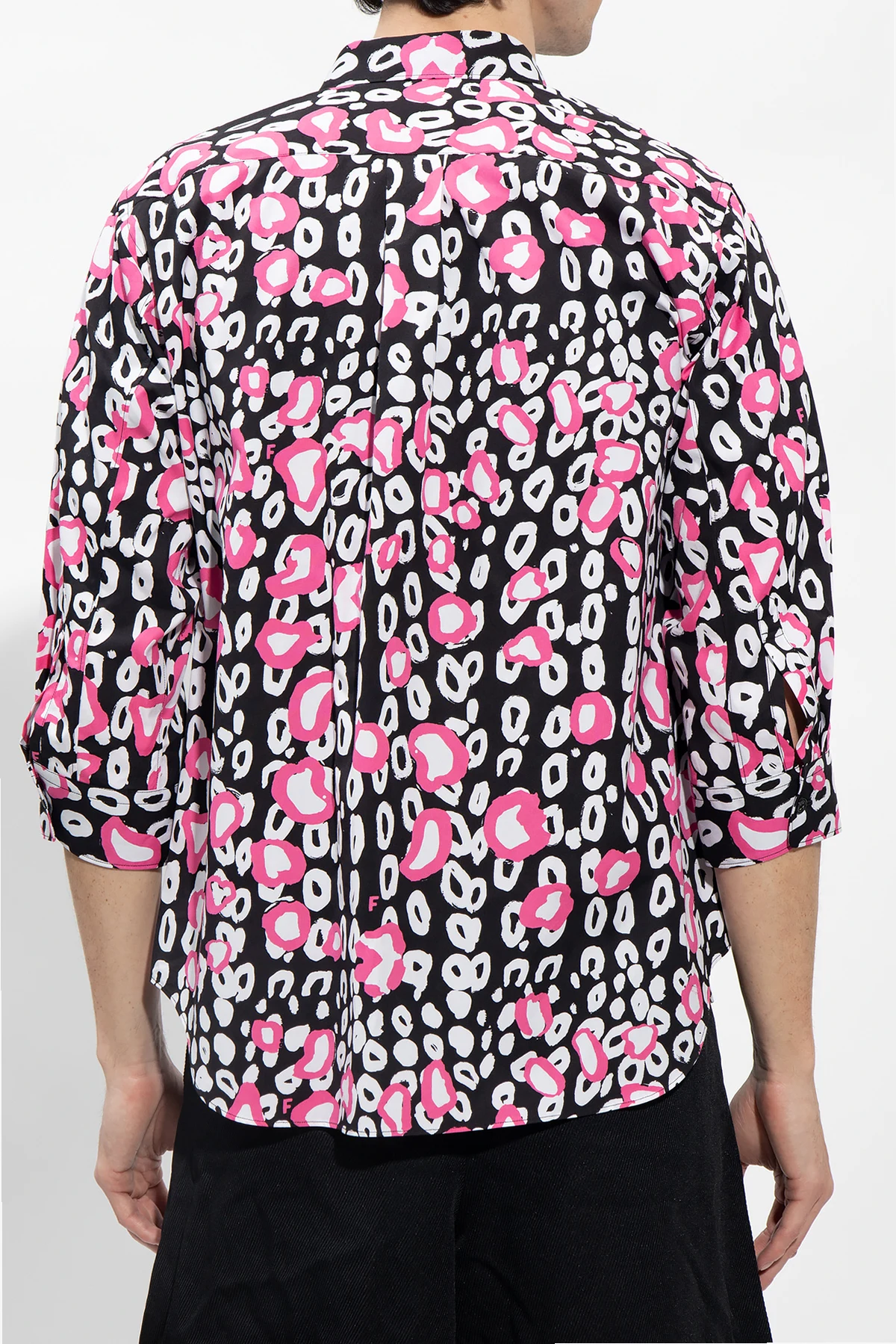 Czarna, bawełniana koszula Comme Des Garcons Black. Zapinana na guziki. Ozdobiona różowo-białym wzorem. Z przodu wsuwana kieszeń. Długie rękawy zakończone mankietem zapinanym na guziki.