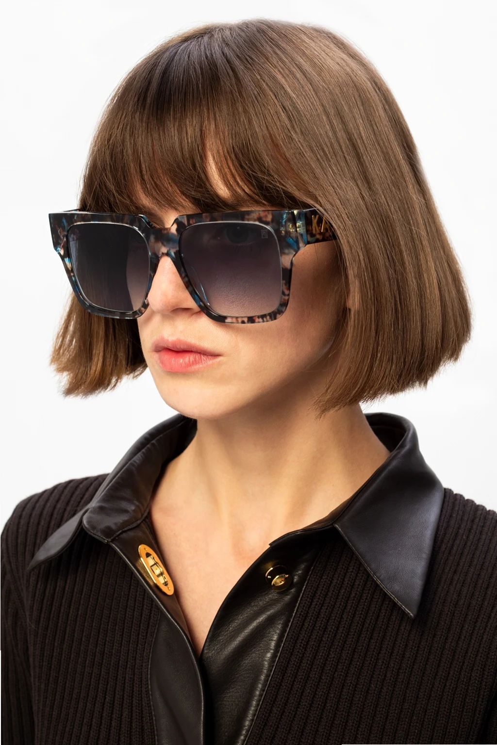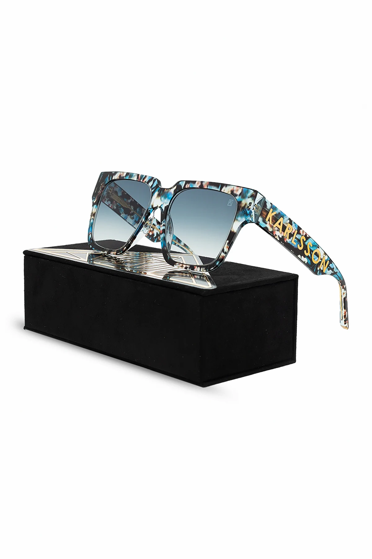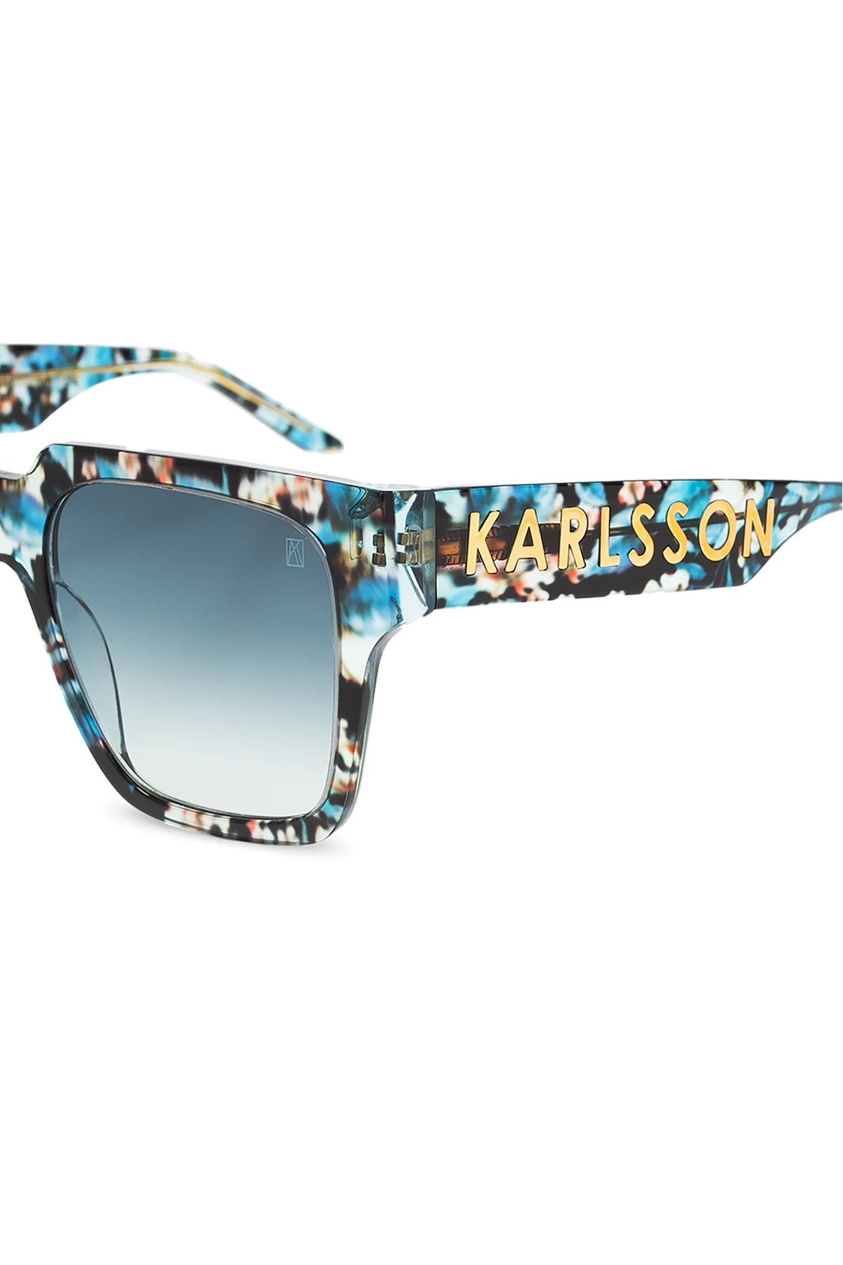 Okulary przeciwsłoneczne w kolorze zielono-czarno-brązowym, model ‘Coco Logo’ Anna Karin Karlsson. Ozdobione aplikacją z logo w kolorze złotym pokrytym 24-karatowym złotem. Niebieskie, certyfikowane soczewki UVA/UVB. Dołączone etui.