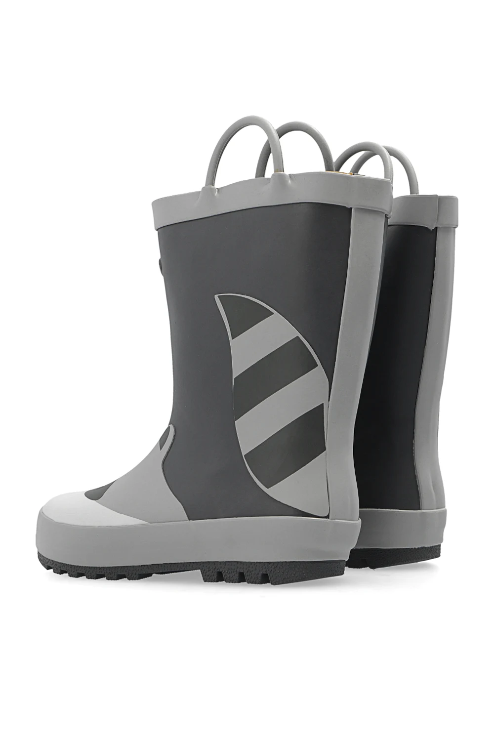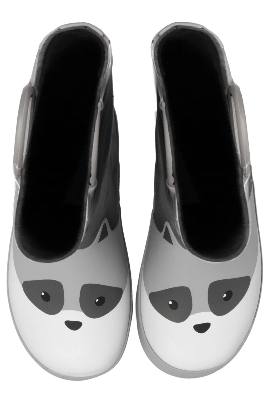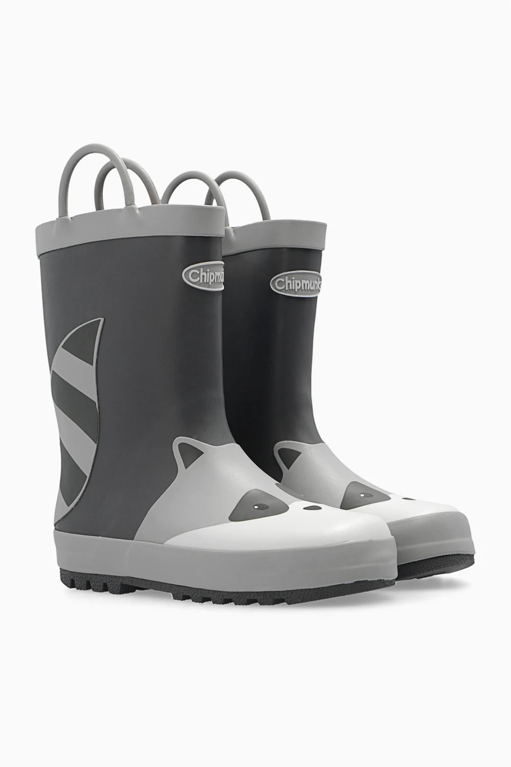 Szaro-czarno-białe, wodoodporne kalosze, model ‘River Racoon’ Chipmunks. Ozdobione wzorem z motywem zwierzęcym oraz wypukłym logo. Dwie półokrągłe rączki ułatwiające wsuwanie. Tekstylne wnętrze. Szara, gumowa podeszwa.