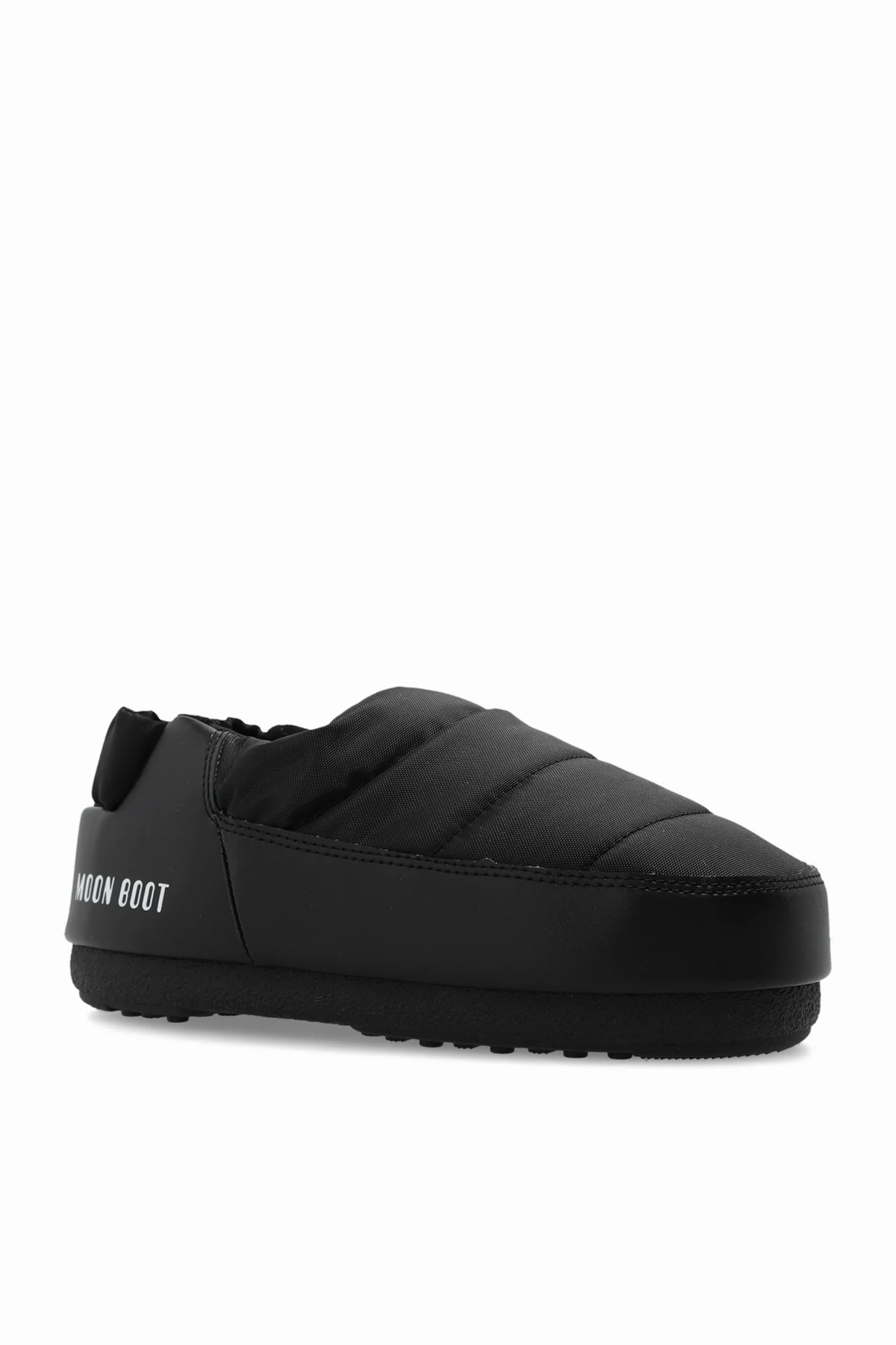 Czarne, wsuwane buty, model ‘Band Nylon’ Moon Boot. Z tyłu elastyczny pasek. Ozdobione białym, nadrukowanym logo. Przyssawki na czarnej, gumowej podeszwie bieżnika, zapewniają przyczepność w każdym terenie.