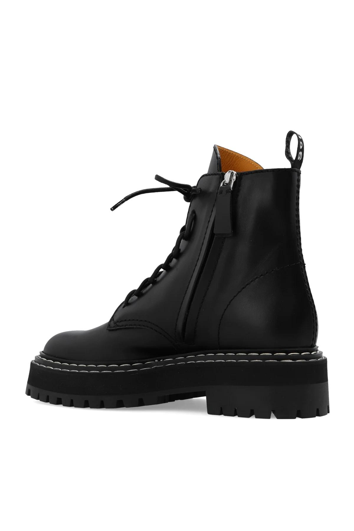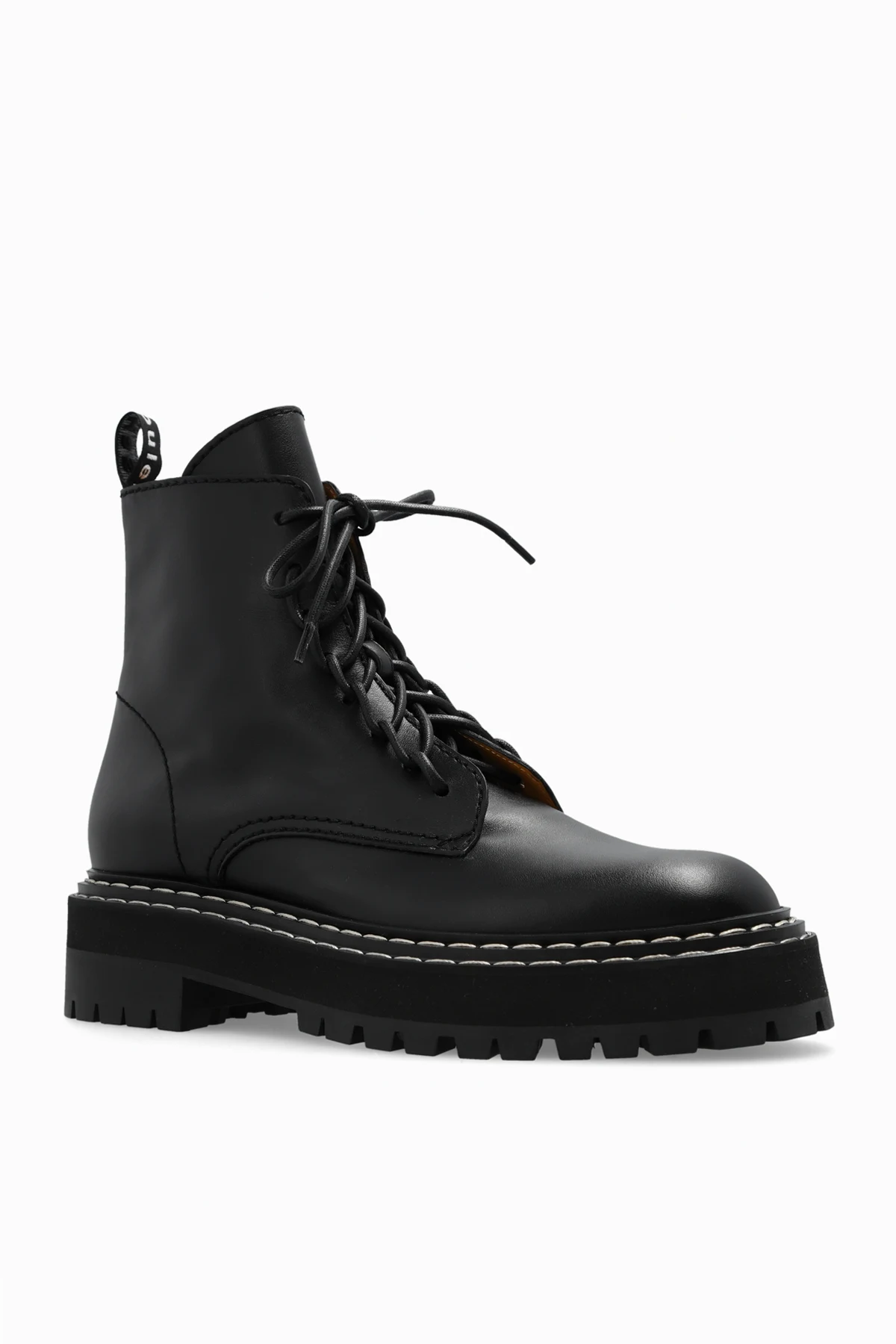 Czarne buty typu ‘combat’ Proenza Schouler. Wykonane ze skóry. Z boku zapinane na zamek. Dekoracyjnie sznurowane. Z tyłu uchwyt z logo. Przeszycia w kolorze białym. Czarna, gumowa podeszwa.