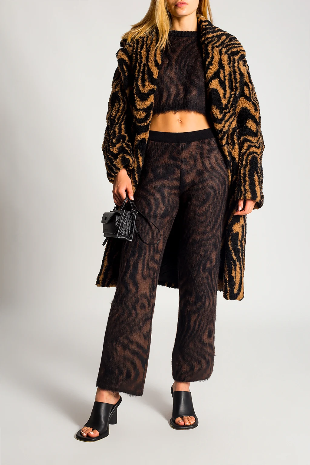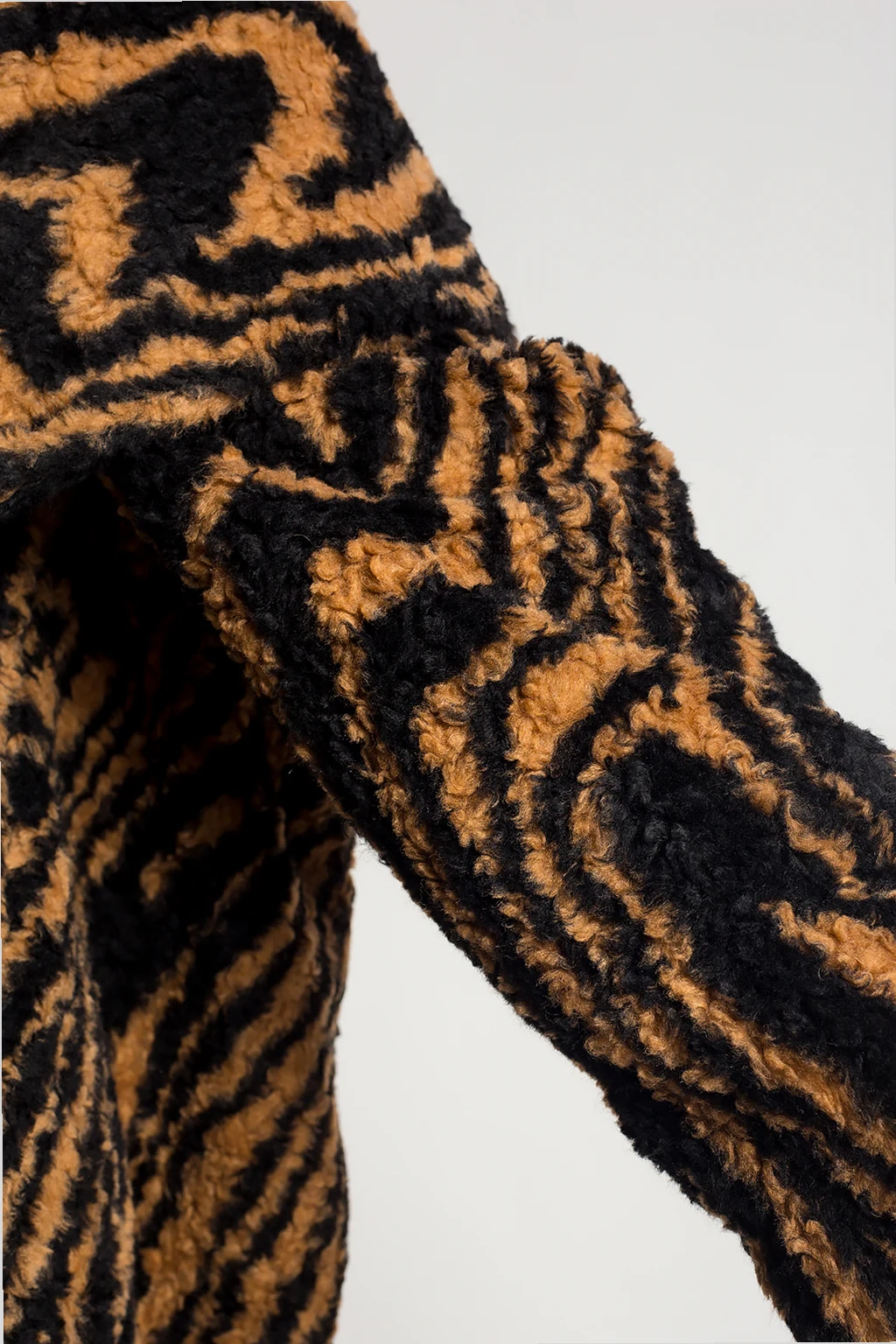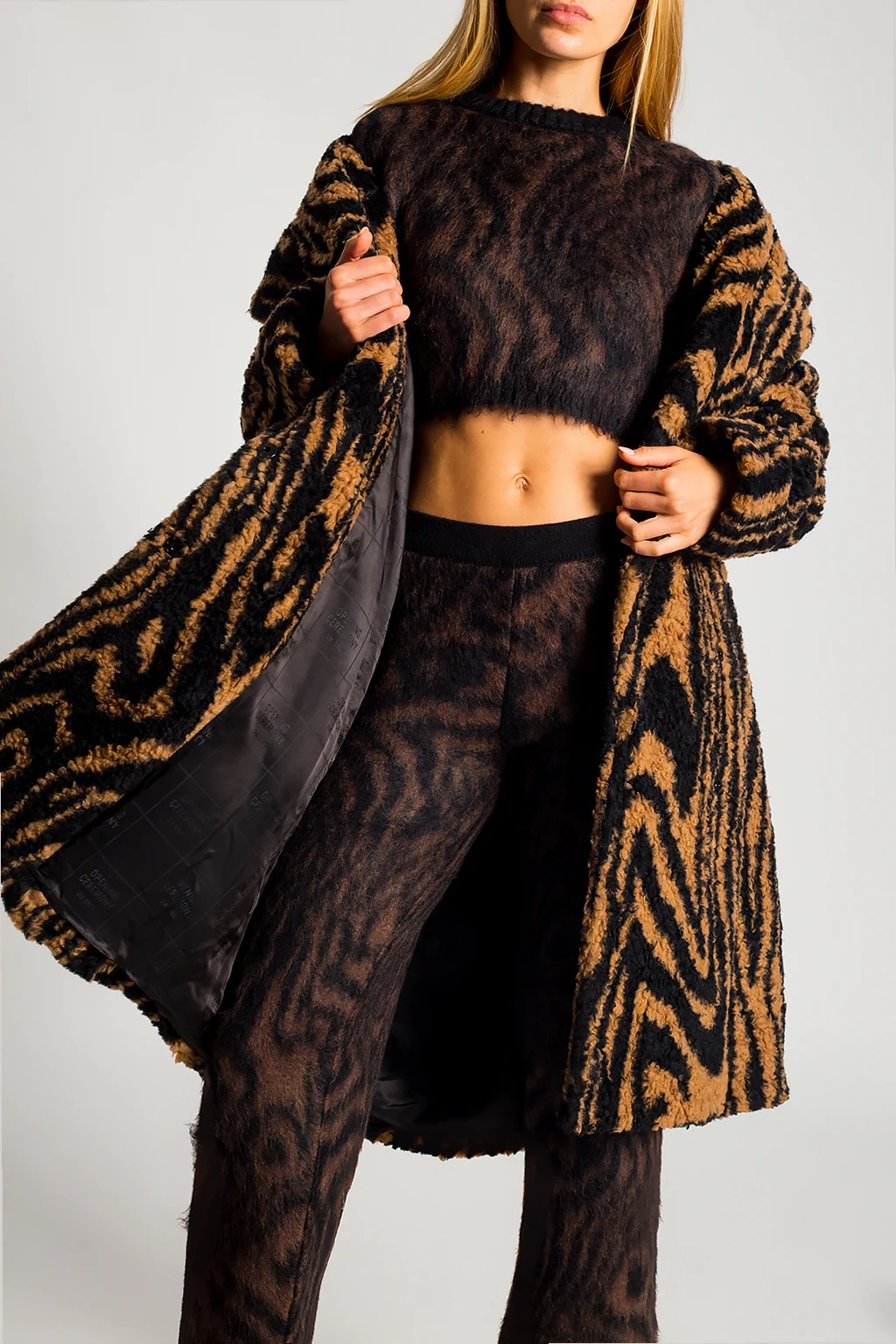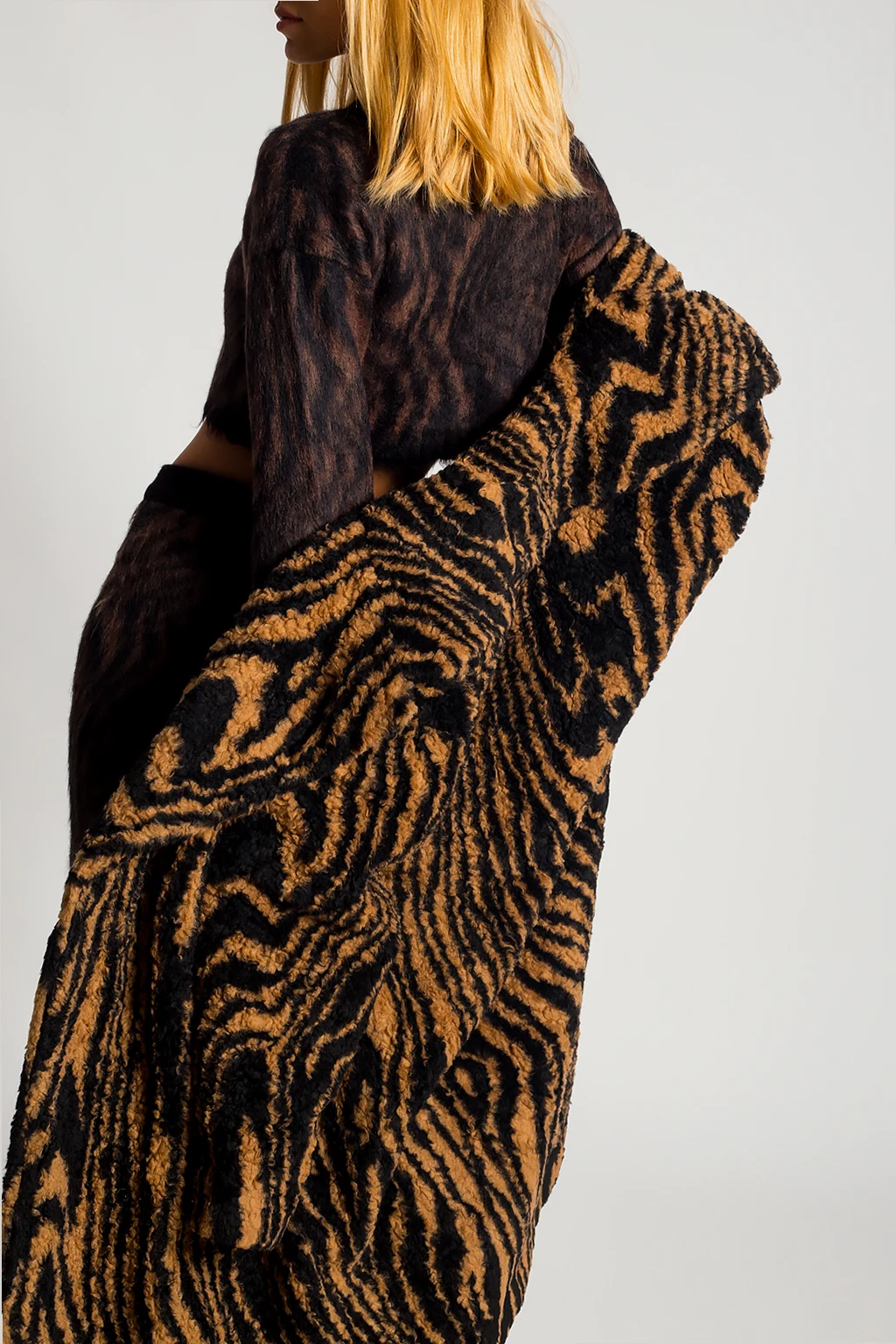 Brązowo-czarny płaszcz Opening Ceremony. Wykonany z materiału imitującego futro. Zapinany na zatrzaski. Otwarte klapy. Ozdobiony wzorem. Z przodu dwie wsuwane kieszenie.