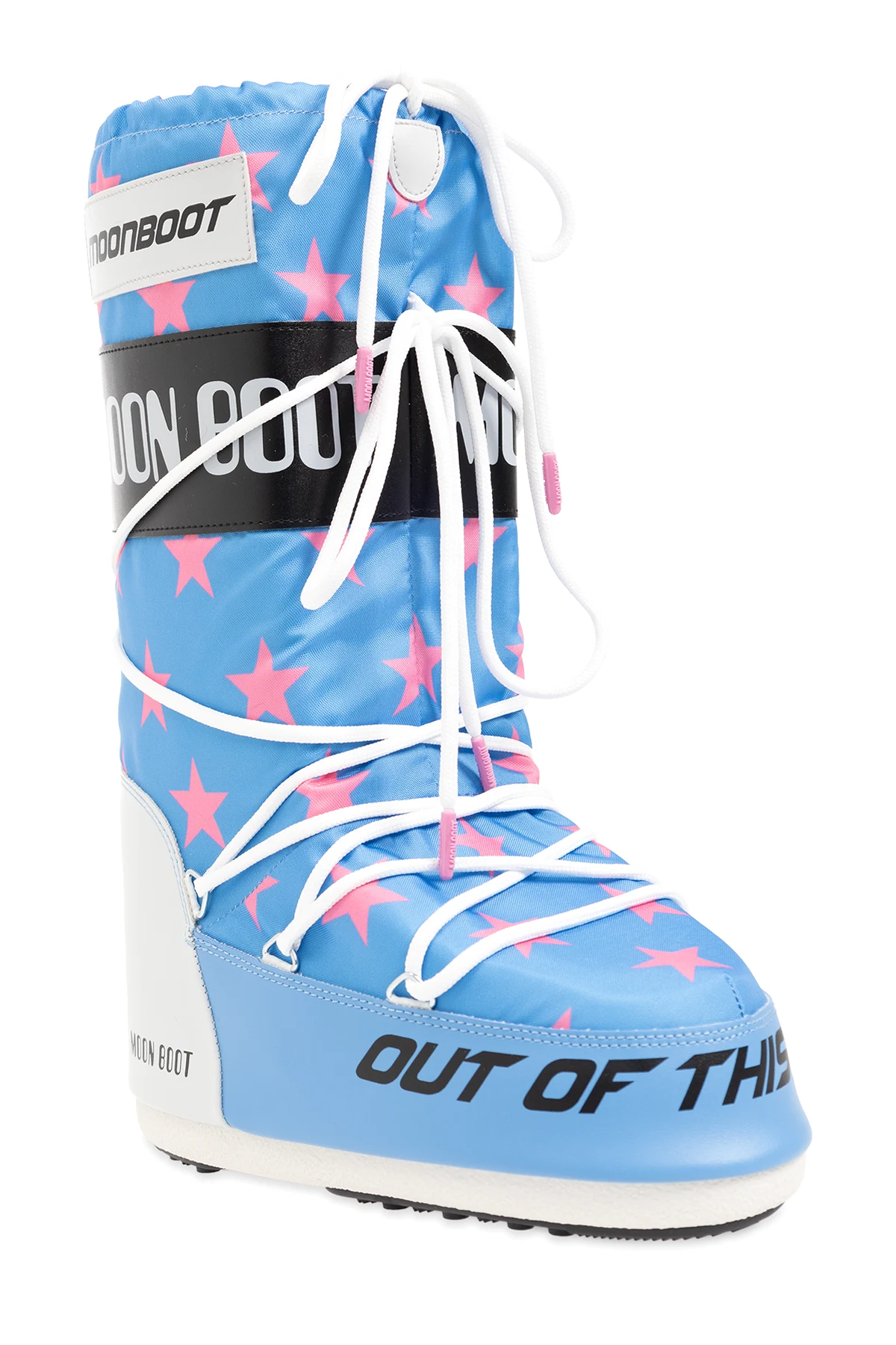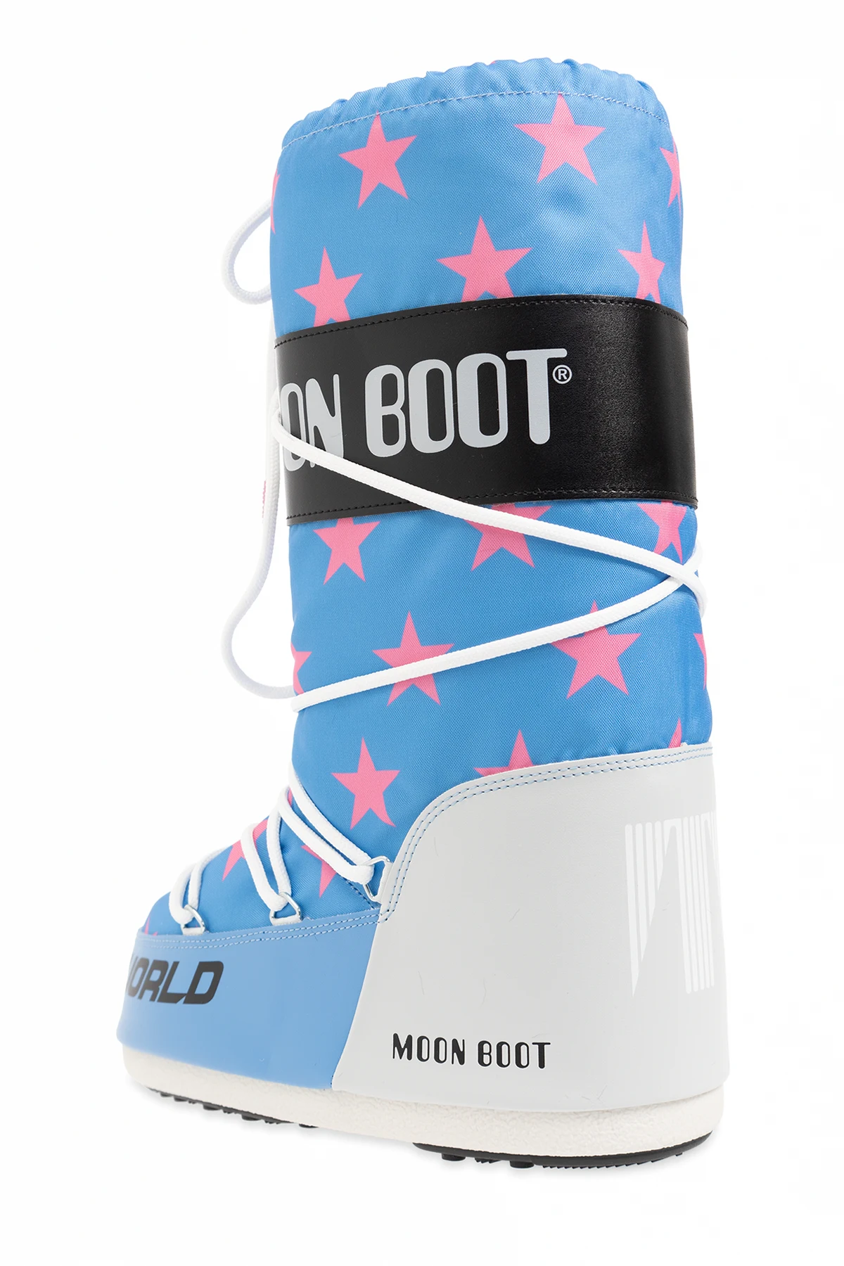 Kolorowe, wodoodporne śniegowce, model ‘Icon Retrobiker’ Moon Boot. Krzyżowe sznurowadła rurkowe (nie należy ich używać do ściągania butów). Góra wykończona ściągaczem. Ozdobione nadrukowanym logo i wzorem z motywem gwiazd. Przyssawki na czarno-białej, gumowej podeszwie bieżnika, zapewniają przyczepność w każdym terenie. Metalowe elementy w kolorze srebrnym.