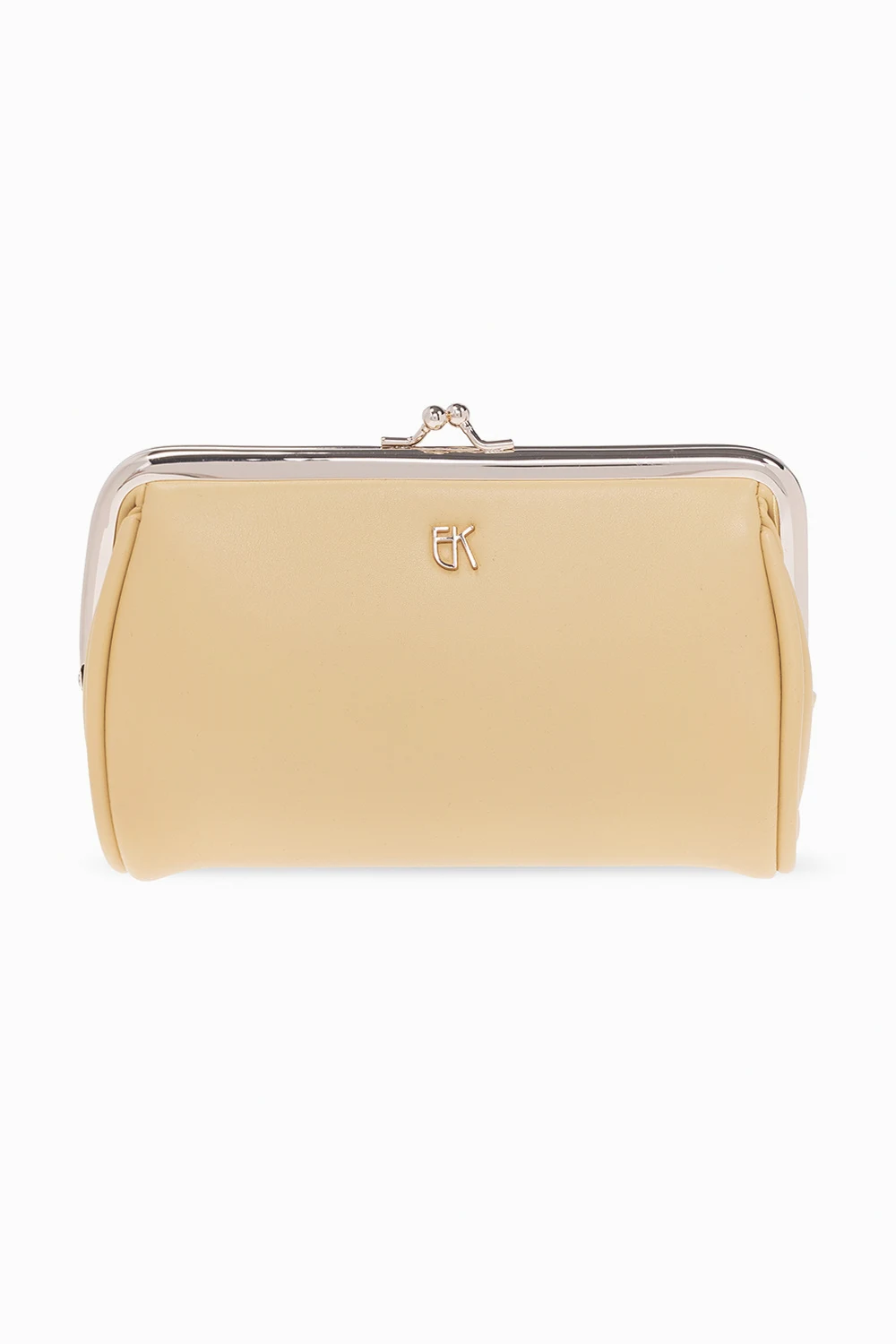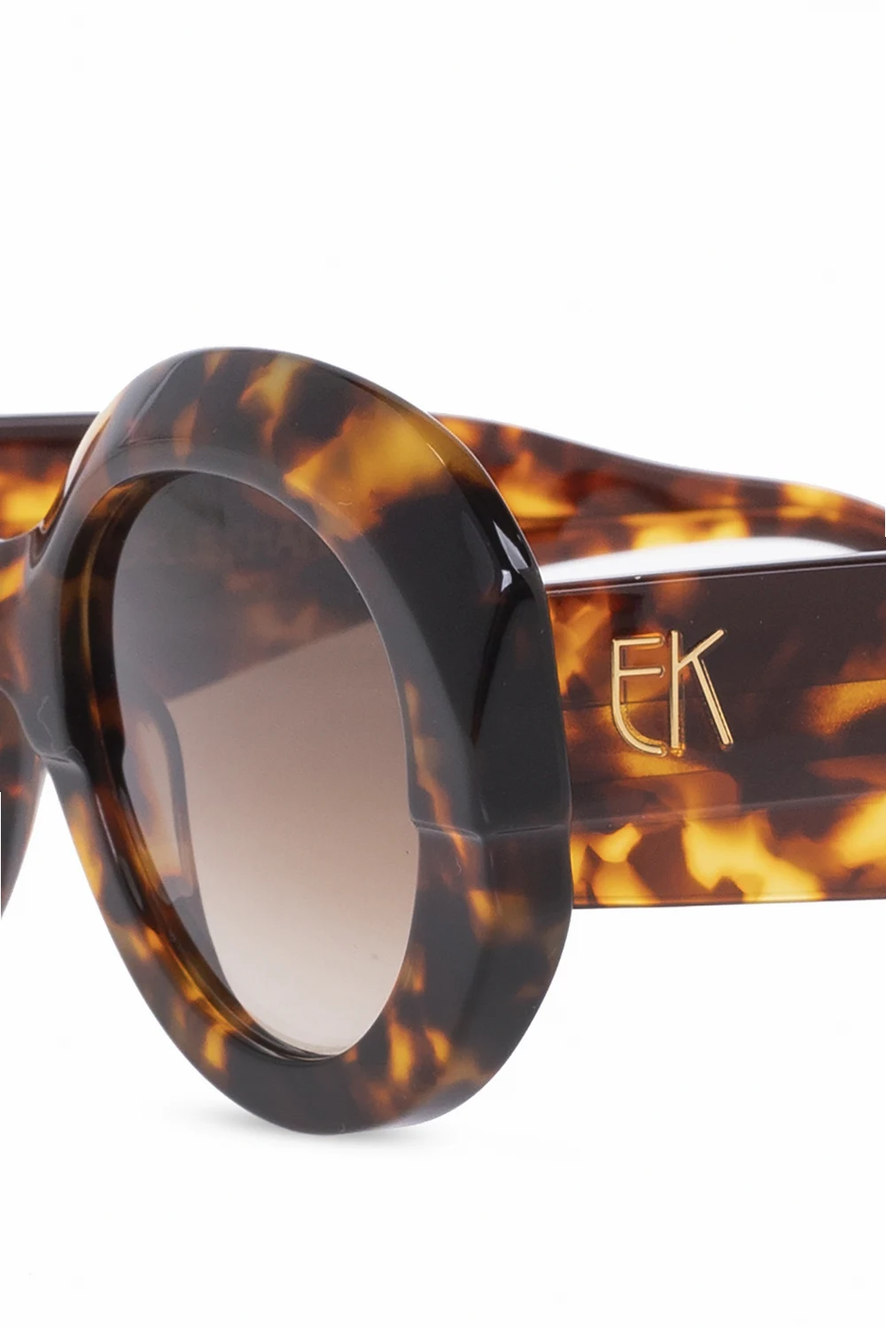 Brązowo-beżowe okulary przeciwsłoneczne Emmanuelle Khanh. Ozdobione logo w kolorze złotym. Brązowe, gradientowe, certyfikowane soczewki UVA/UVB. Dołączone etui z logo, zamykane na zatrzask.