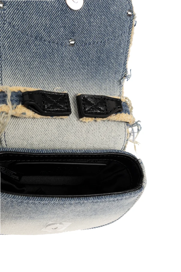 Krótka, denimu rączka z frędzlami podkreśla niebanalny, luksusowy charakter akcesorium, natomiast duża, owalna klamra wysadzana kryształkami stanowi niepowtarzalny akcent całej kolekcji. Wygodne mocowania umożliwiają przypięcie długiego, czarnego paska ze skóry, co pozwala na dowolność stylizacji i pełną funkcjonalność.