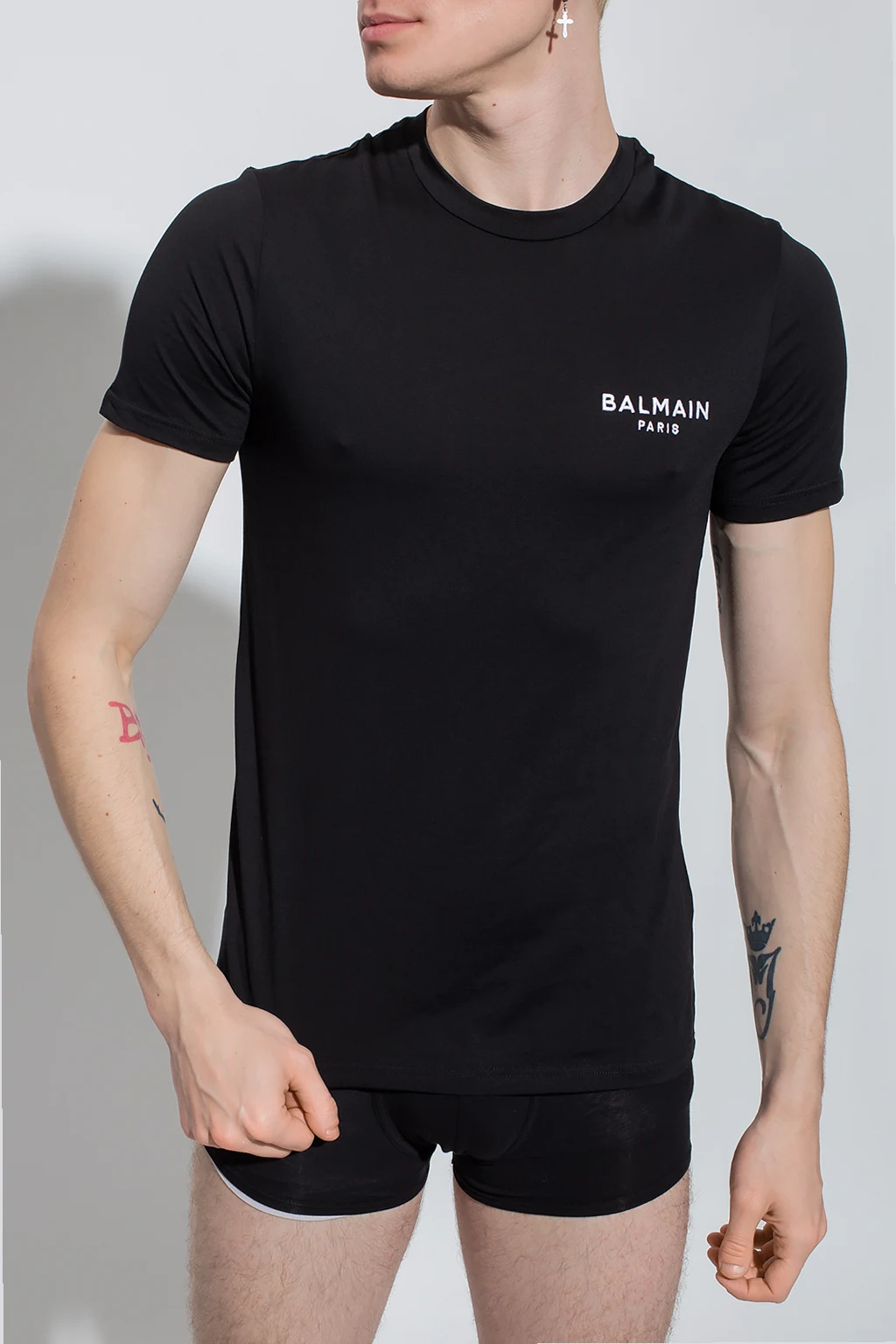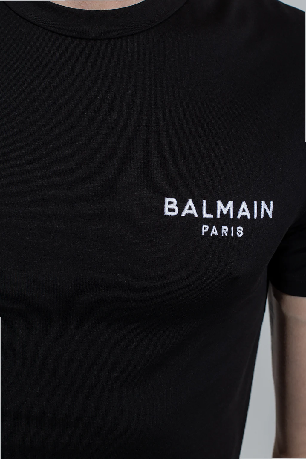 Czarny t-shirt Balmain. Wykonany z bawełny. Z przodu wyszyte logo w kolorze białym. Okrągły dekolt. Krótkie rękawy.