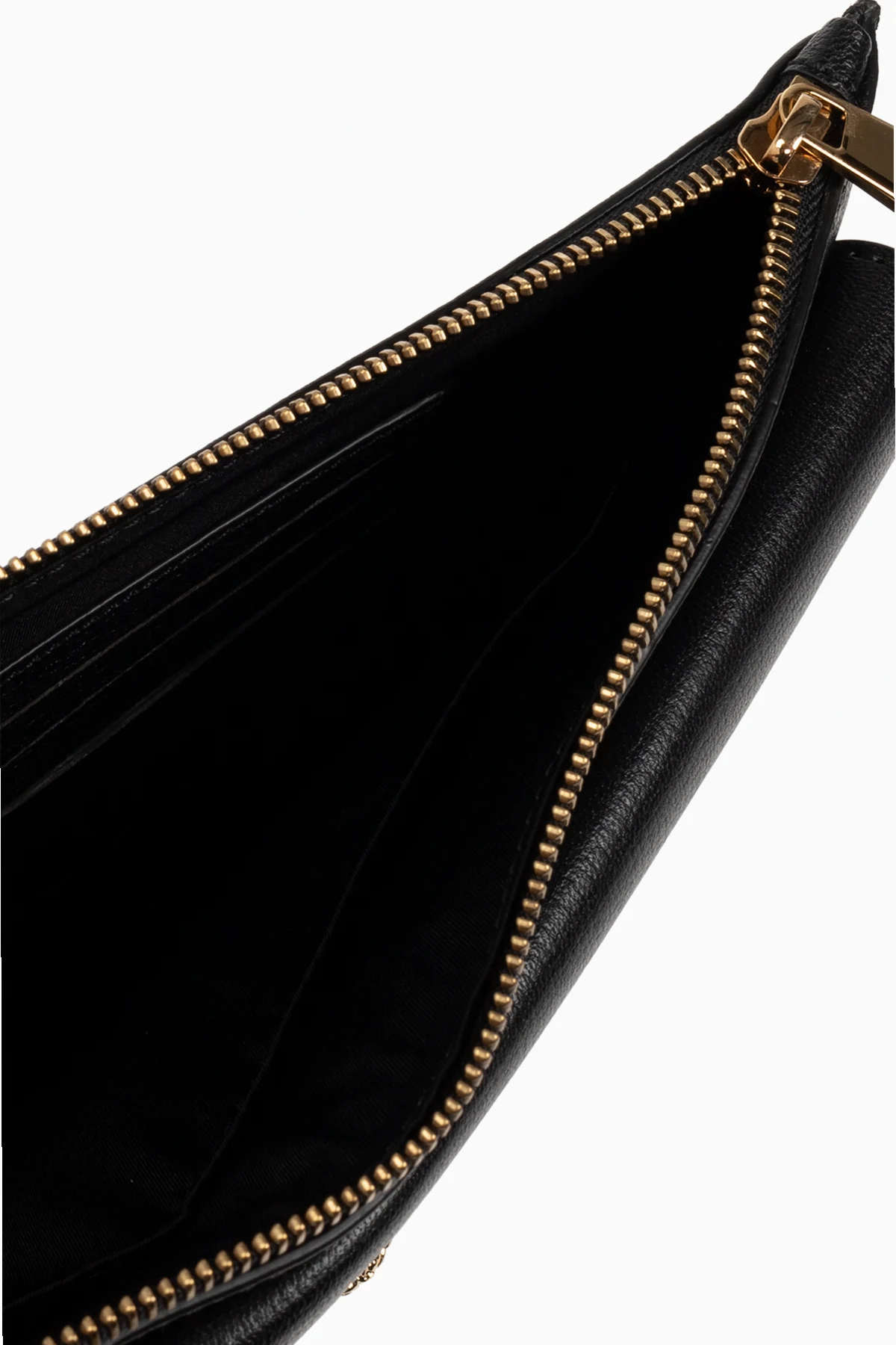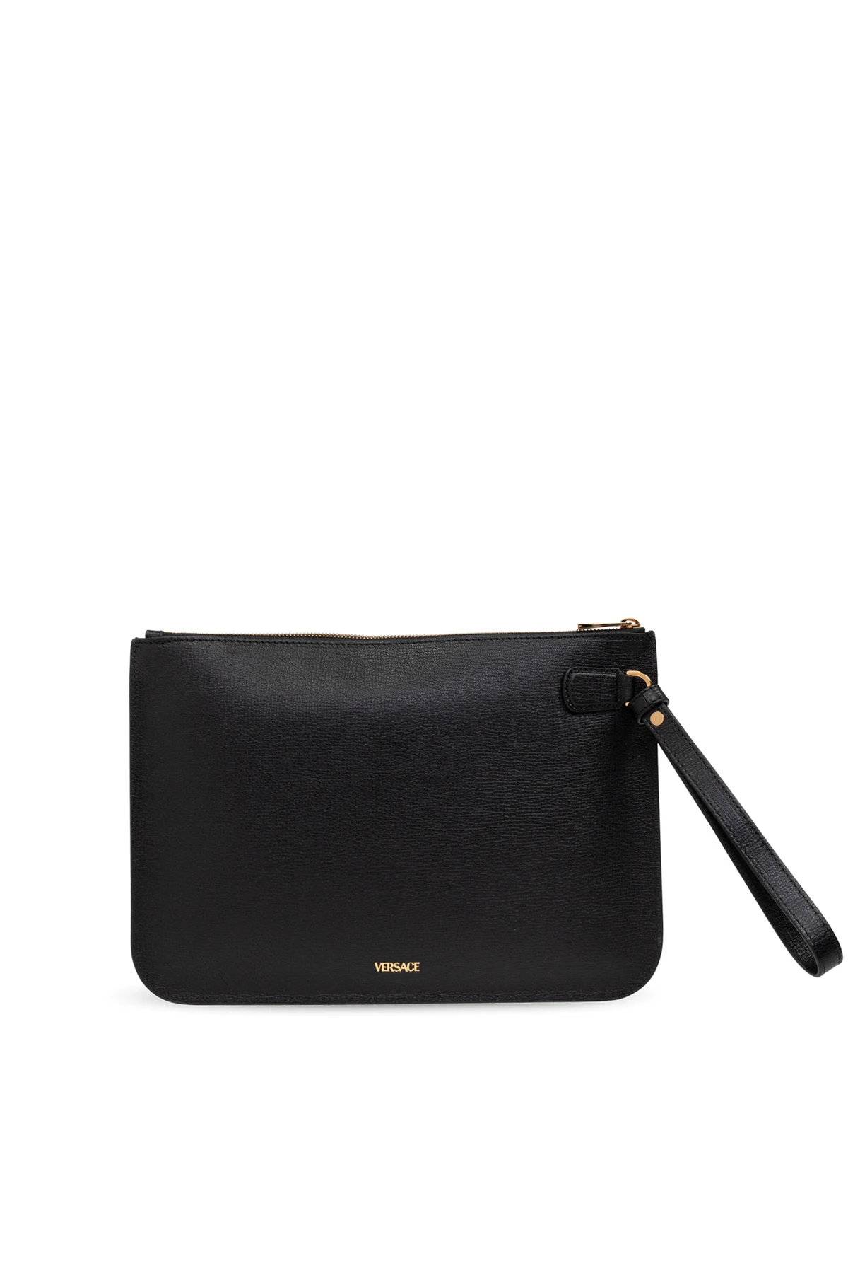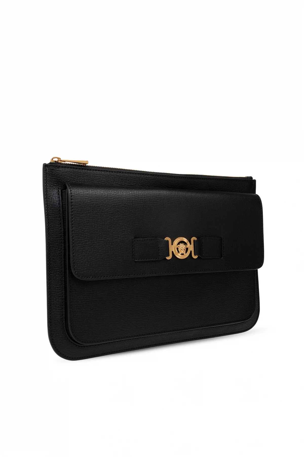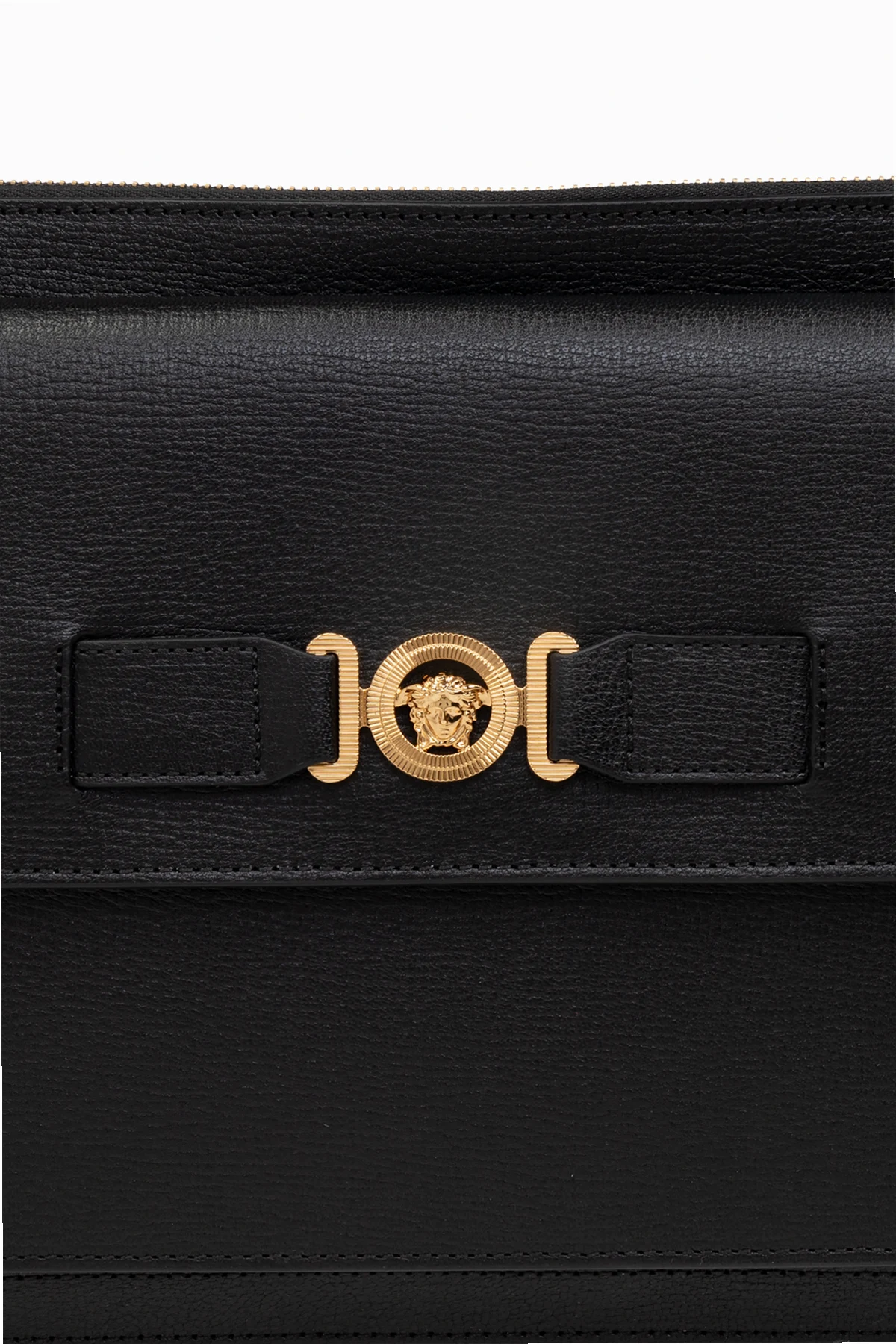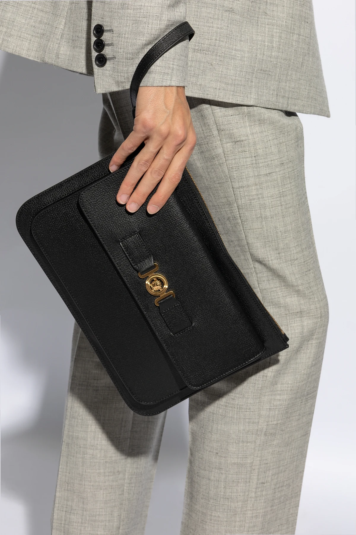 Zachwycająca w swej prostocie, a zarazem emanująca wyrafinowanym gustem skórzana aktówka od renomowanego projektanta Versace , jest kwintesencją elegancji połączonej z funkcjonalnością. Majestatyczny czarny kolor skóry licowej, z subtelnym ziarnem nadającym teksturę, tworzy harmonijne tło dla charakterystycznego, złotego logo marki. Dwa splecione ze sobą litery stanowią nie tylko sygnaturę projektanta, ale także element, który przyciąga spojrzenia, nadając akcesorium niepowtarzalnego charakteru.