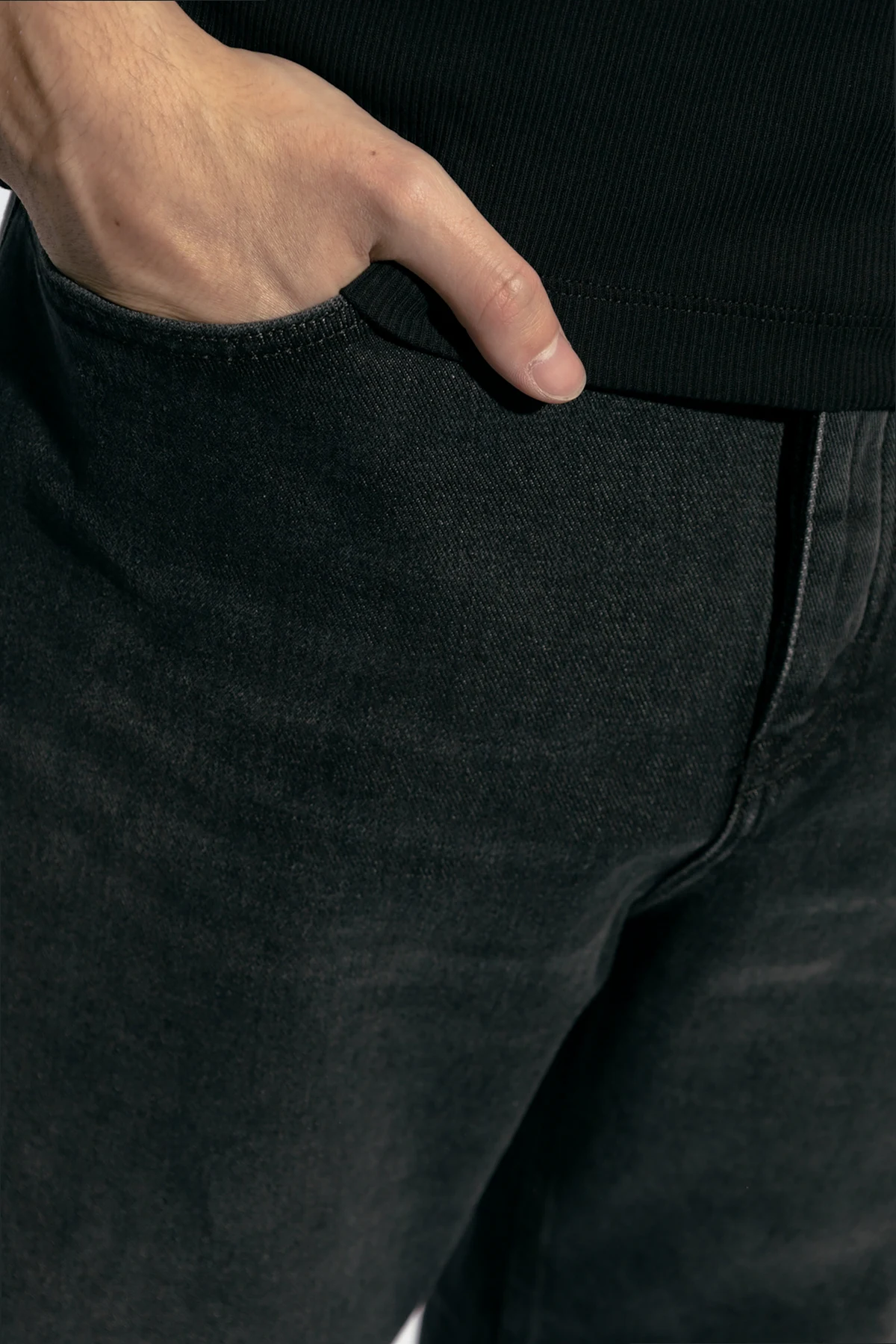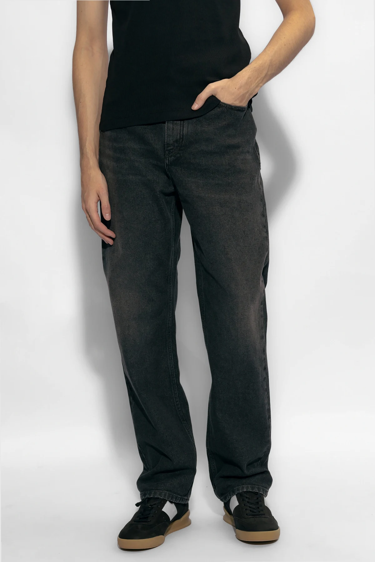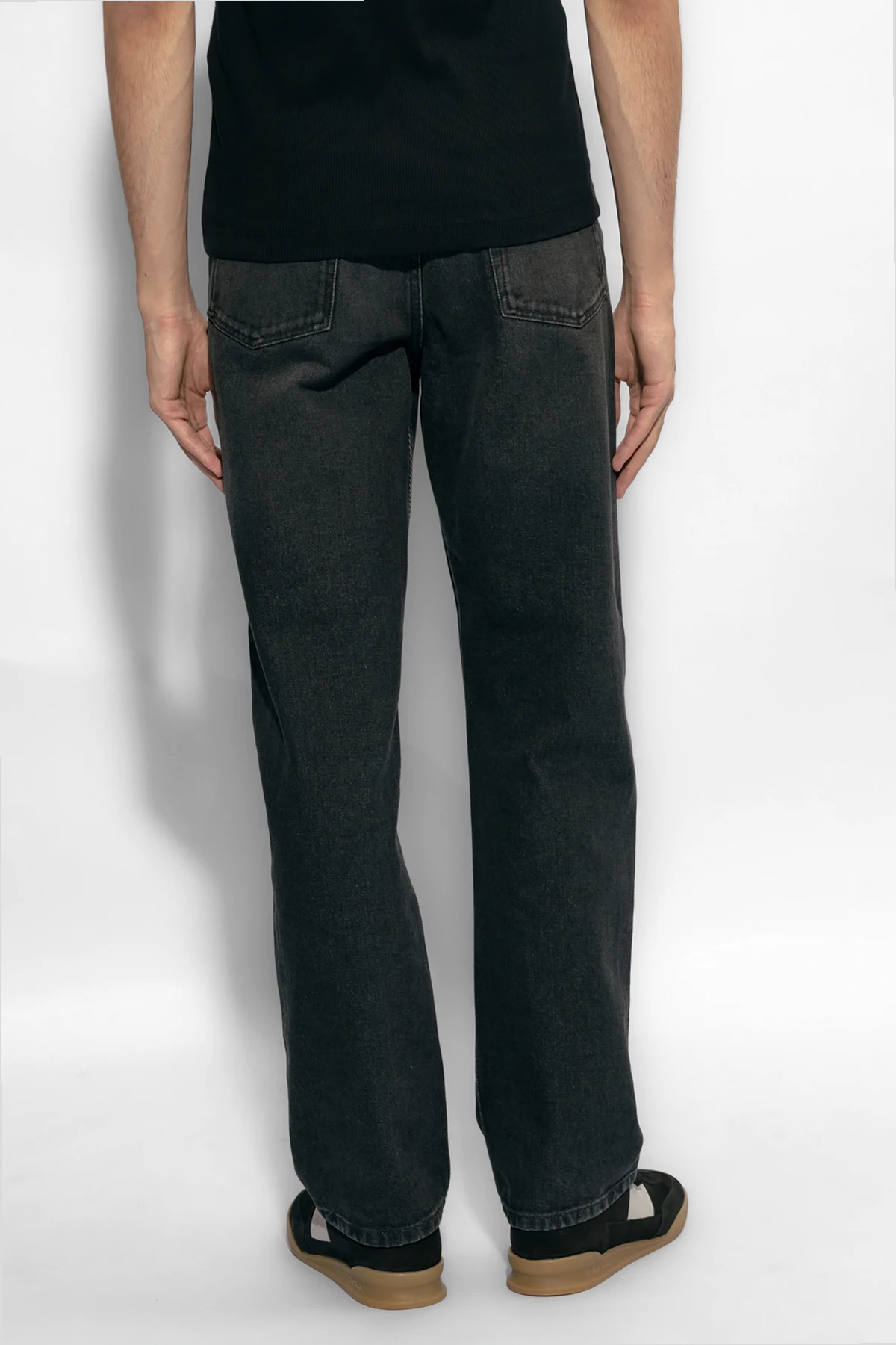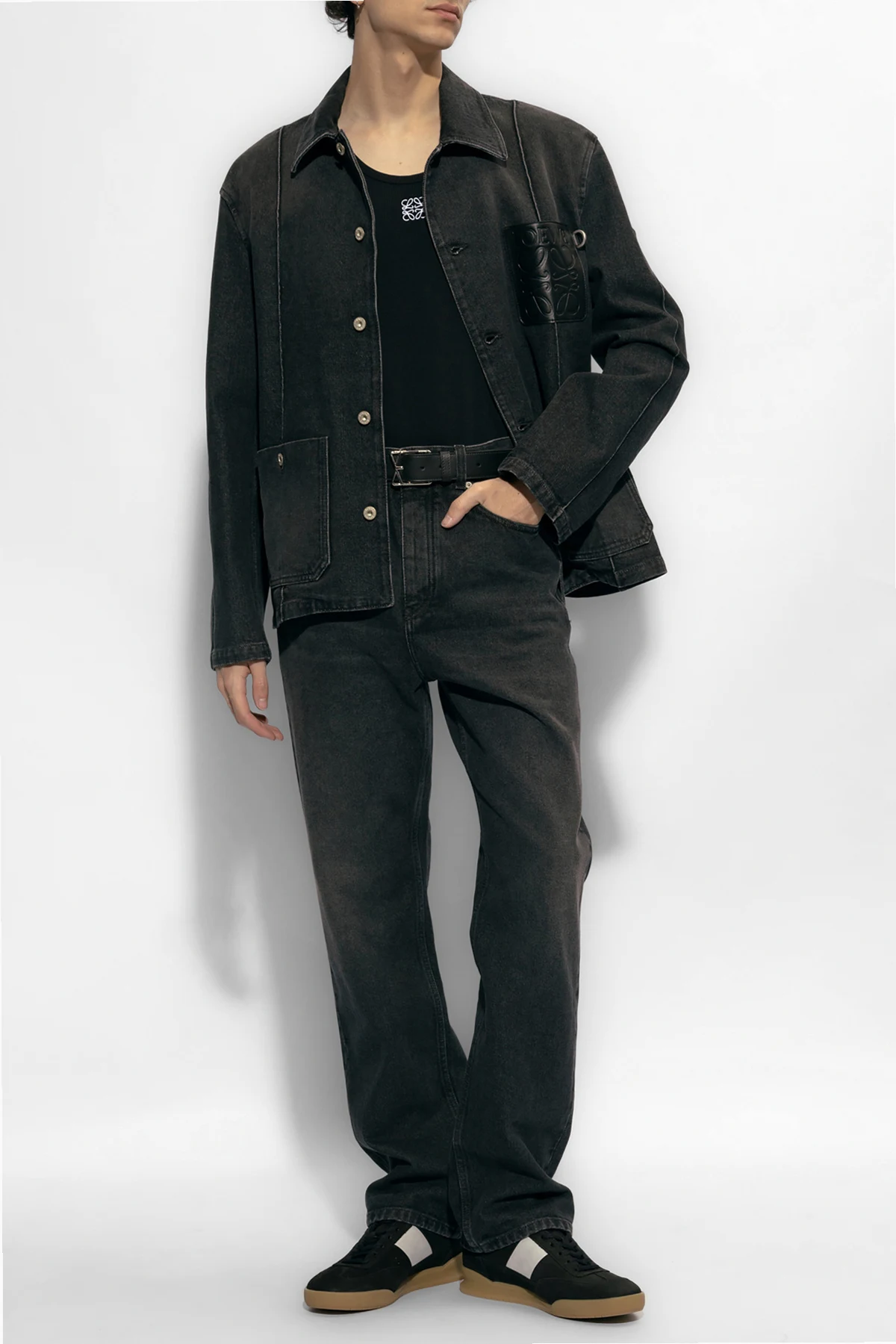 Czarne jeansy Loewe. Wykonane z bawełny. Zapinane na guziki. Z tyłu czarna naszywka z wytłoczonym logo. Pięć kieszeni wsuwanych. Proste nogawki.