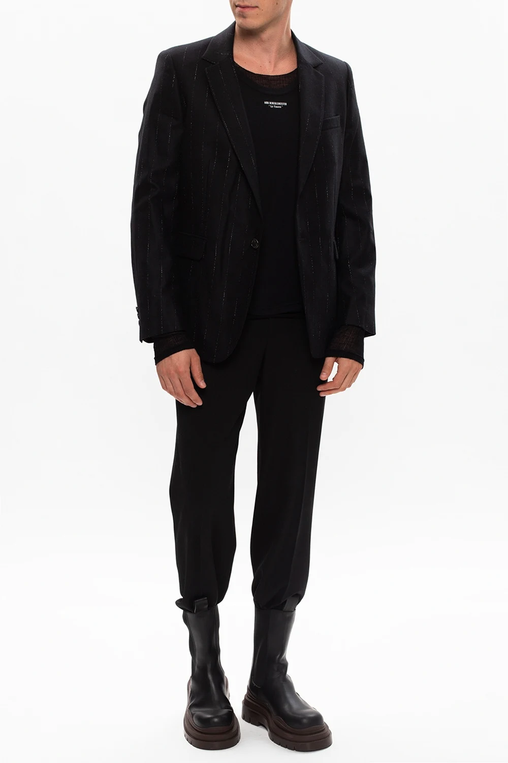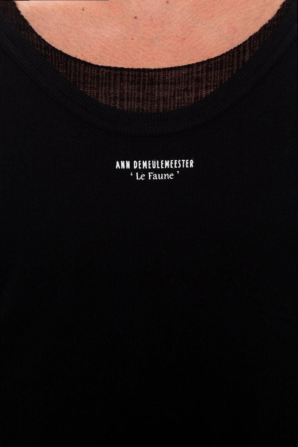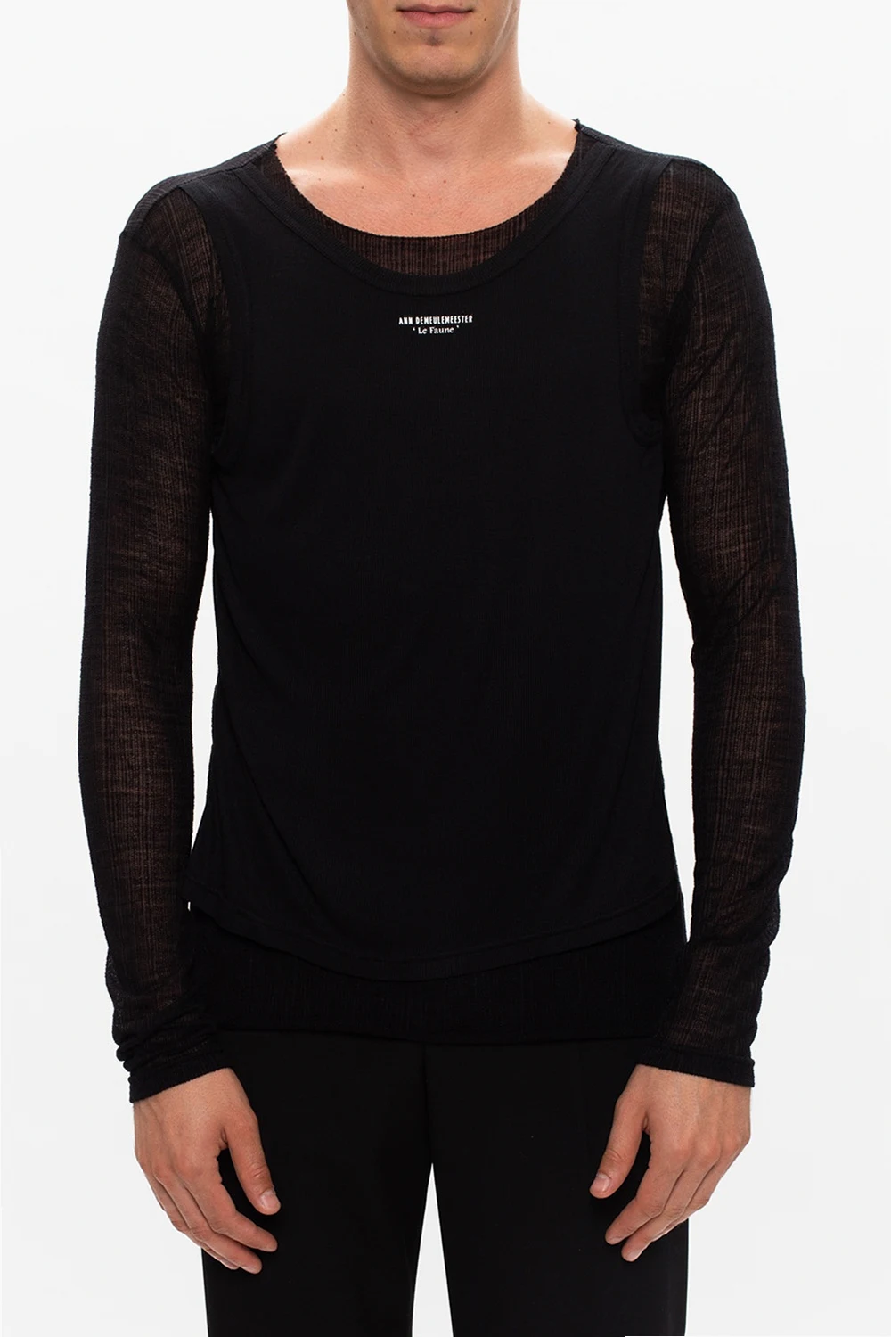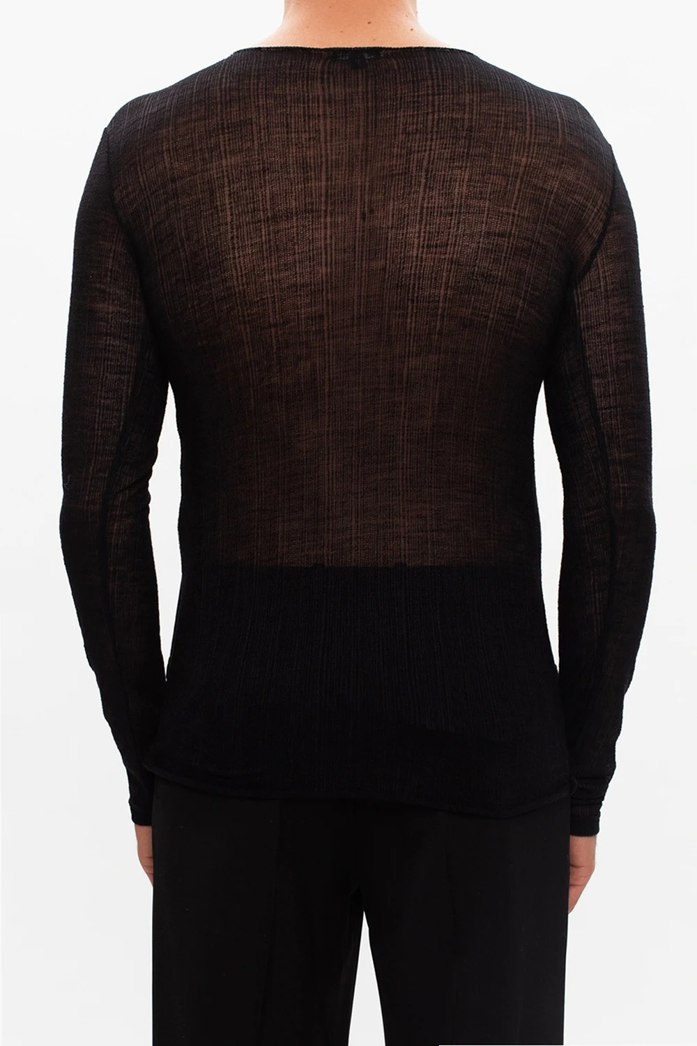 Czarny, transparentny, asymetryczny t-shirt z długimi rękawami Ann Demeulemeester. Okrągły dekolt.
