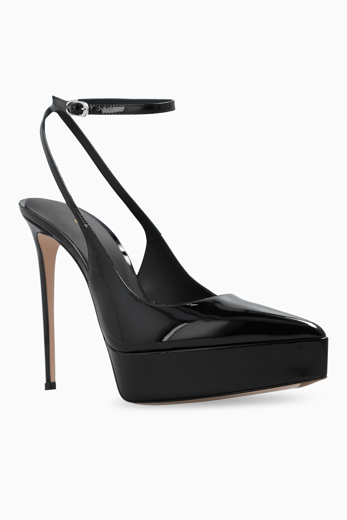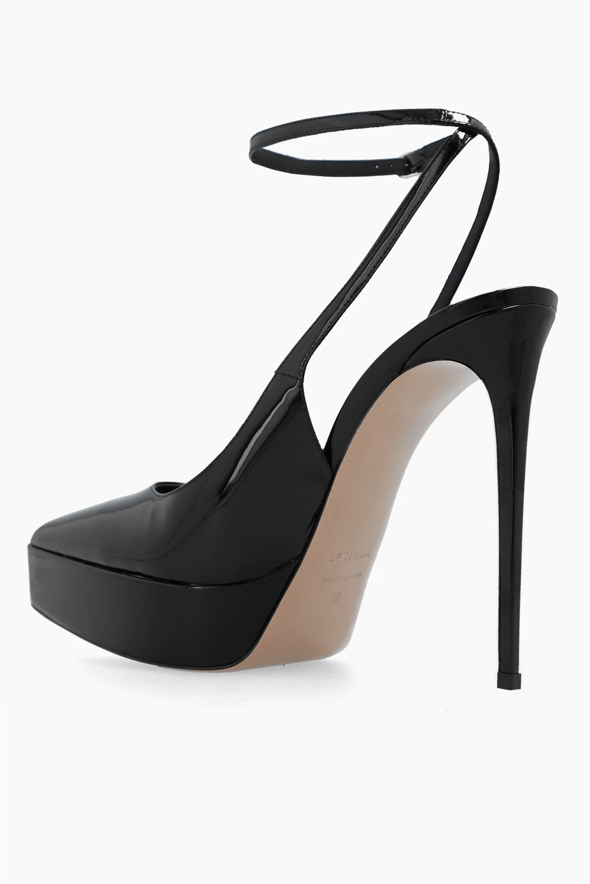 Czarne buty na obcasie, model ‘Chanel’ Le Silla. Wykonane z lakierowanej skóry. Zapinane wokół kostki na pasek z klamrą. Nosek w szpic. Podeszwa w kolorze jasnobeżowym wykonana ze skóry wykończonej gumą.
