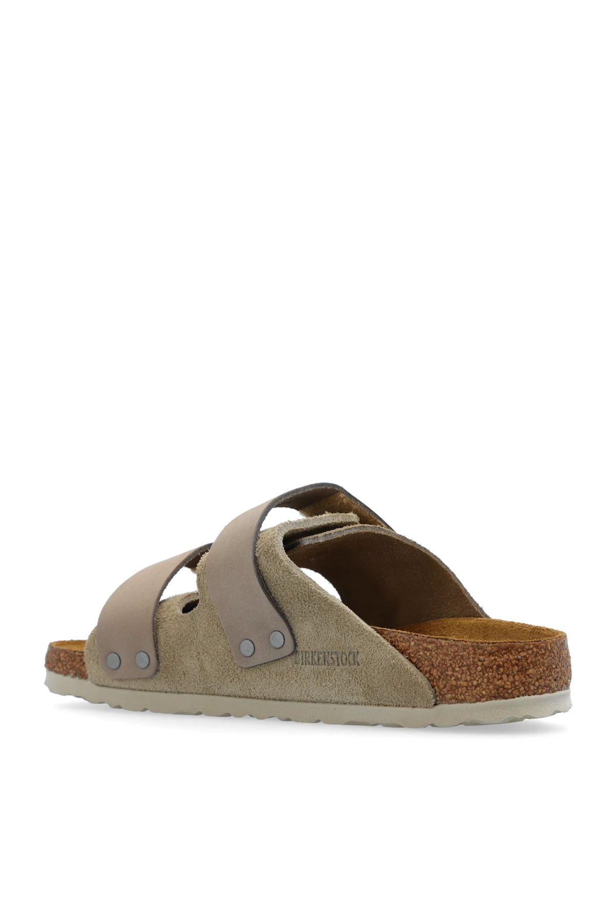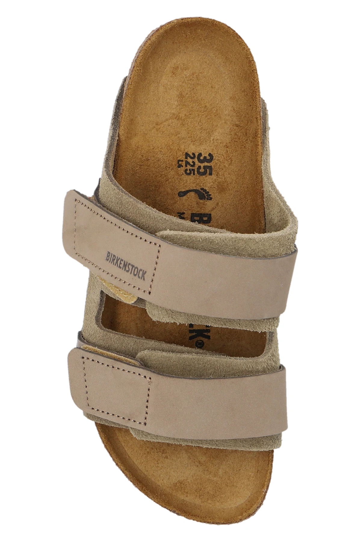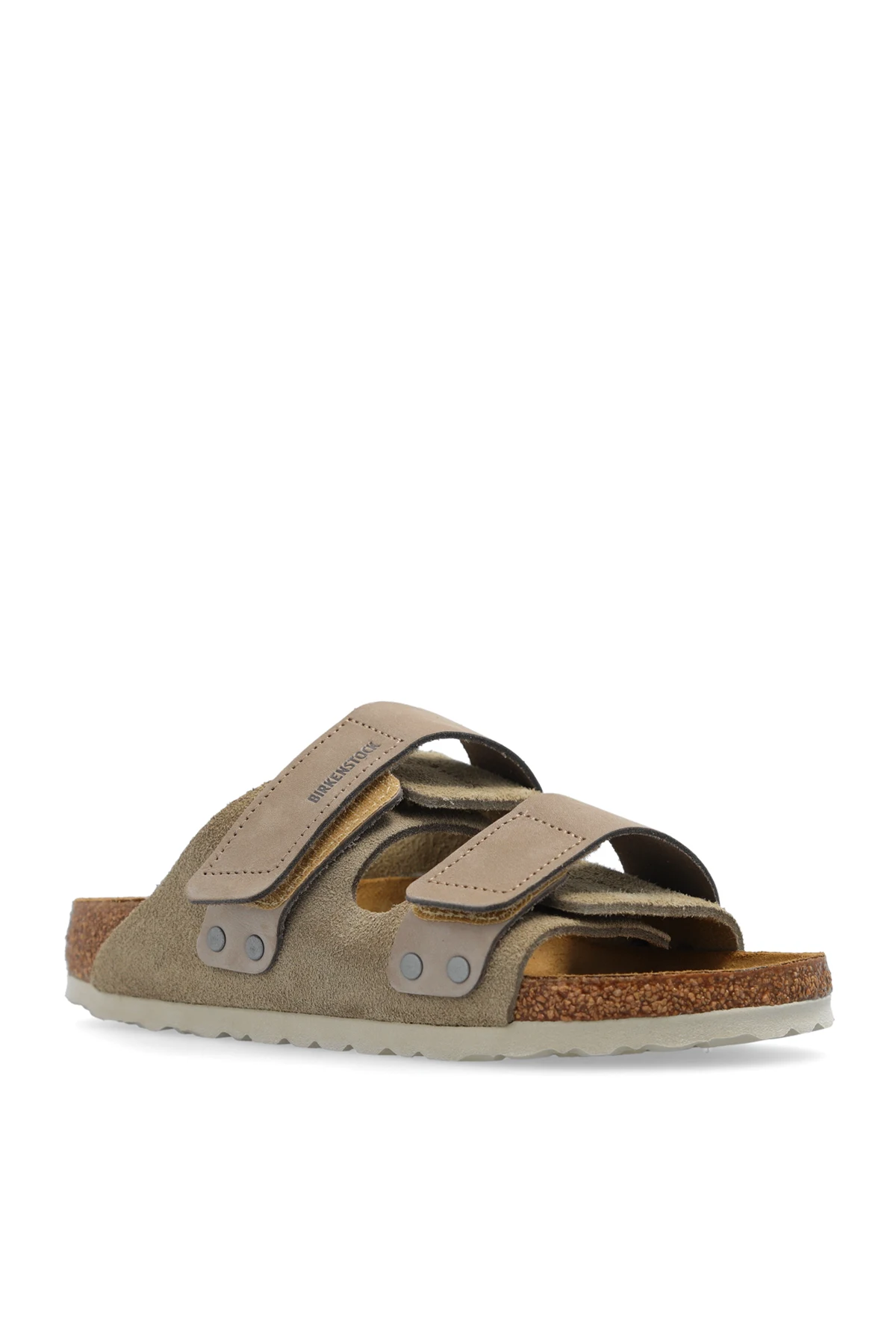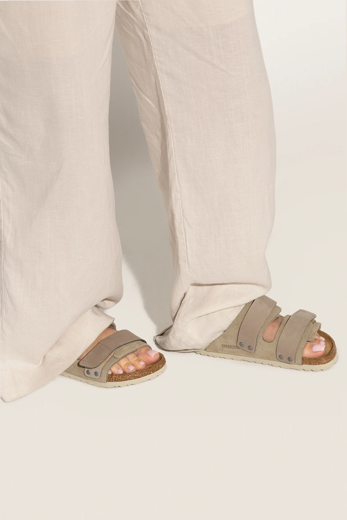 Beżowoszare klapki, model ‘Uji’ Birkenstock. Cholewka o zwężanej szerokości wykonana z zamszu i nubuku. Zapinane na paski z rzepem. Ozdobione wytłoczonym logo. Anatomicznie ukształtowana wkładka korkowo-lateksowa. Szara podeszwa wykonana z pianki EVA.