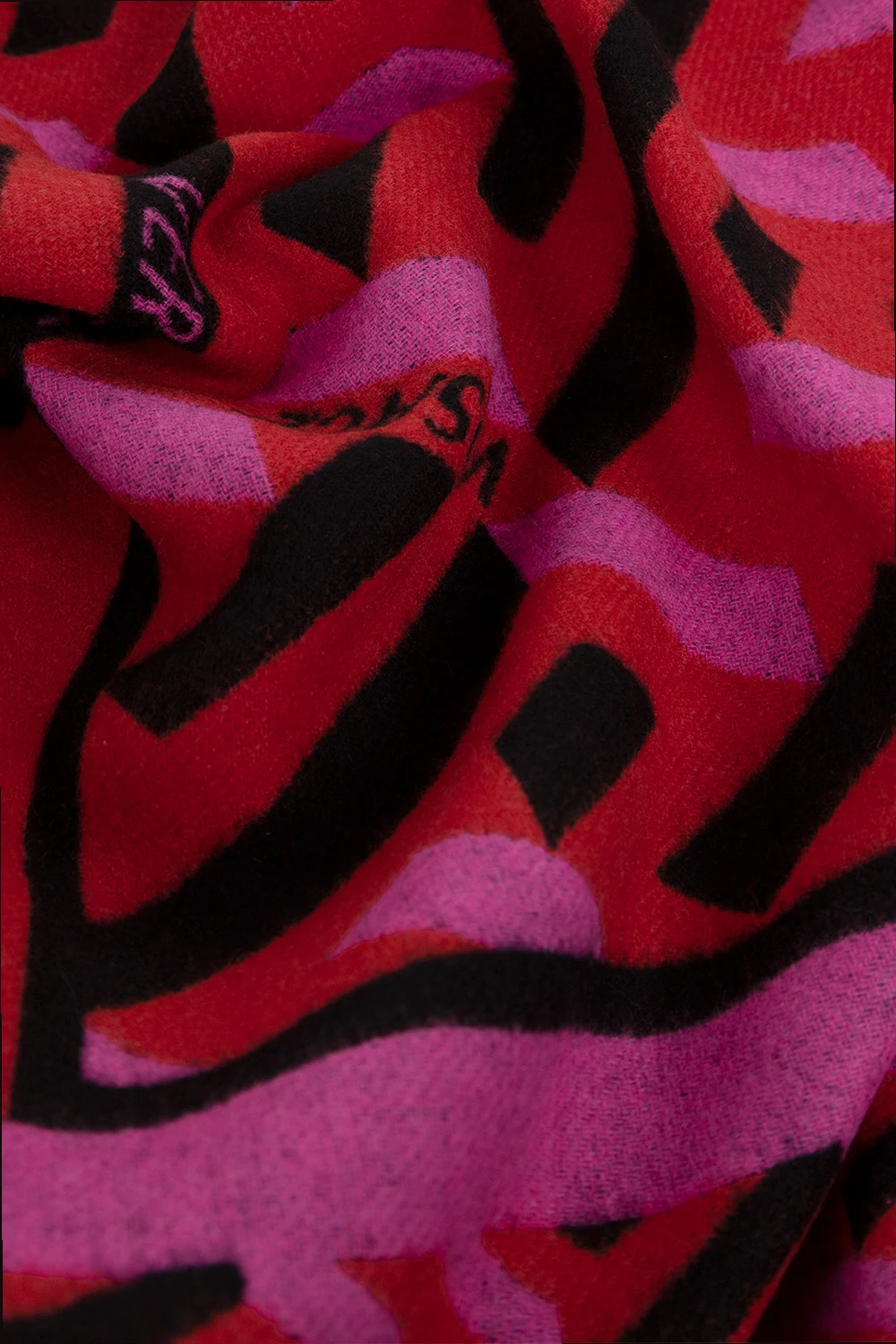 Czerwono-czarno-różowy koc Versace Home. Wykonany z wełny z domieszką kaszmiru. Ozdobiony wzorem ‘La Greca’. Dwa brzegi zakończone frędzlami.