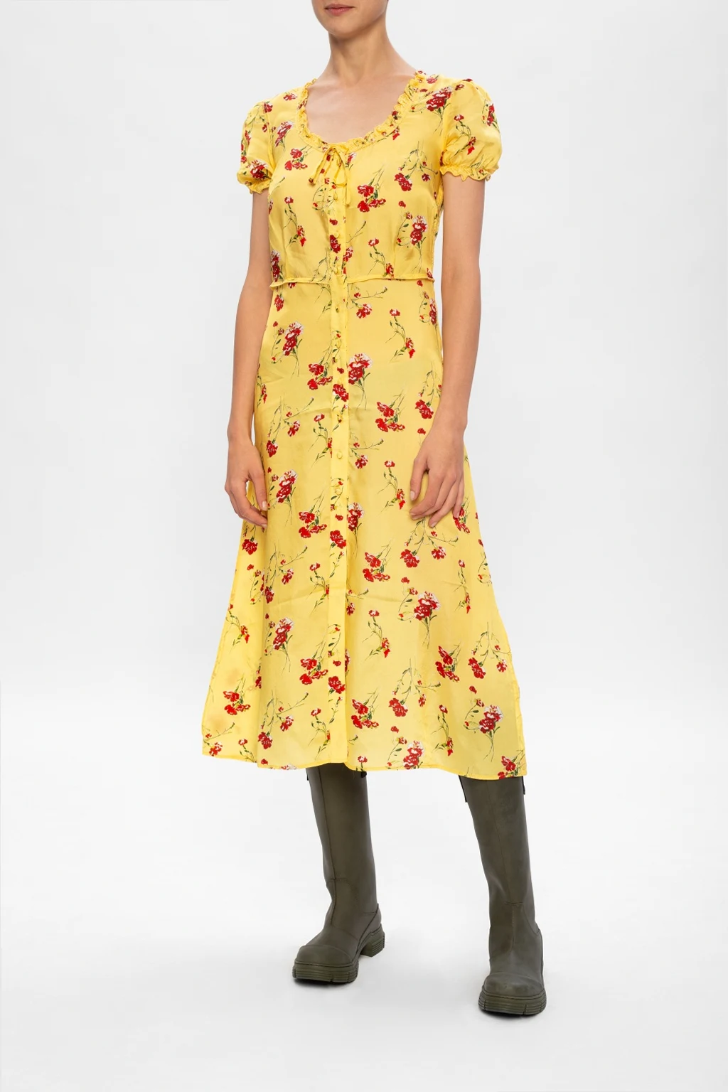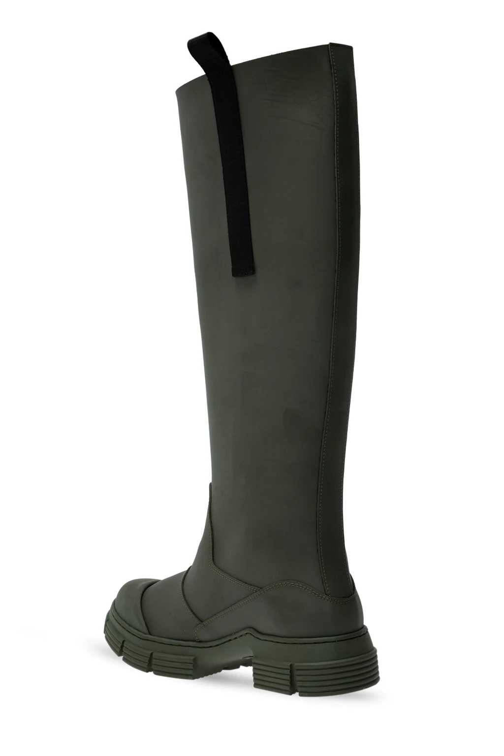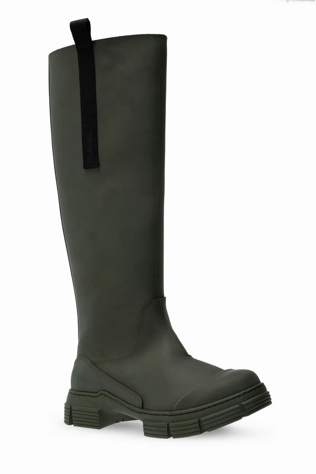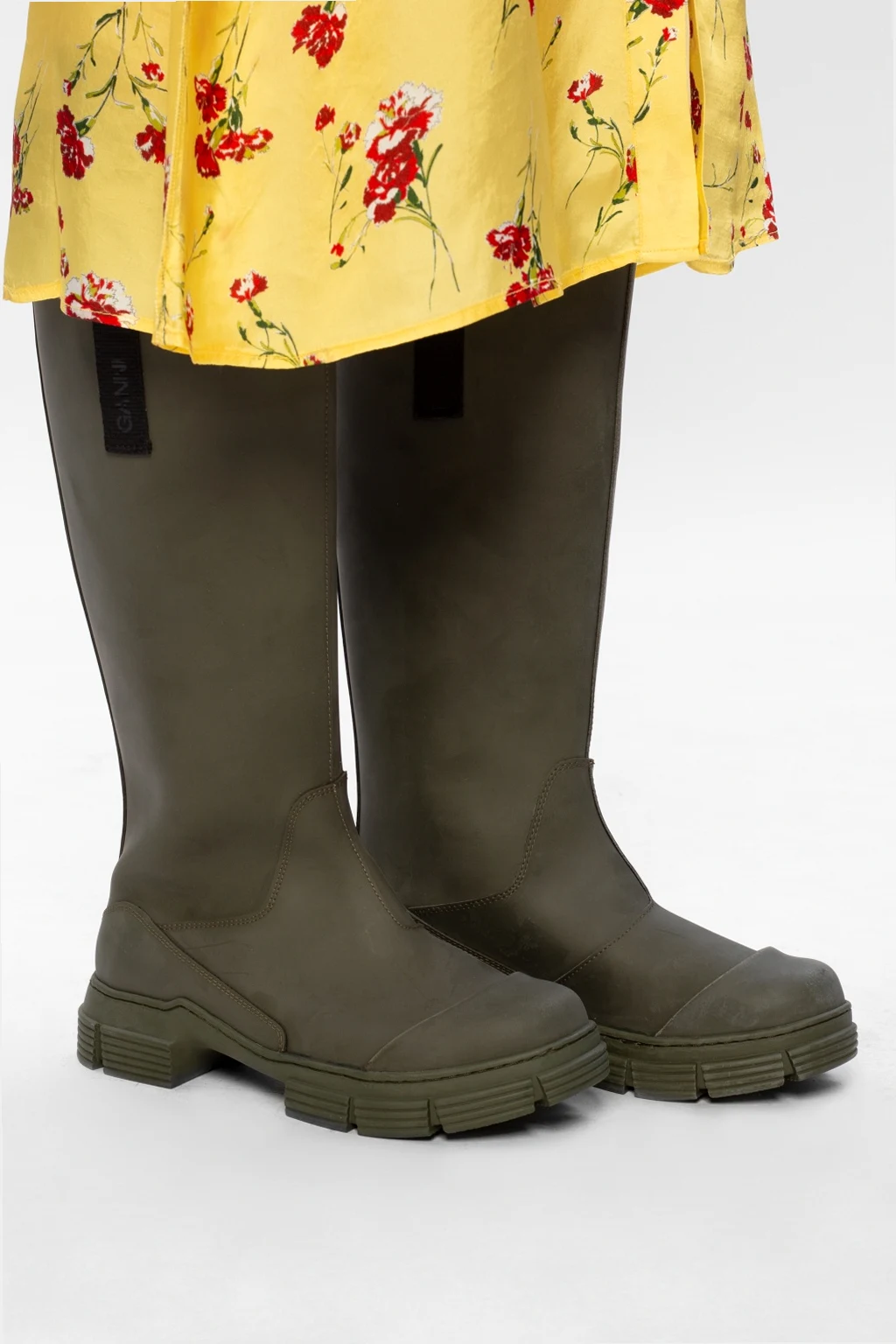 Zielone, gumowe kalosze Ganni. Po bokach czarne materiałowe wykończenie z nadrukowanym logo. Zielona, gumowa podeszwa.